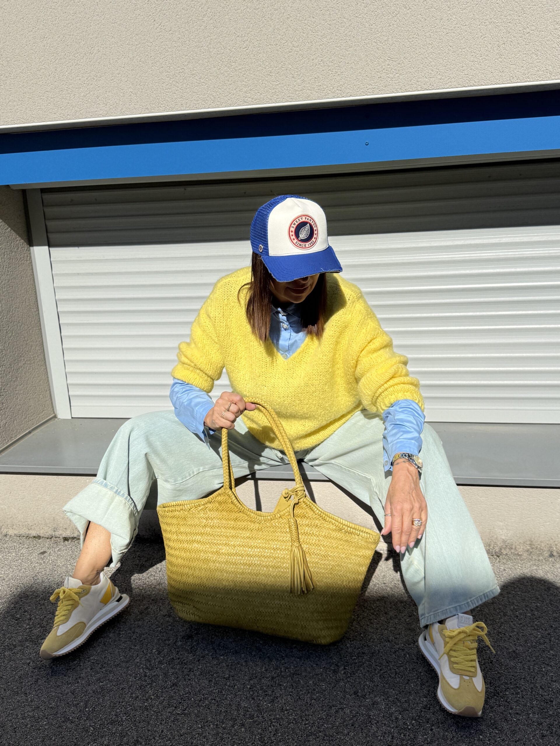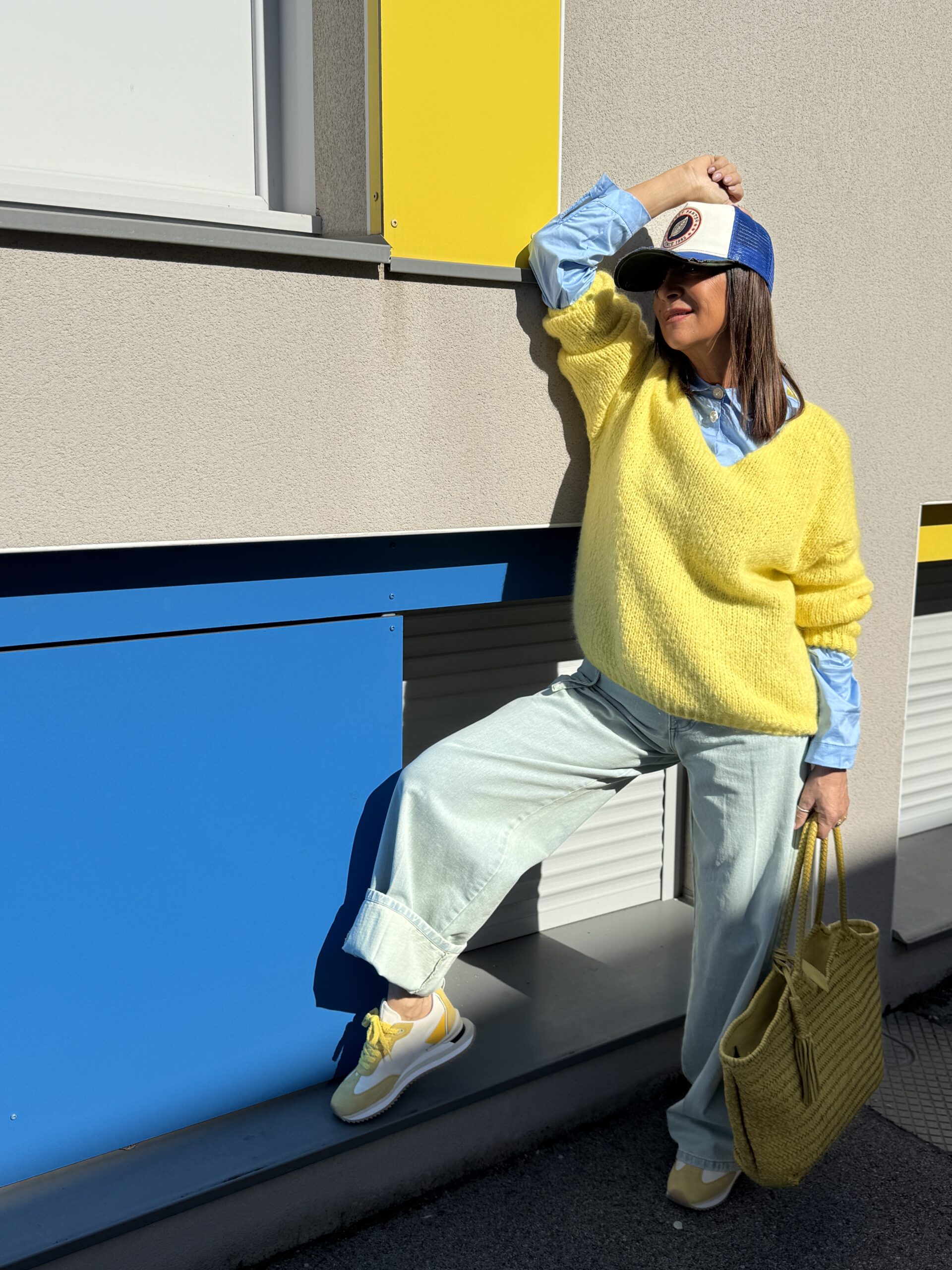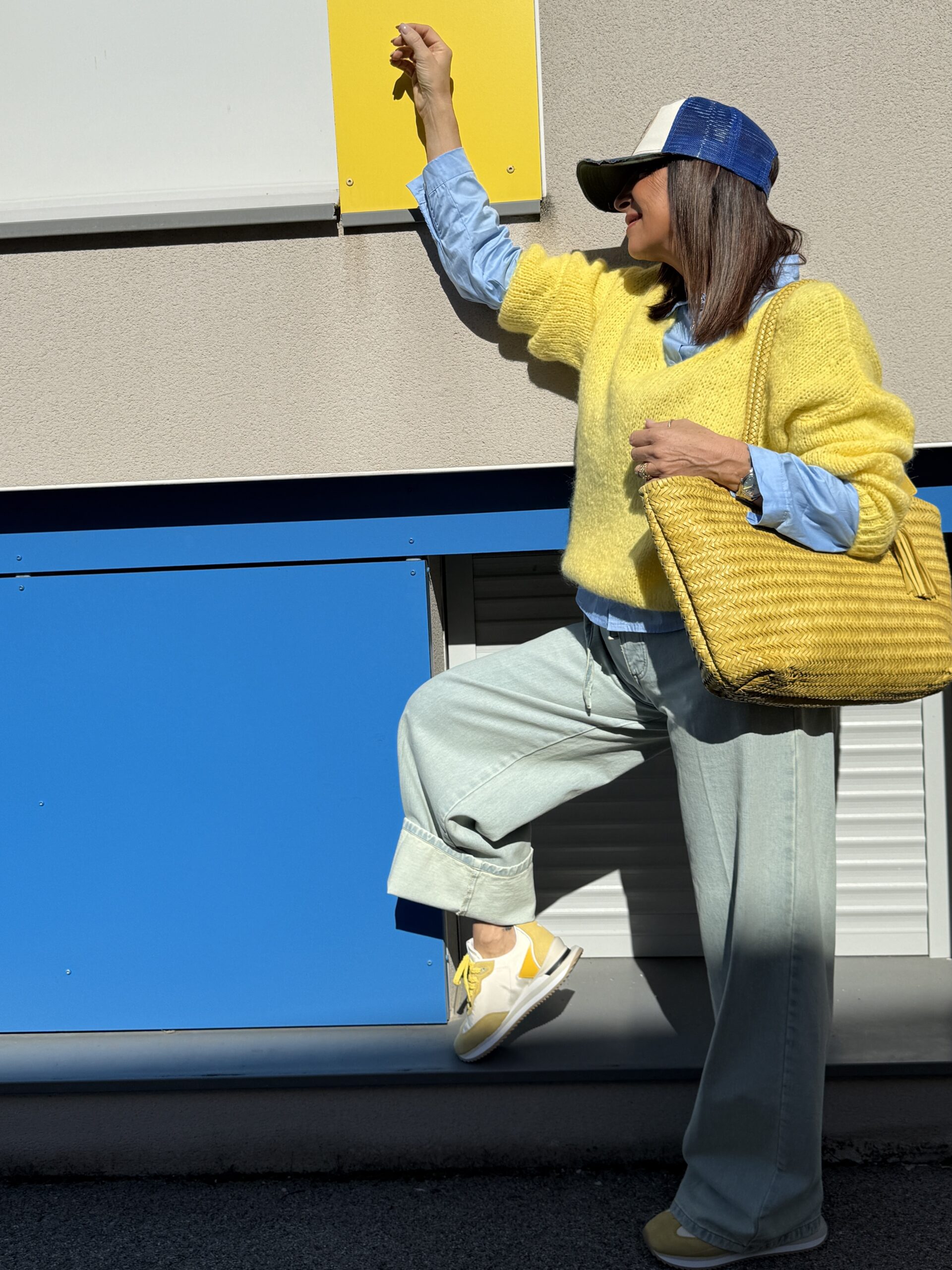 Le jaune vibrant apporte la lumière, tandis que le bleu pastel apporte vient adoucir l’ensemble pour un équilibre parfait.