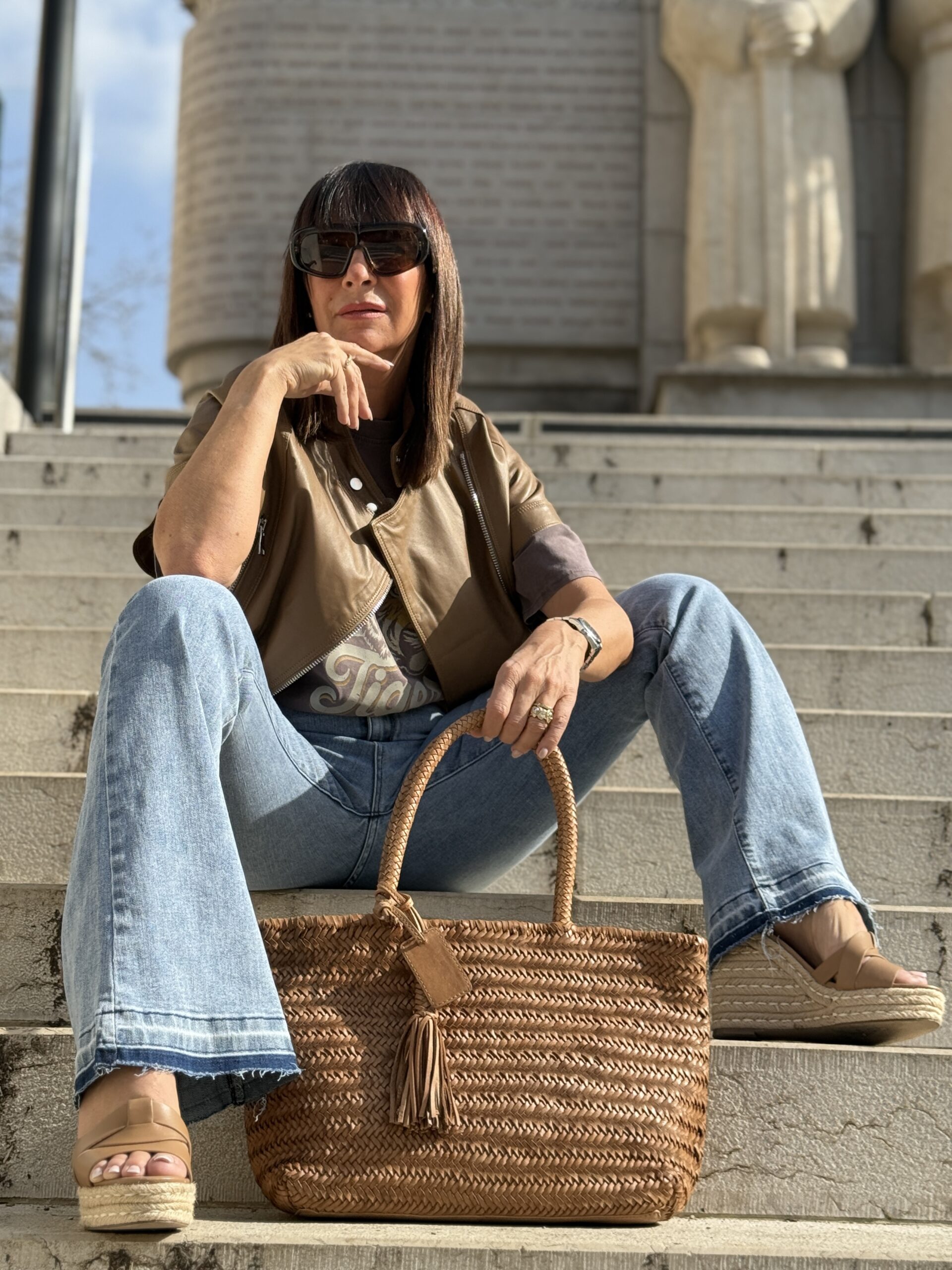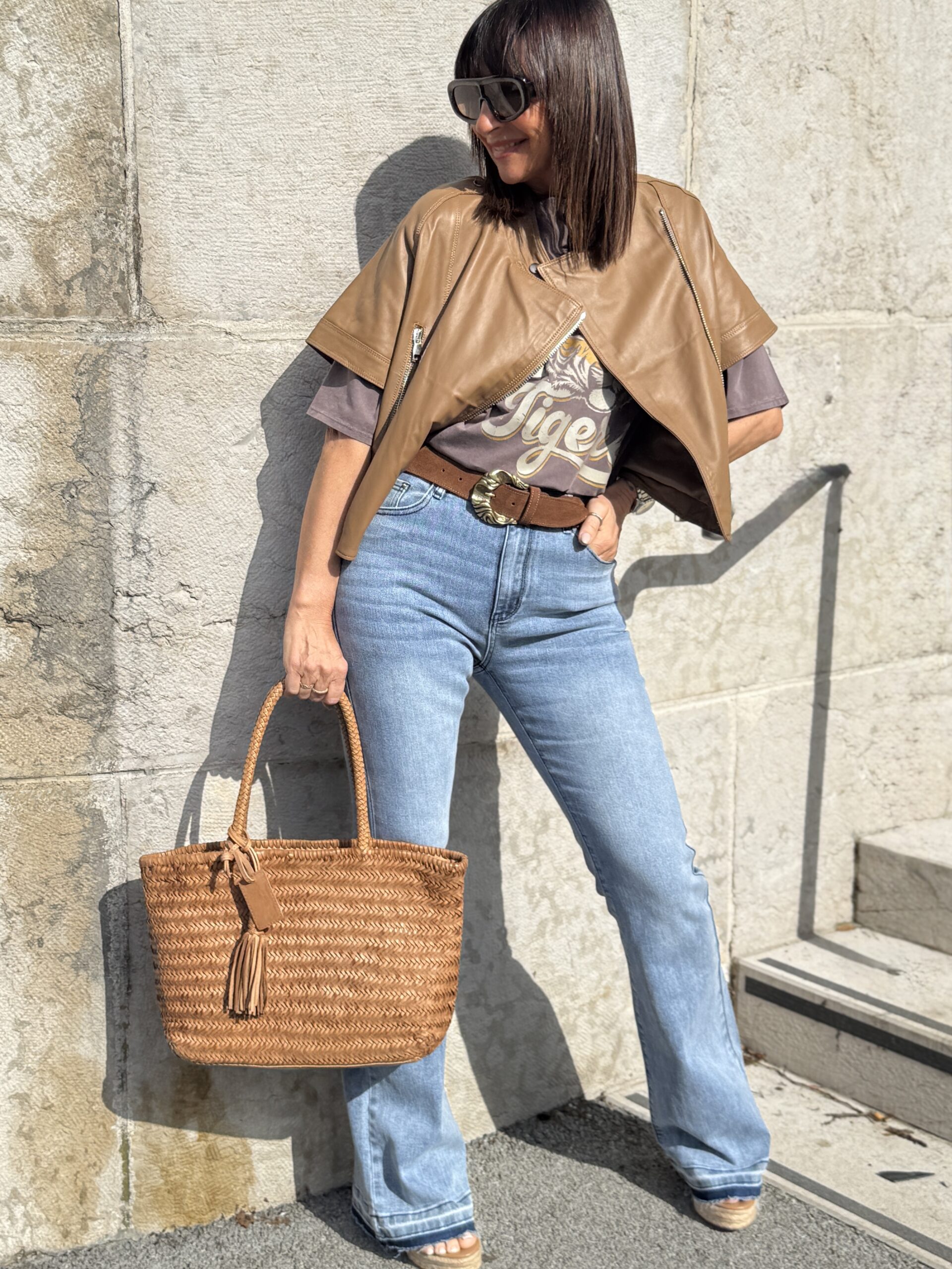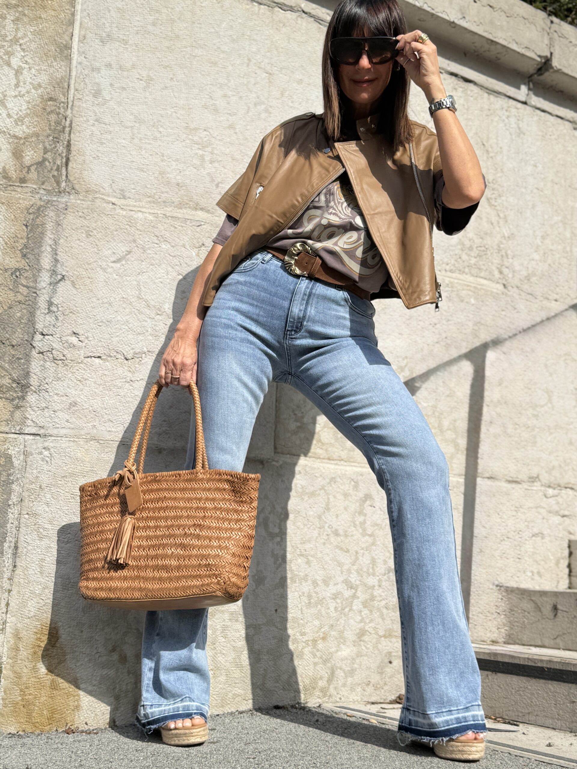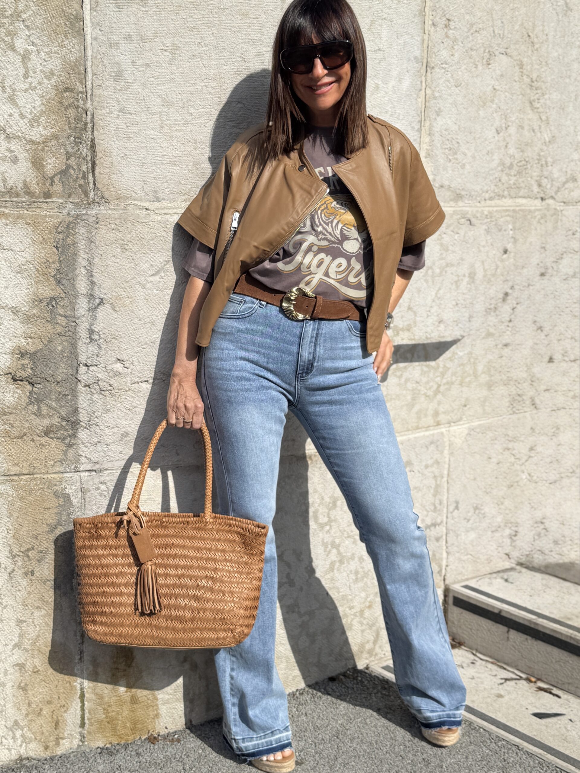 Le sac en cuir tressé et la ceinture western renforcent l’esprit naturel et authentique du look.
