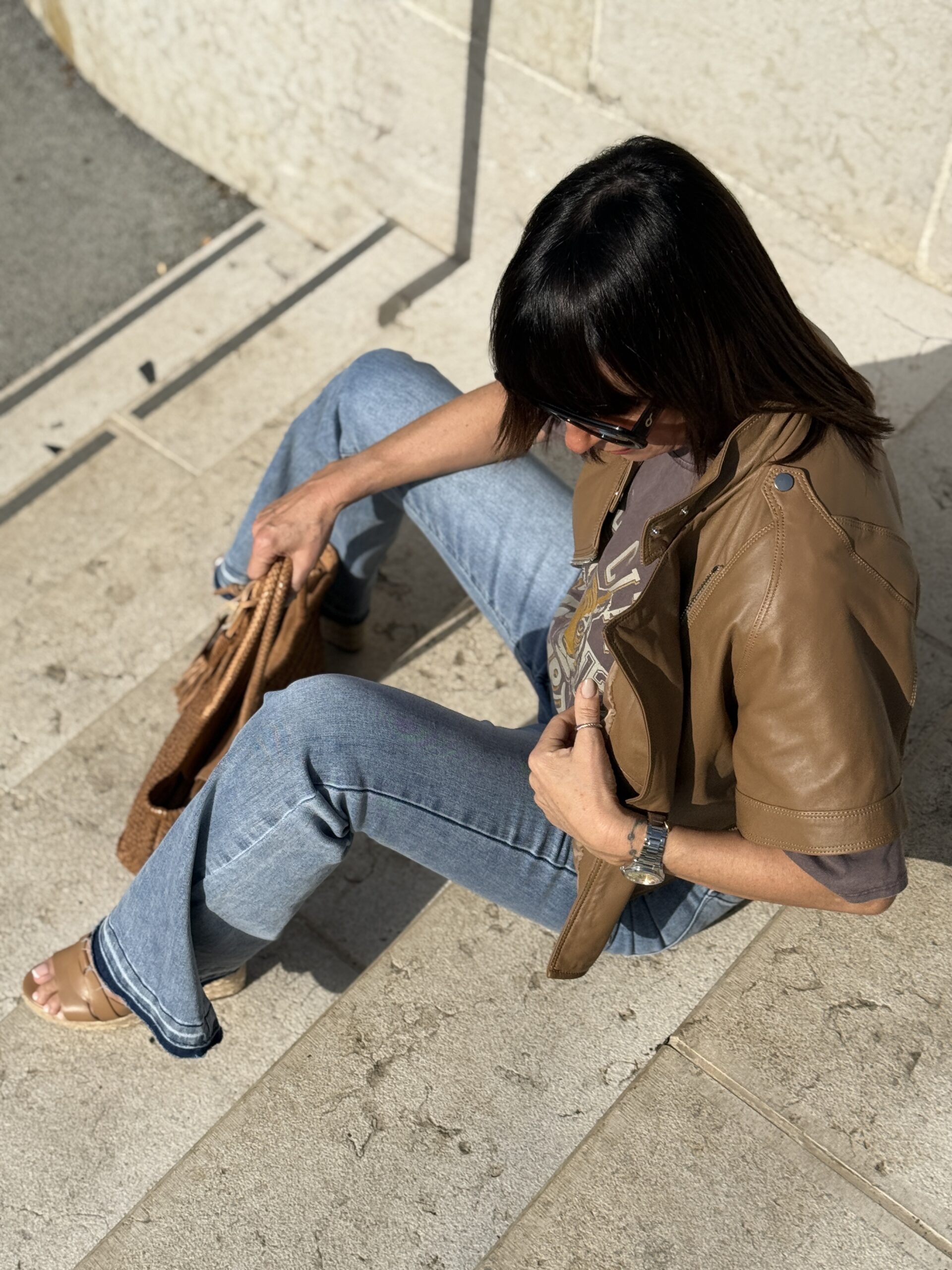 La veste courte en cuir camel structure la silhouette et réchauffe l’ensemble.