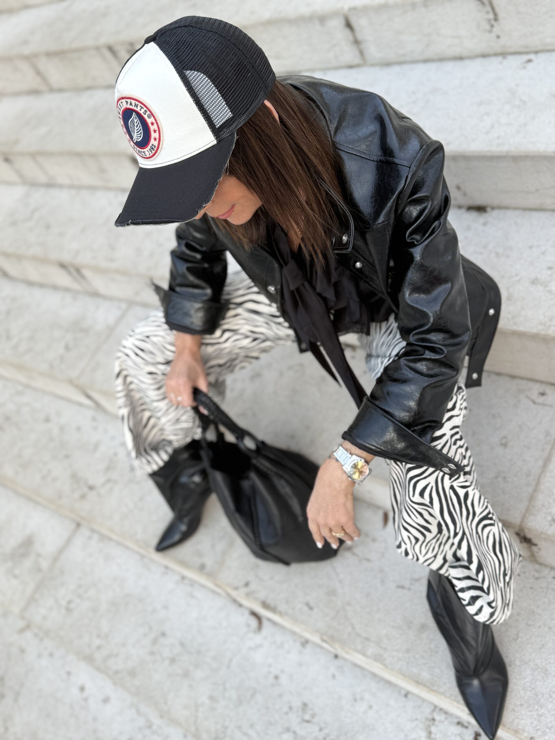 Le pantalon zébré capte immédiatement le regard et donne du caractère à la silhouette.