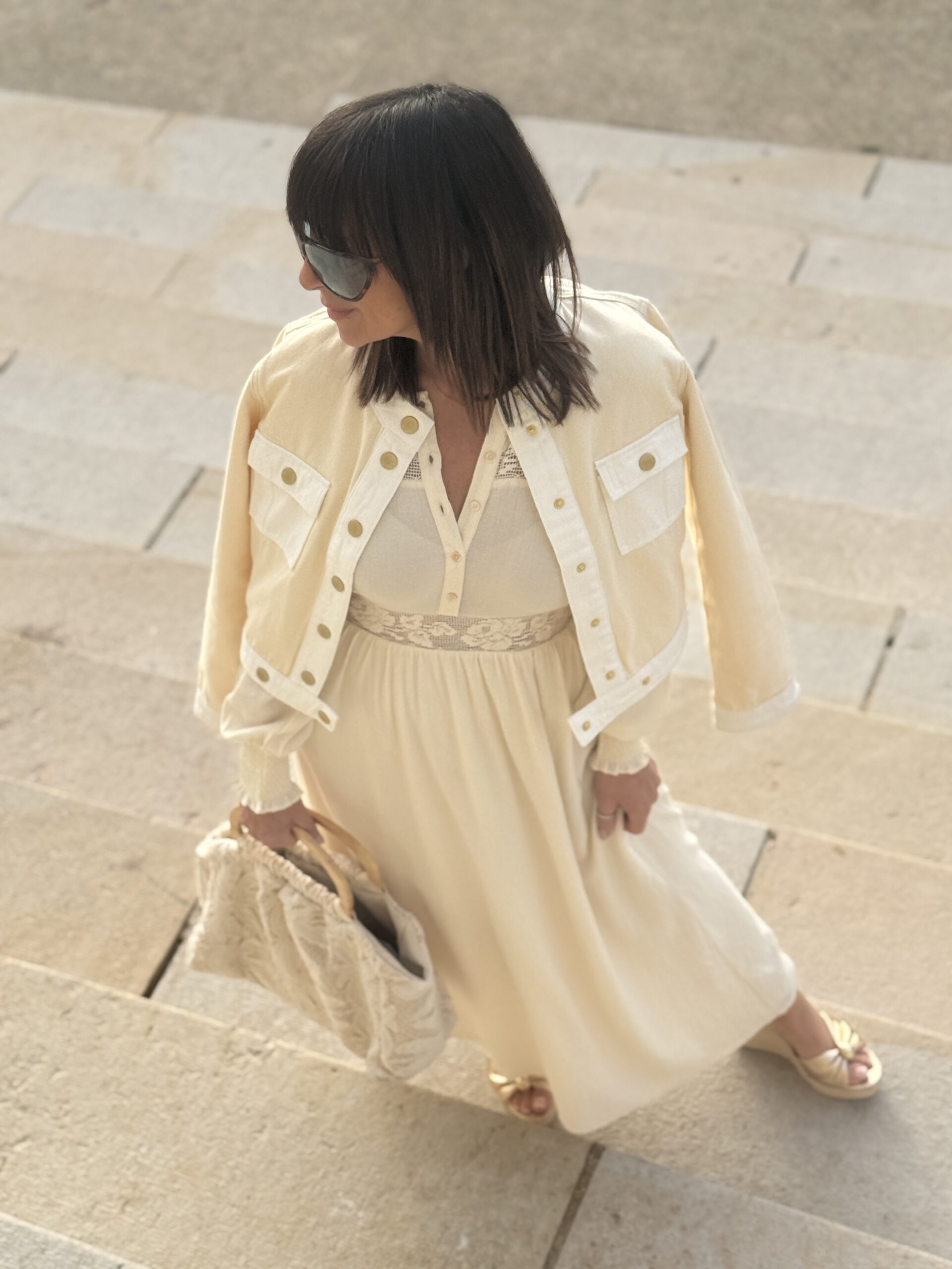 La veste clair posée sur les épaules, structure le look.