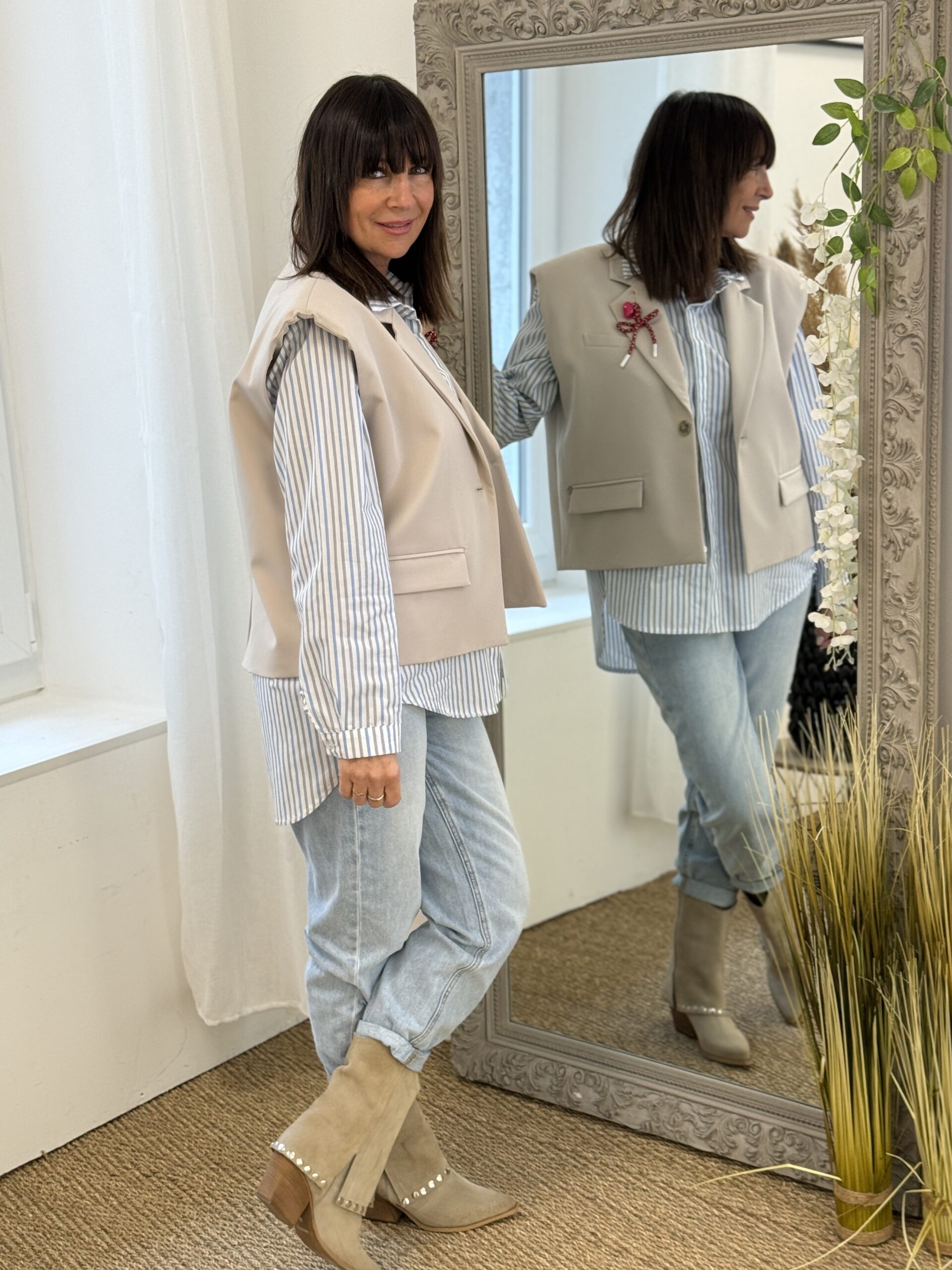 Le gilet structuré impose une allure nette et résolument contemporaine.