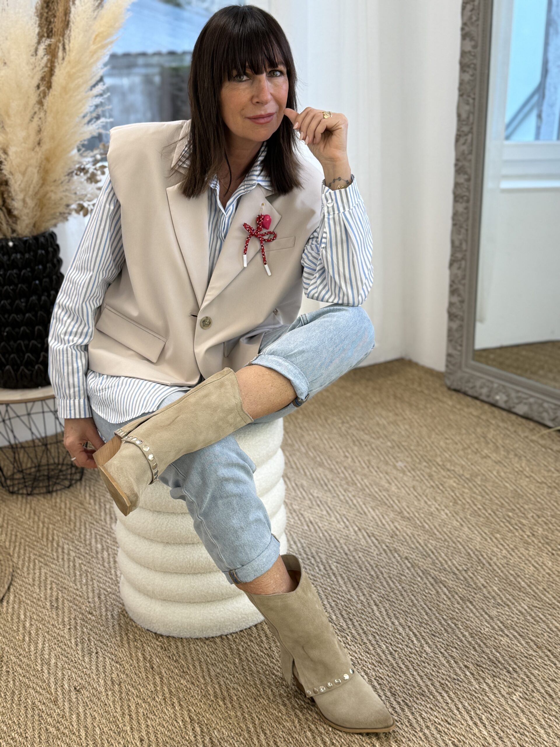 Les bottes en cuir suédé réchauffent la silhouette d’un caractère affirmé.