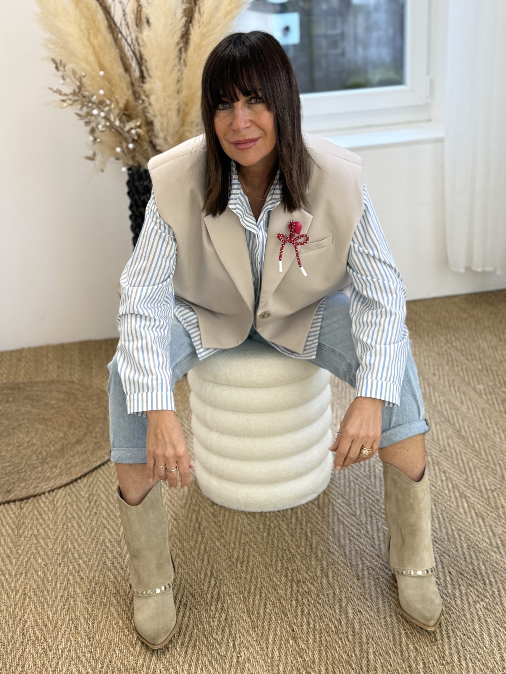 La chemise rayée insuffle une fraîcheur classique subtilement revisitée.