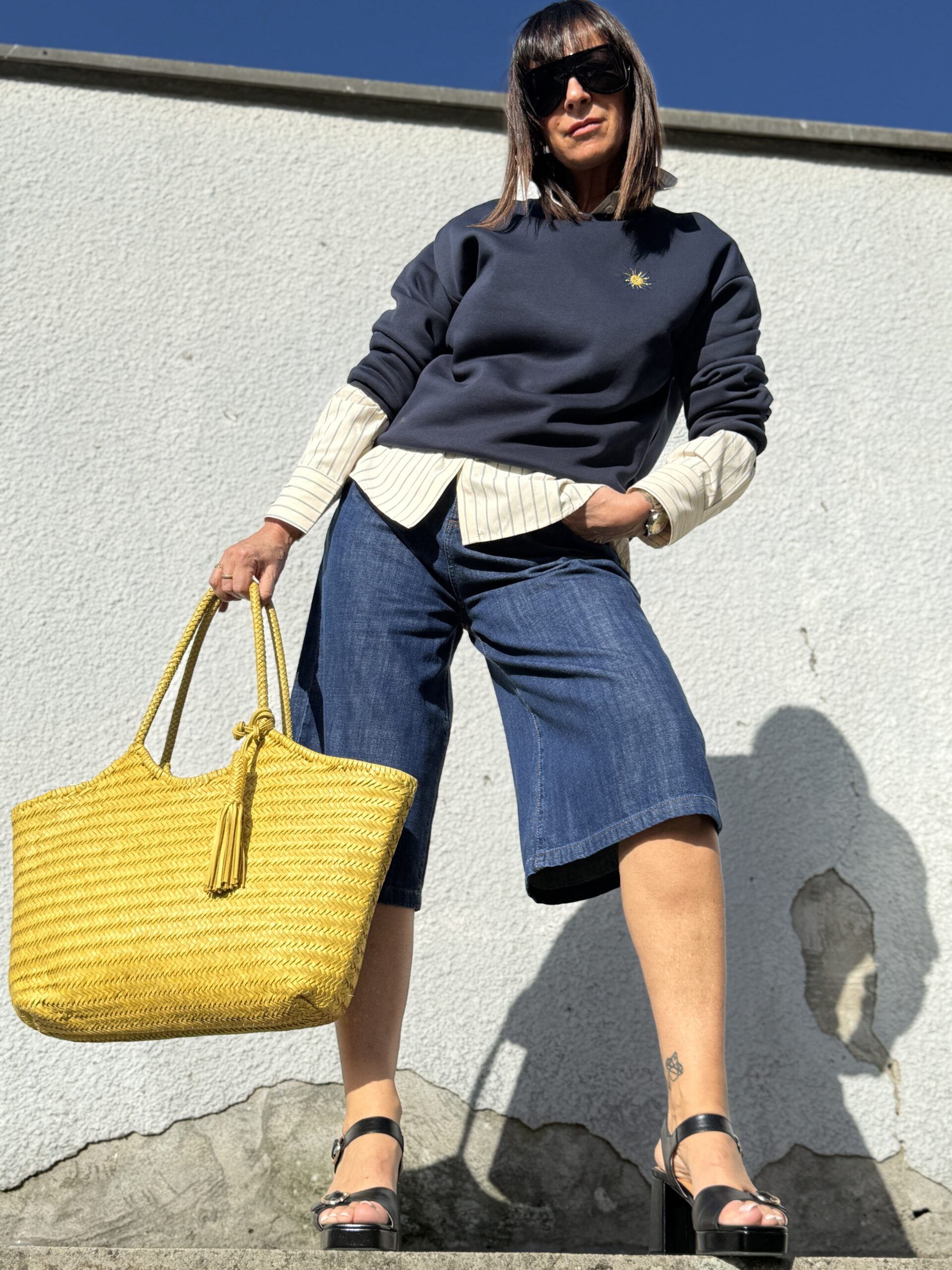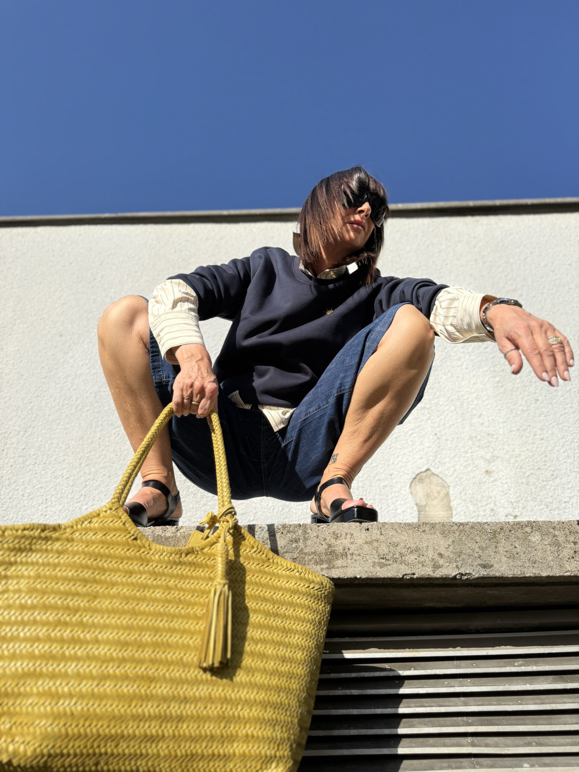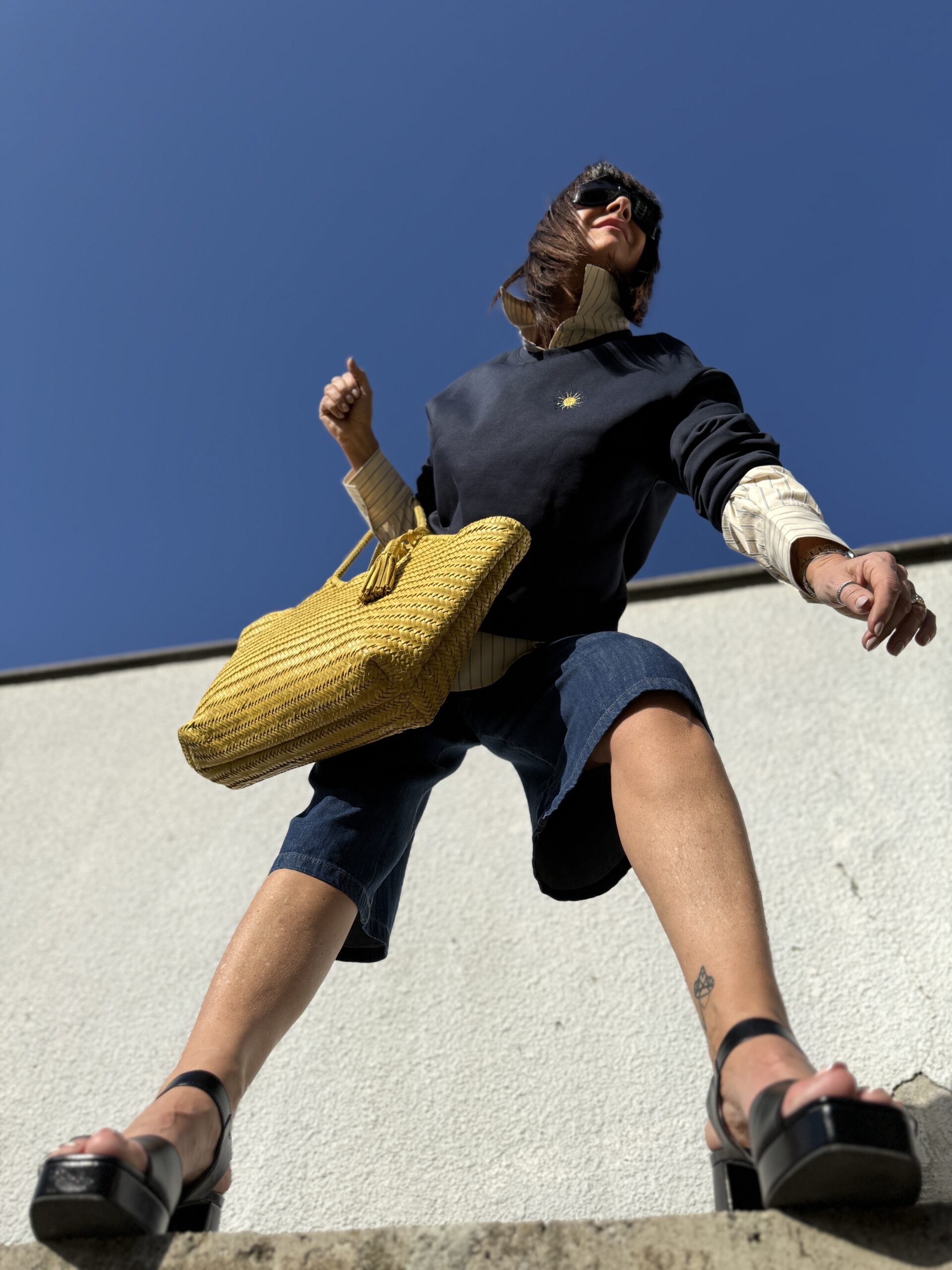 Le sac jaune illumine l’ensemble d’une note solaire et audacieuse.