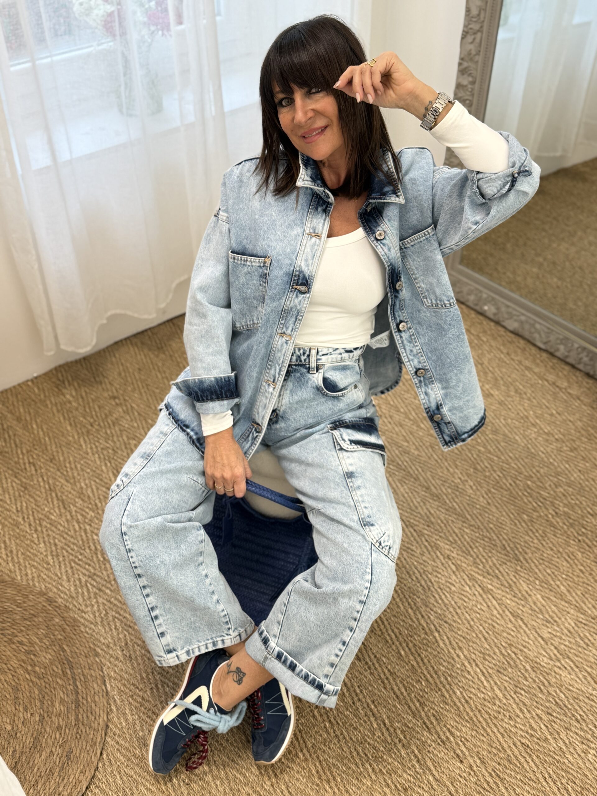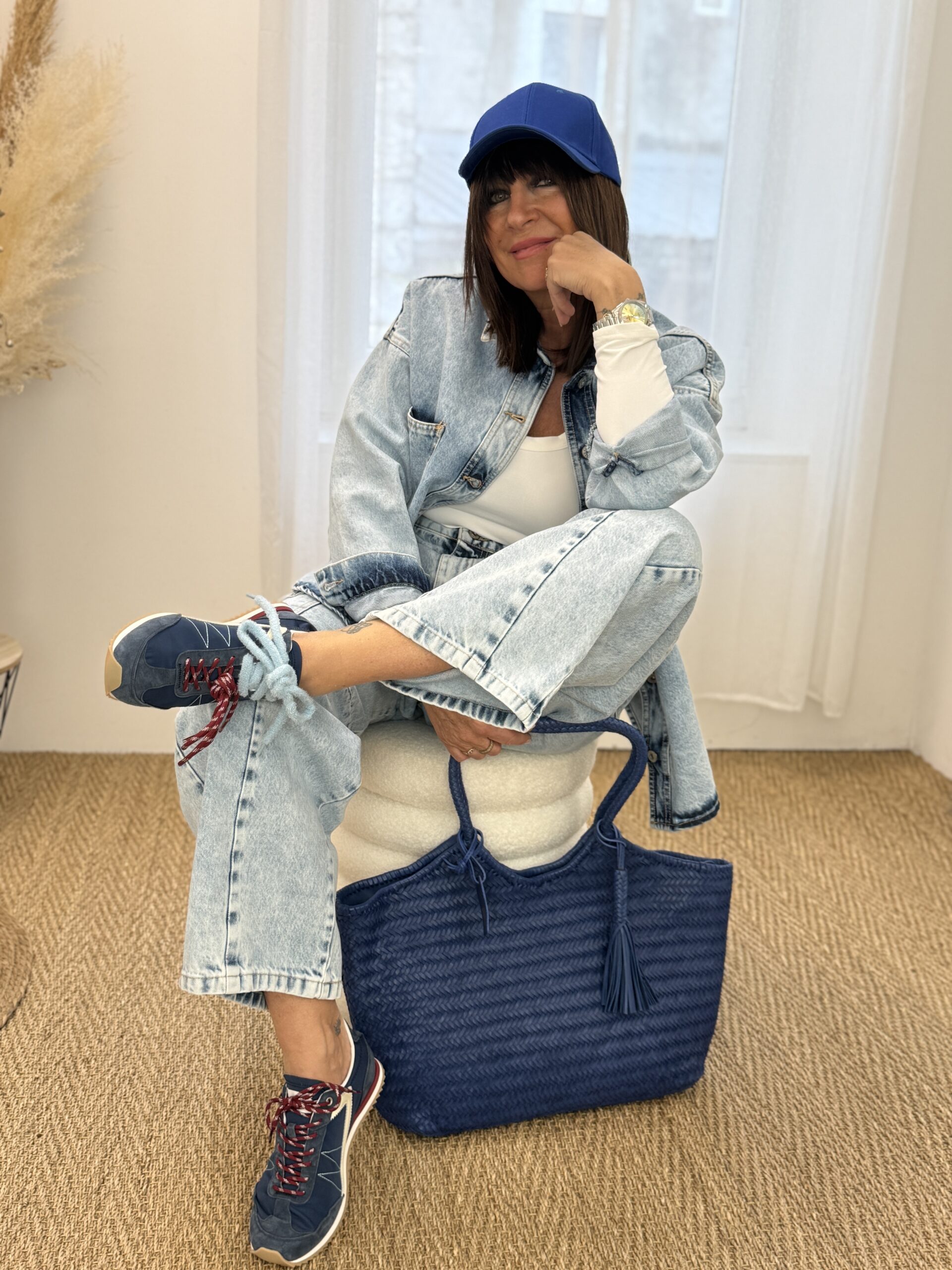 Elle affirme son style avec une silhouette tout en denim à l’allure décontracté.