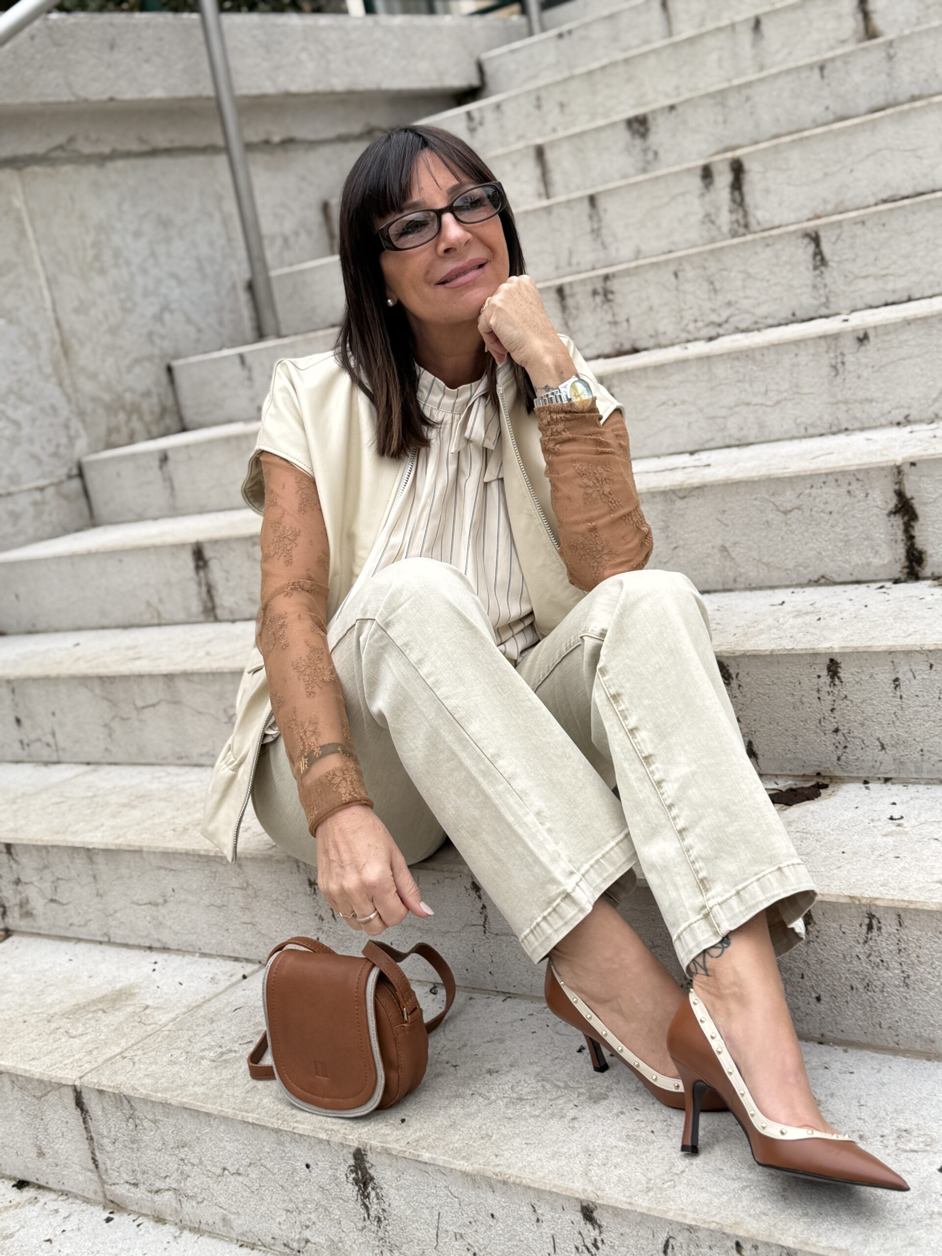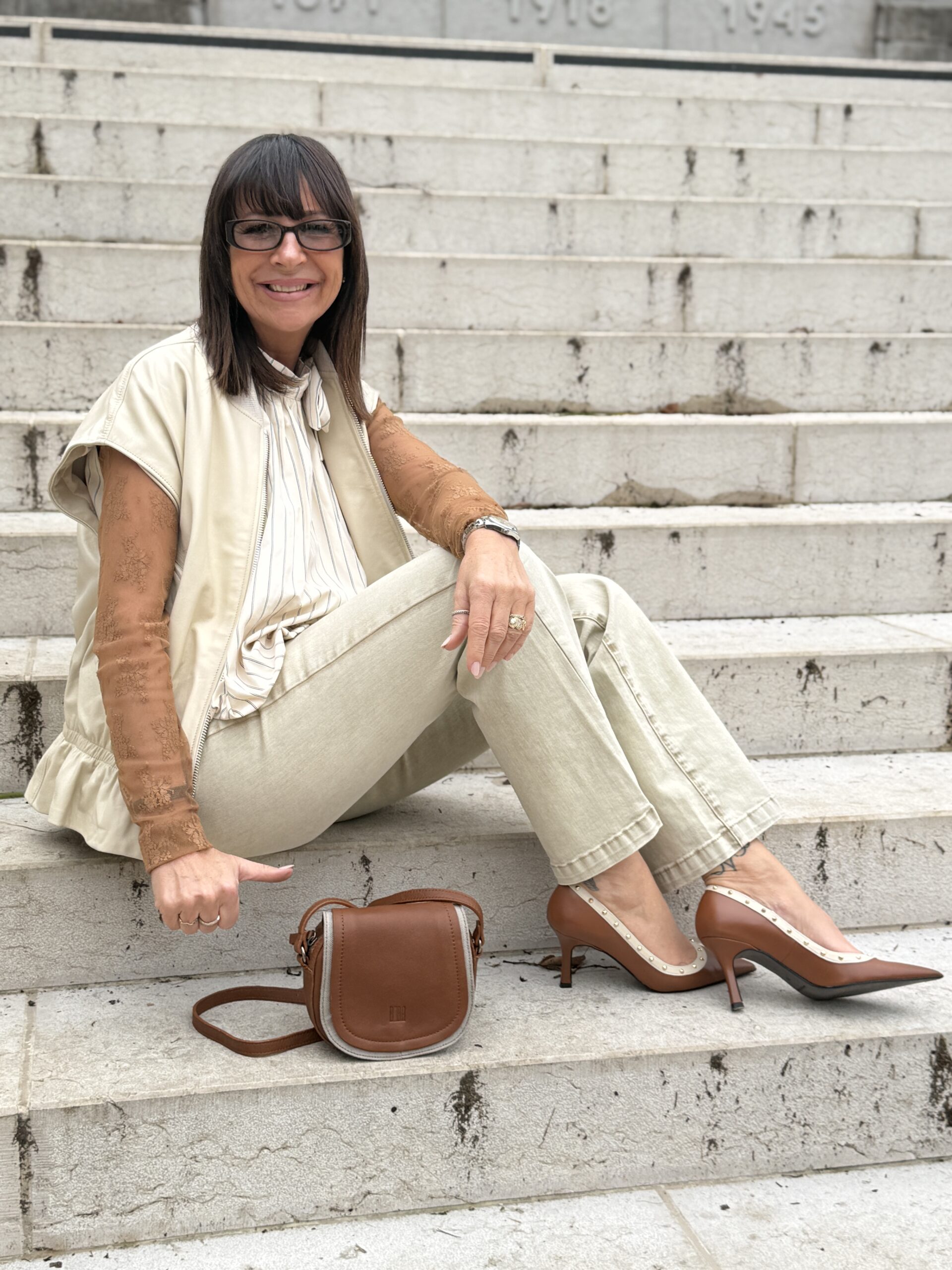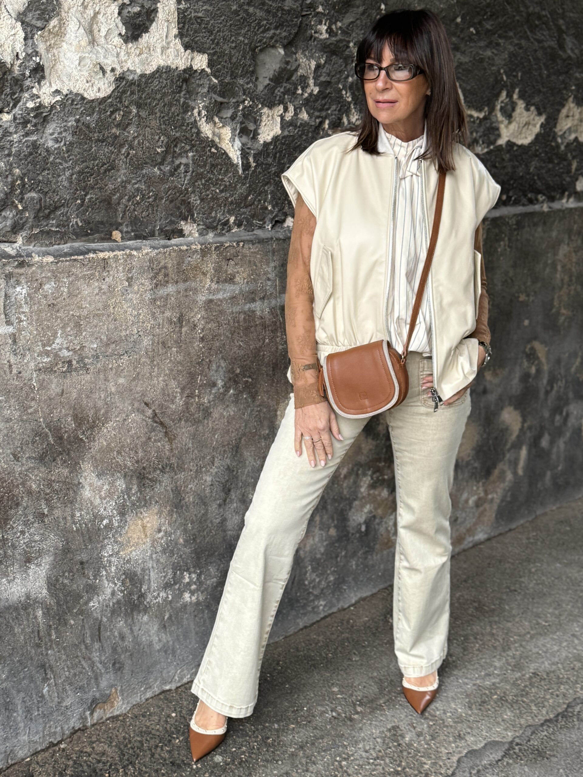 Le sac camel souligne l’ensemble d’une touche chic et intemporelle.