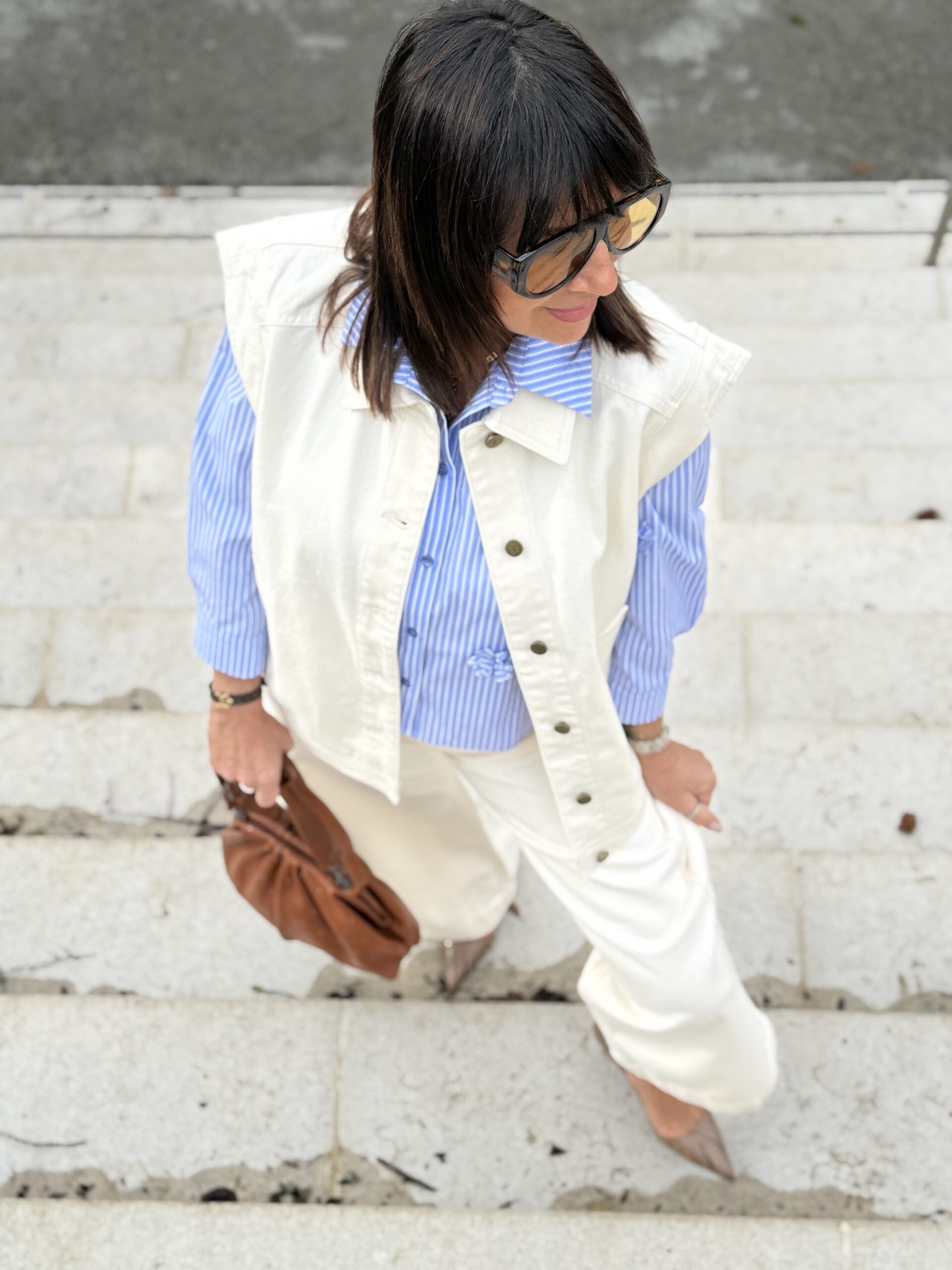 Son gilet sans manches impose une modernité douce, presque architecturale.