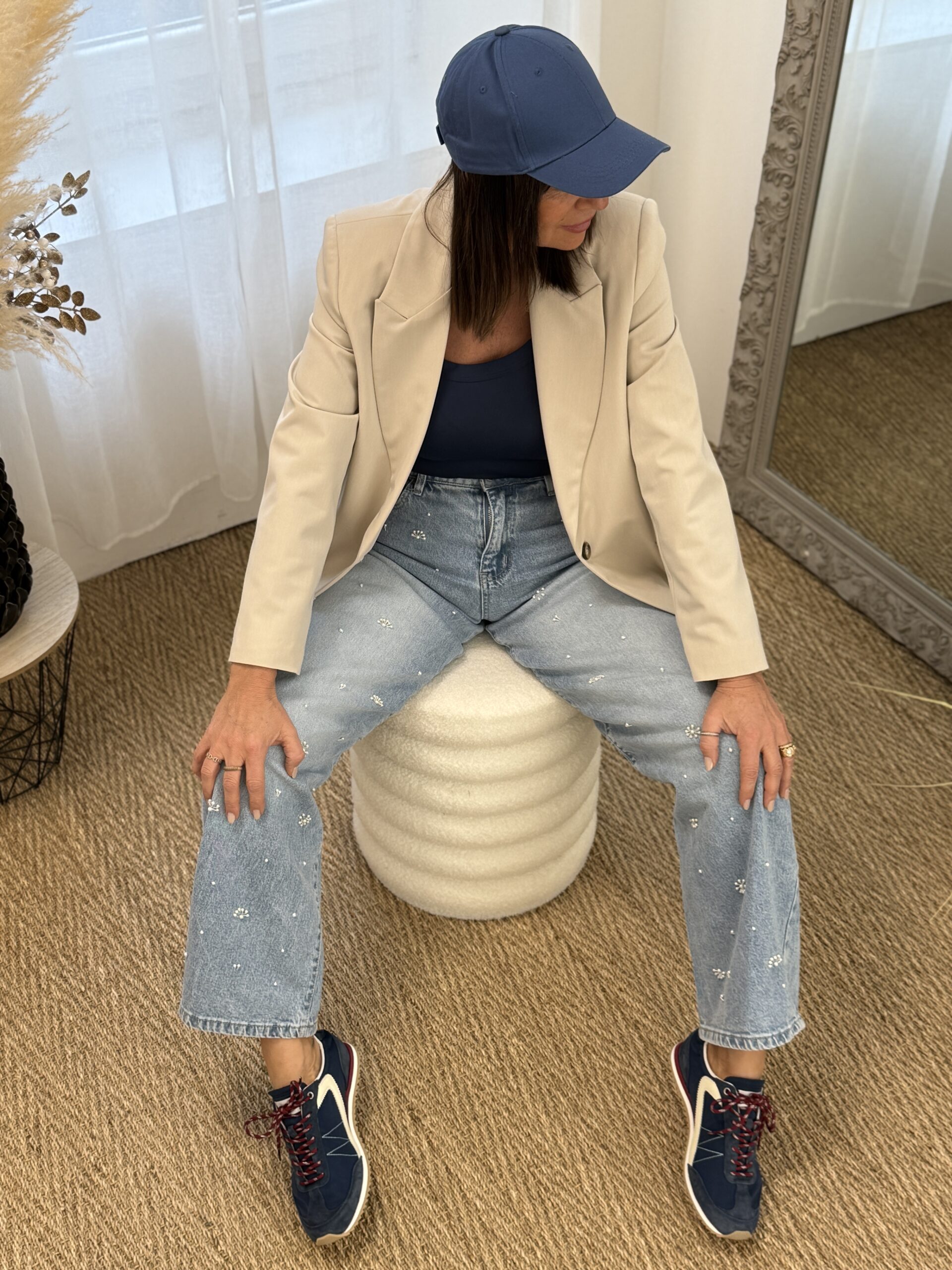 Son débardeur marine épouse de ses mouvements, tandis que le blazer beige, structure sa silhouette avec une douceur maîtrisée.
