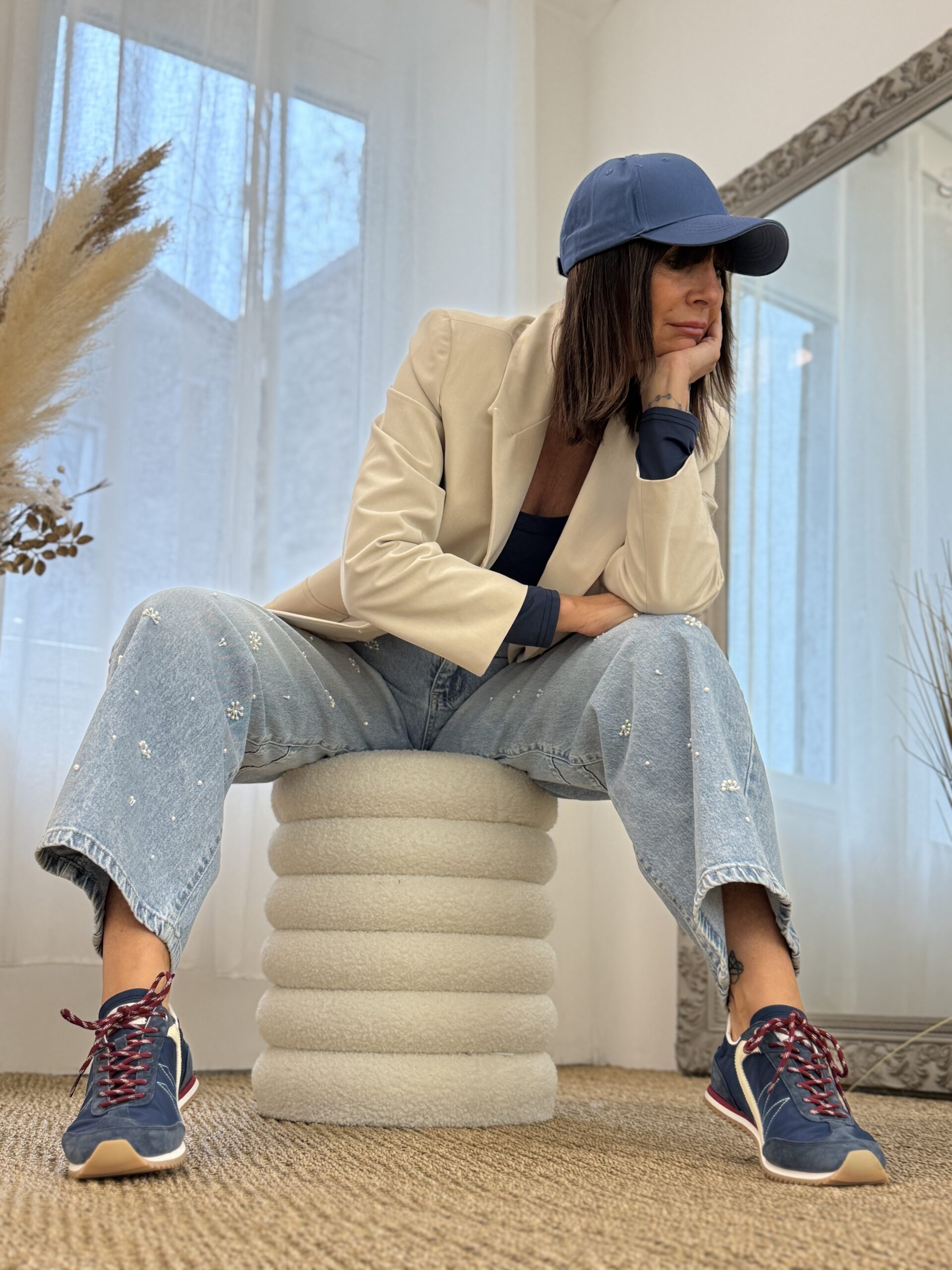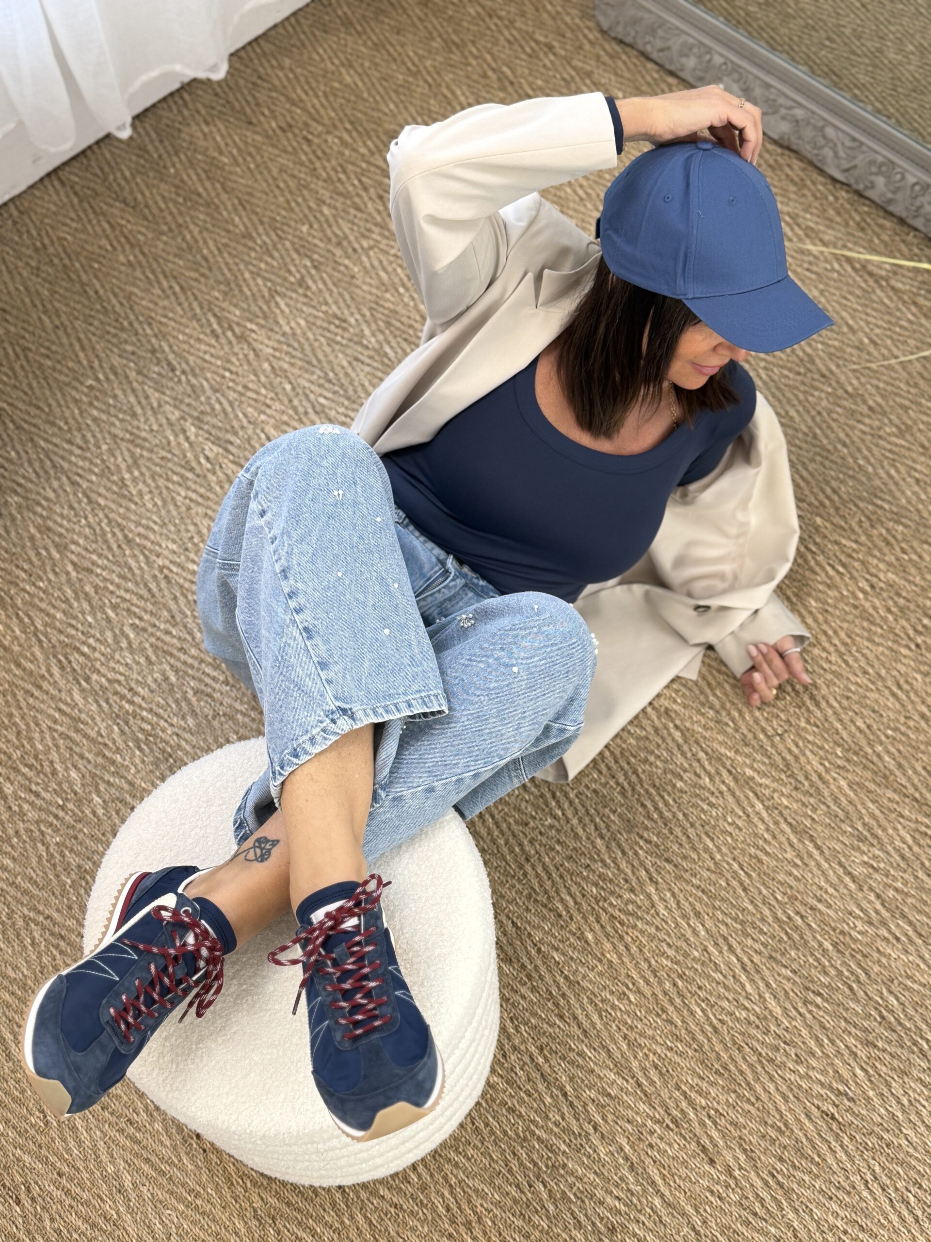 Elle enfile sa casquette bleu, profond, comme une pause. Intention : discrète, mais affirmé.
