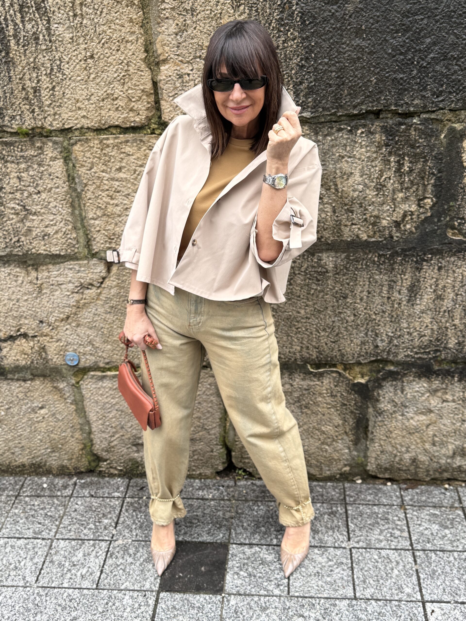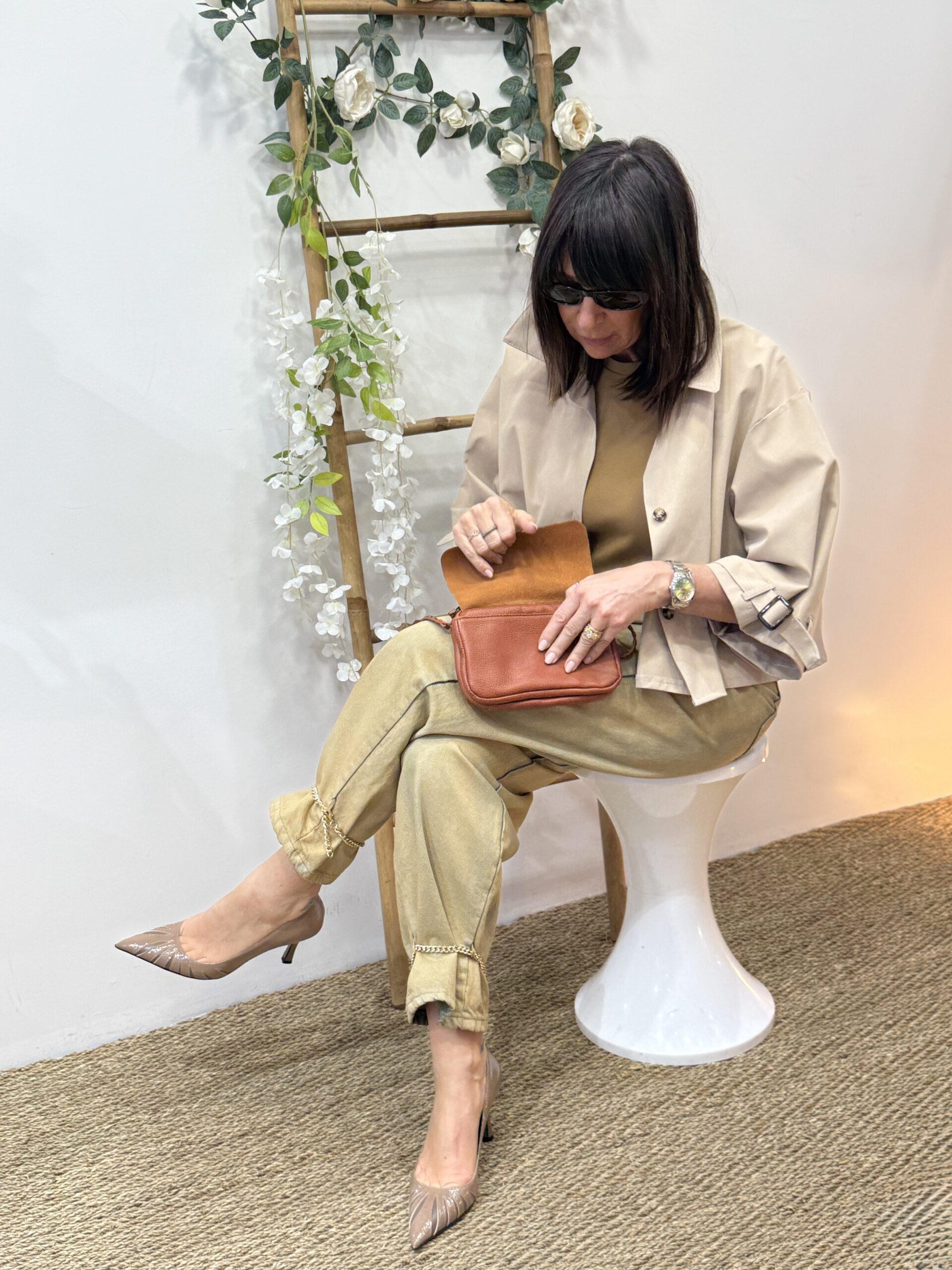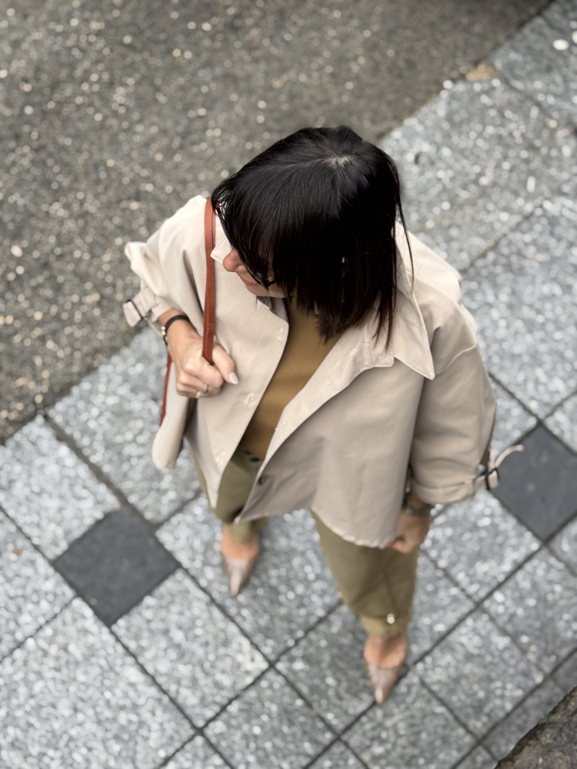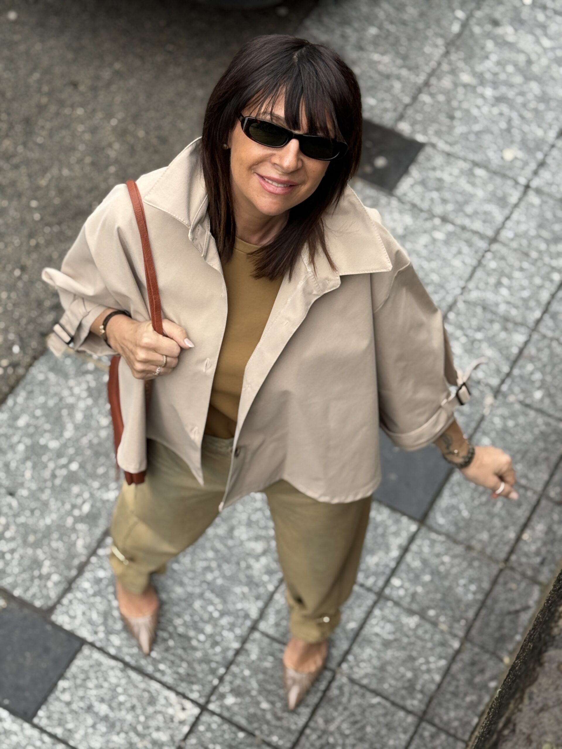 Le sac brun devient le point d’ancrage, discret mais résolument chic.