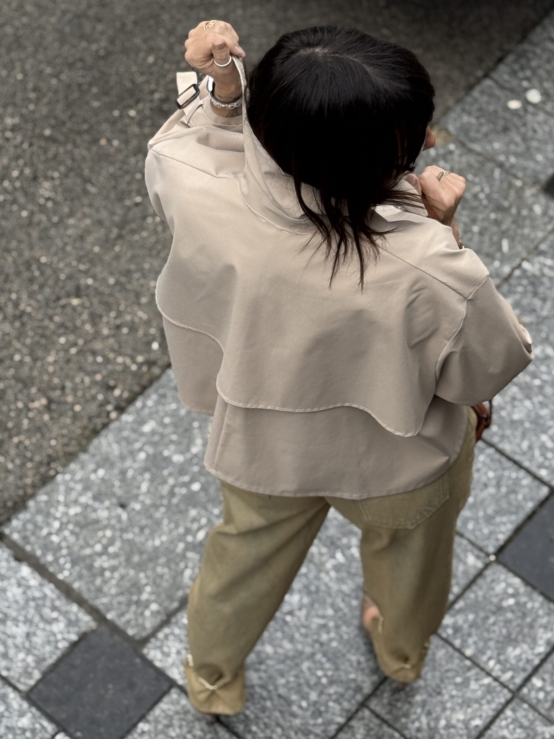 La veste amples apporte une modernité douce, presque architectural.