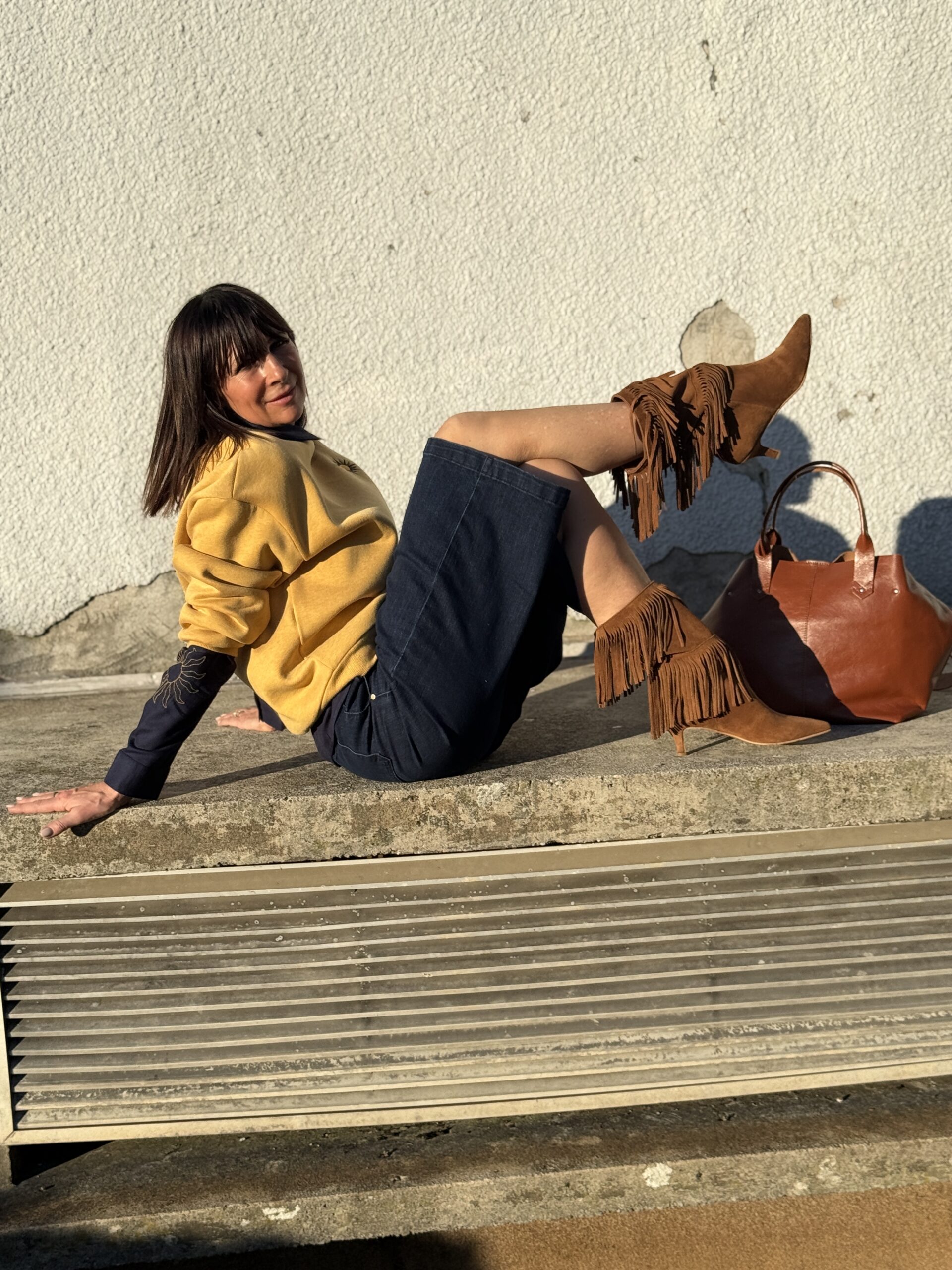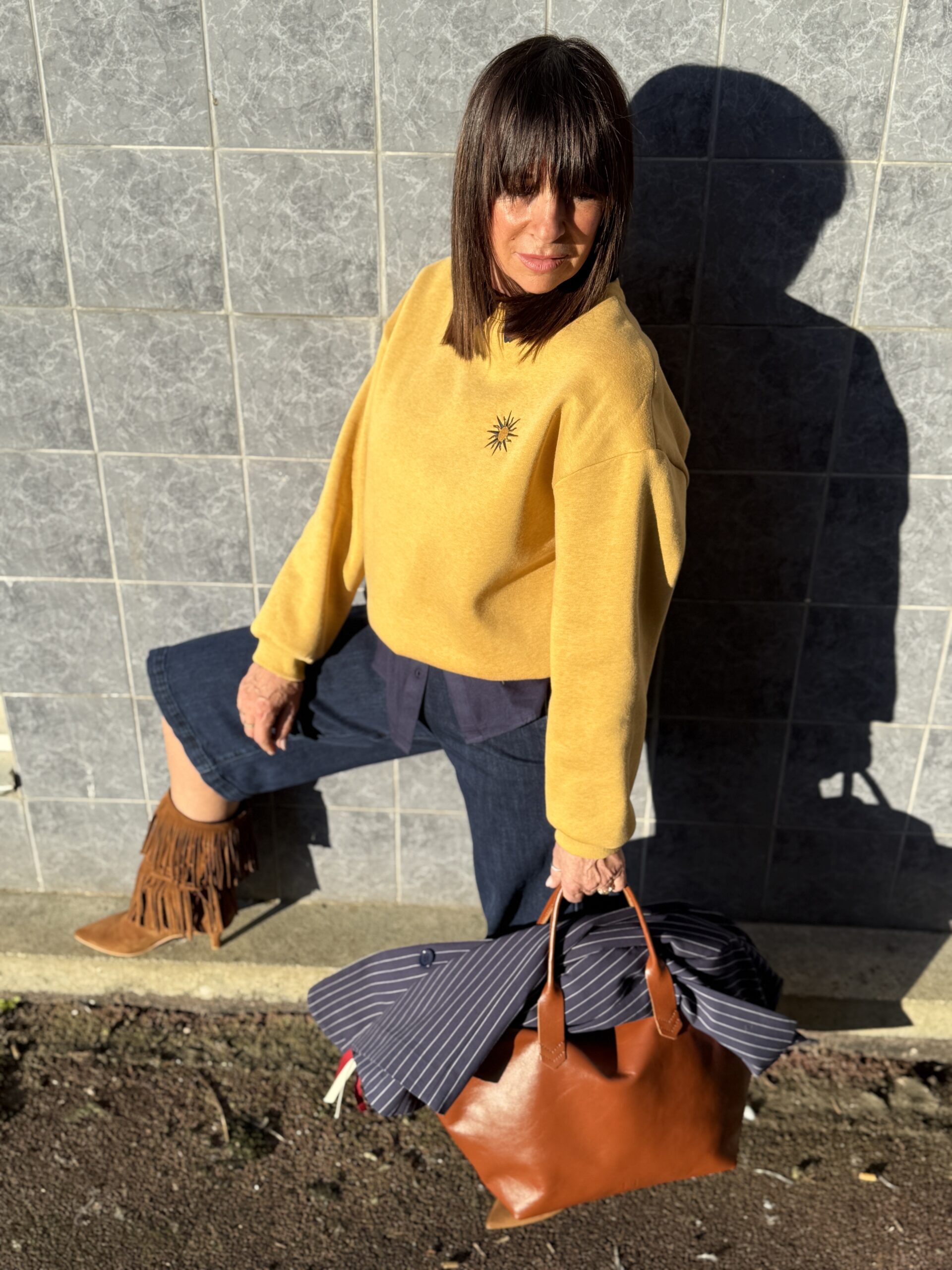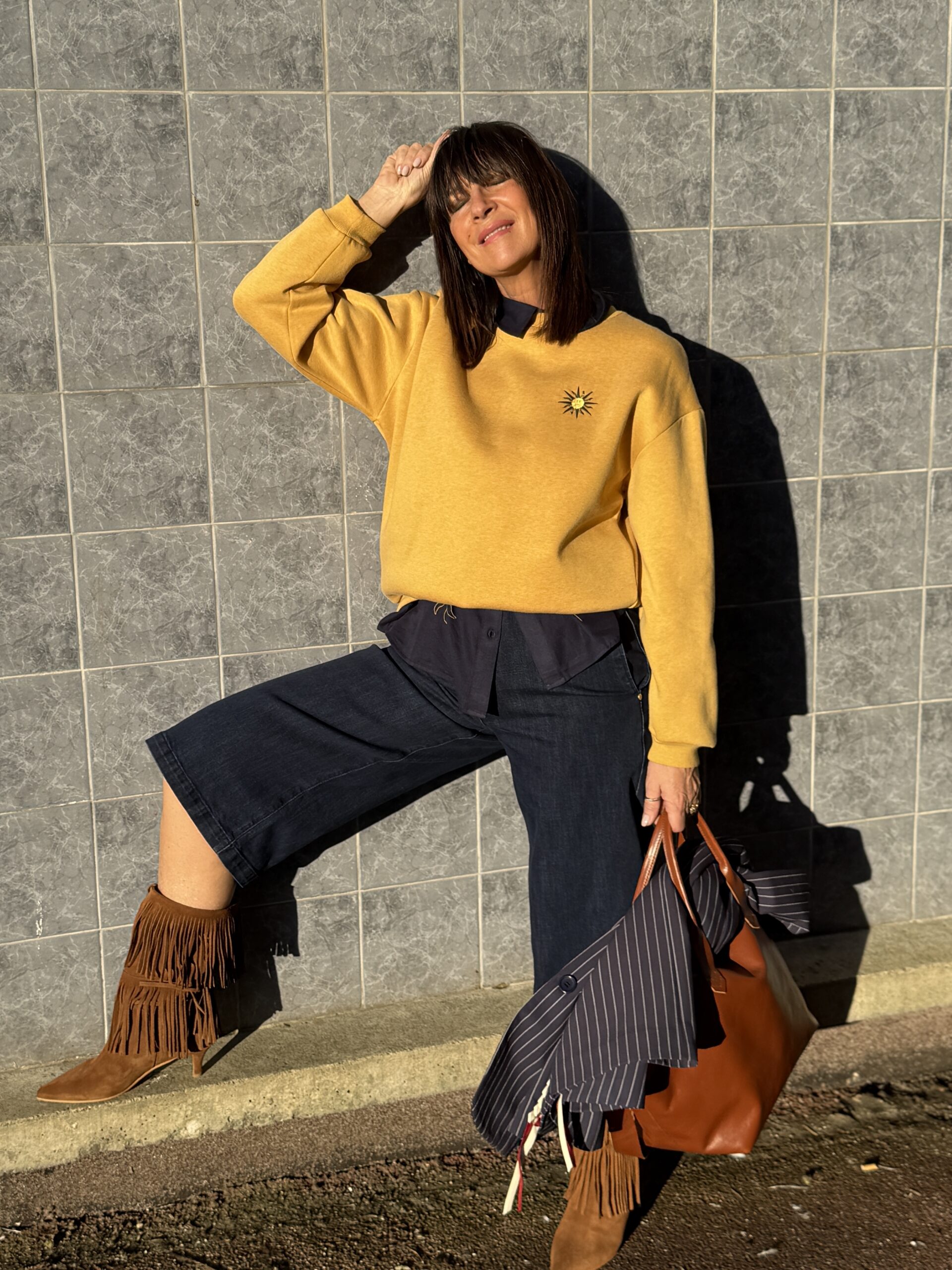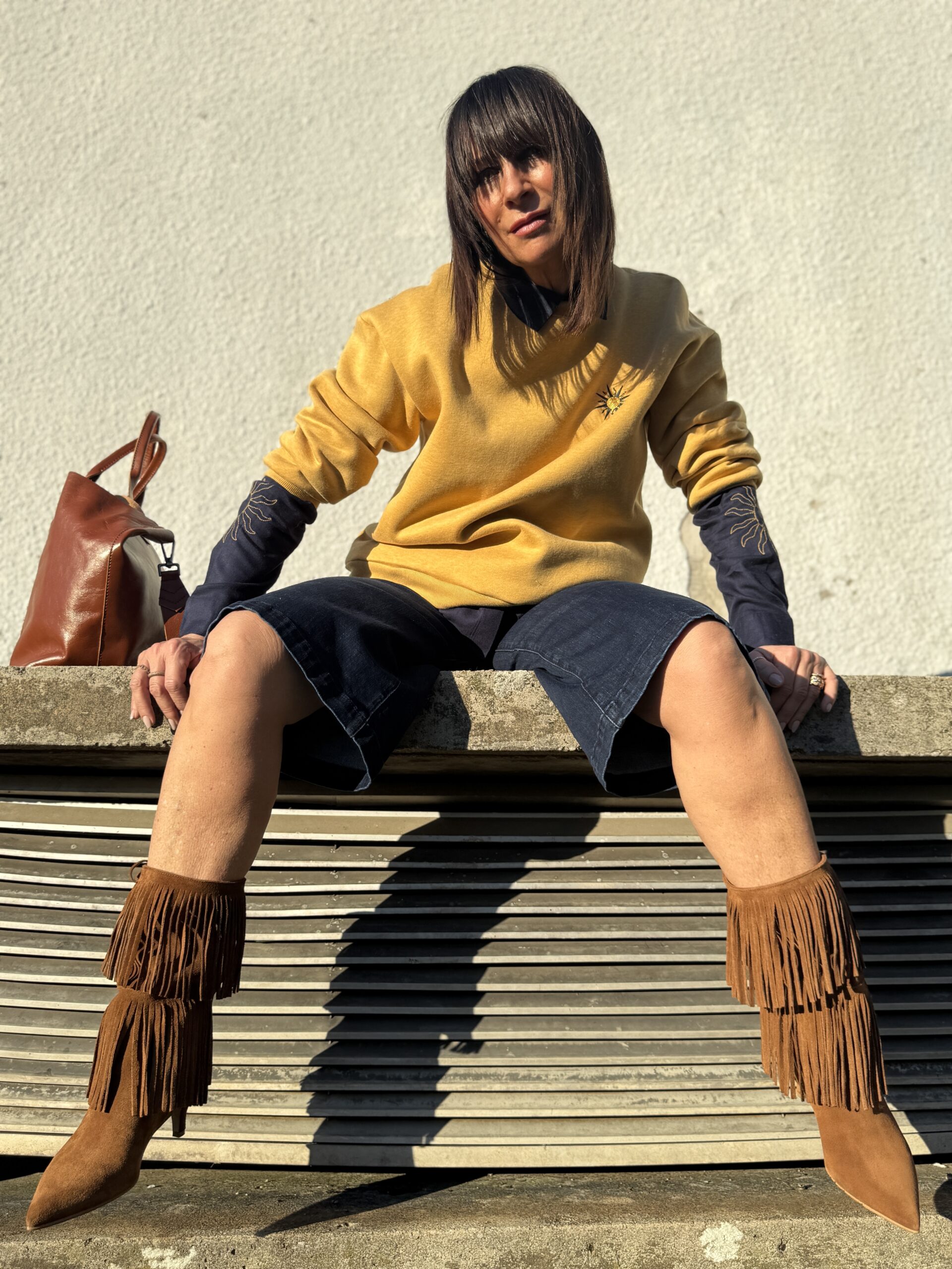 Le sweat jaune illumine la silhouette et contraste joliment avec le denim brut.