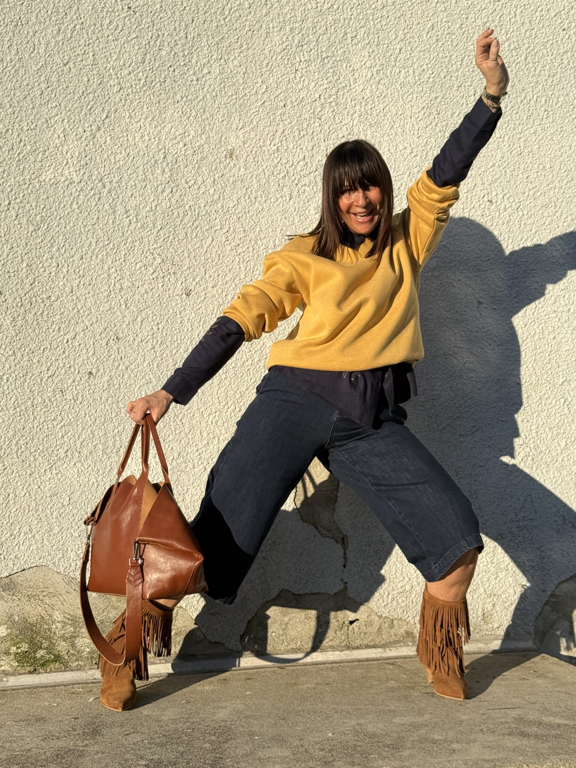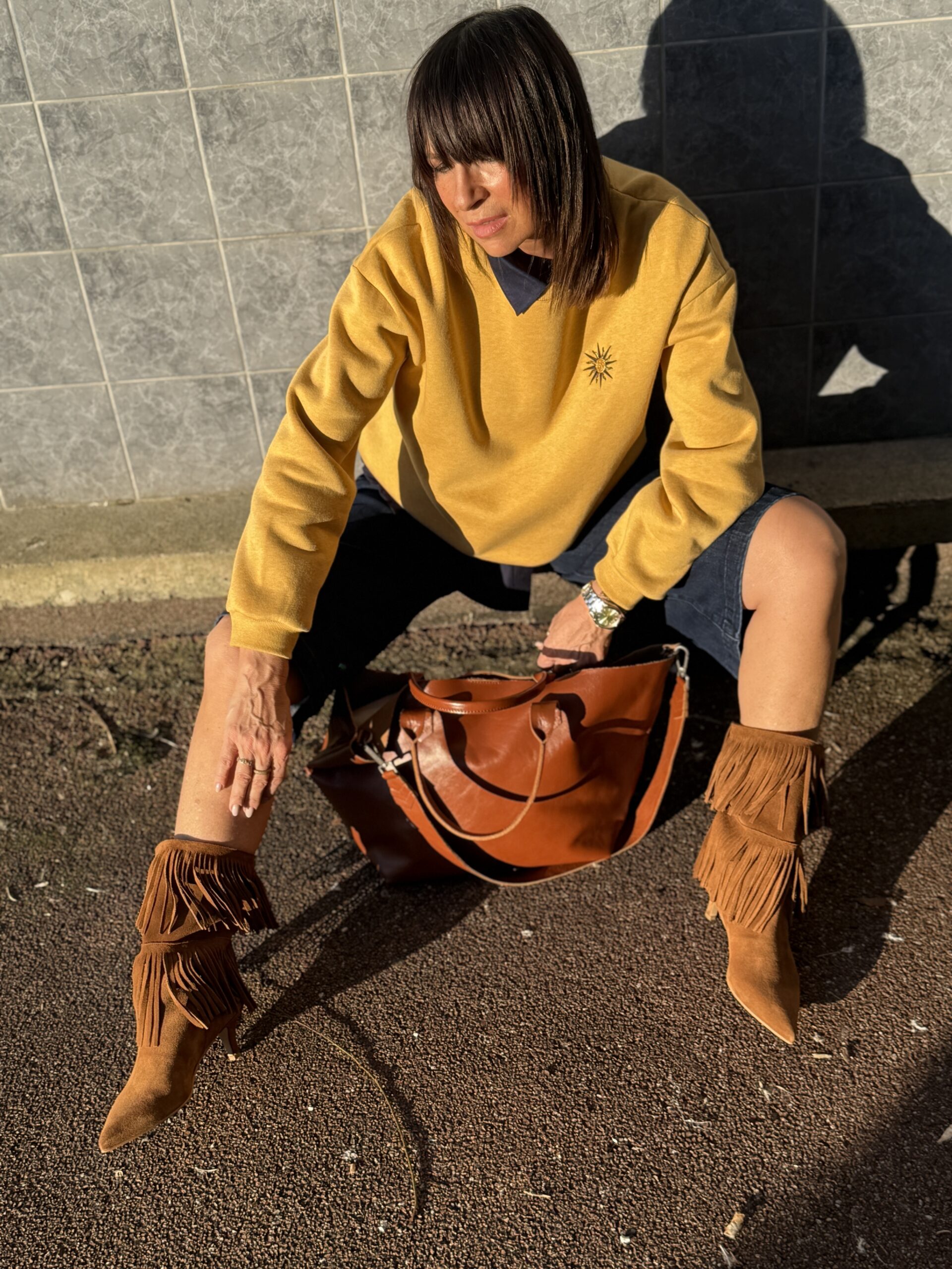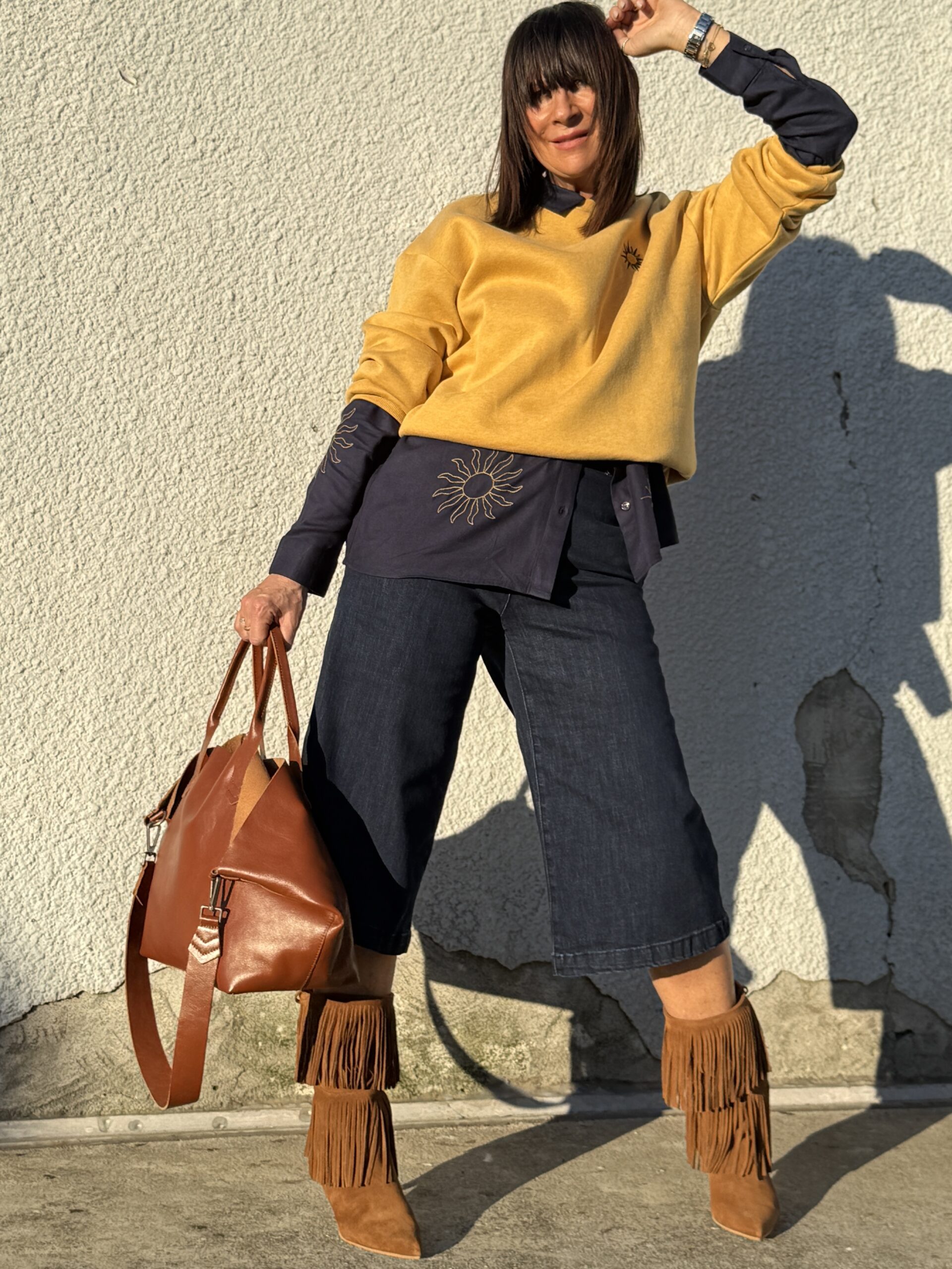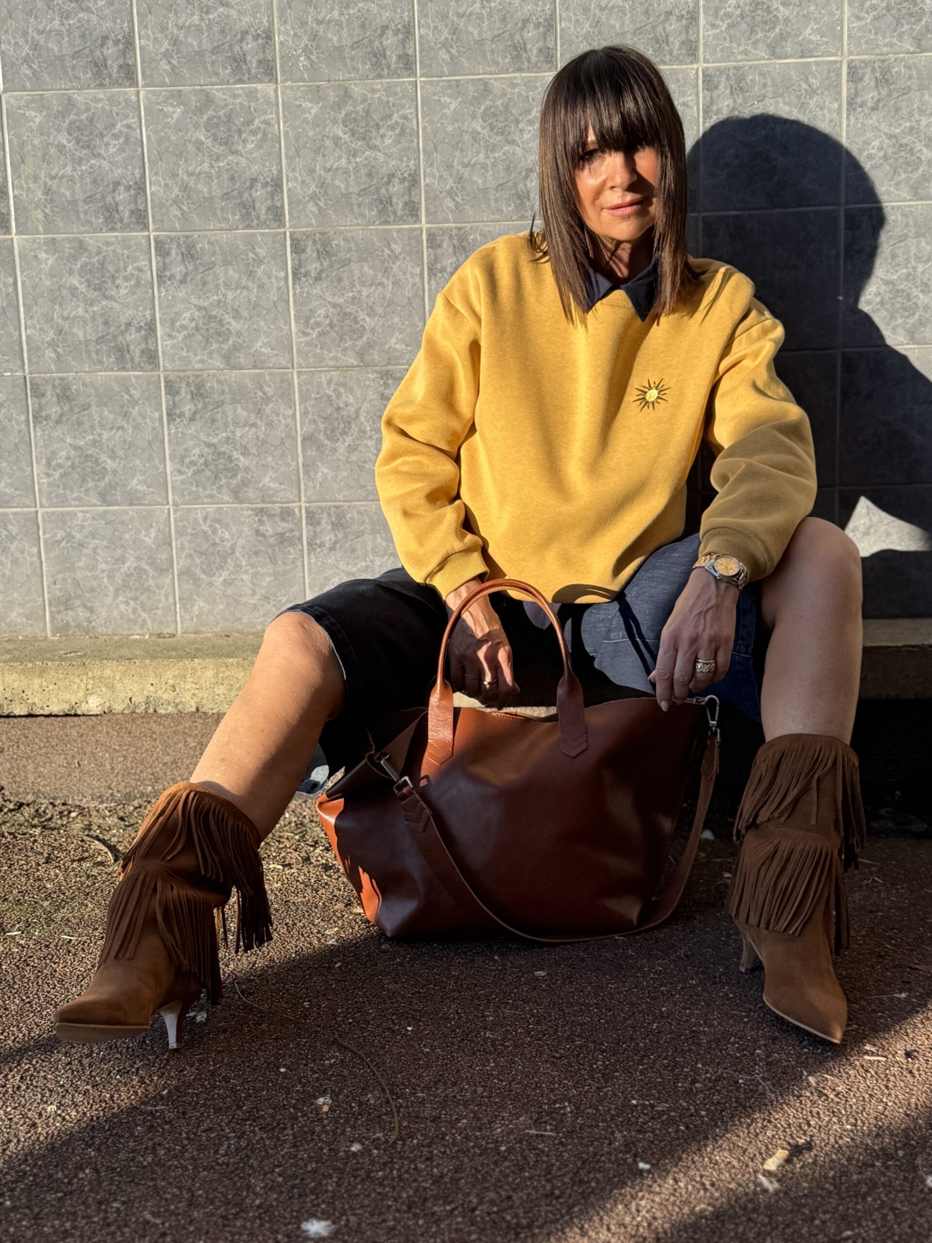 Le sweat jaune illumine la silhouette et contraste joliment avec le denim brut.