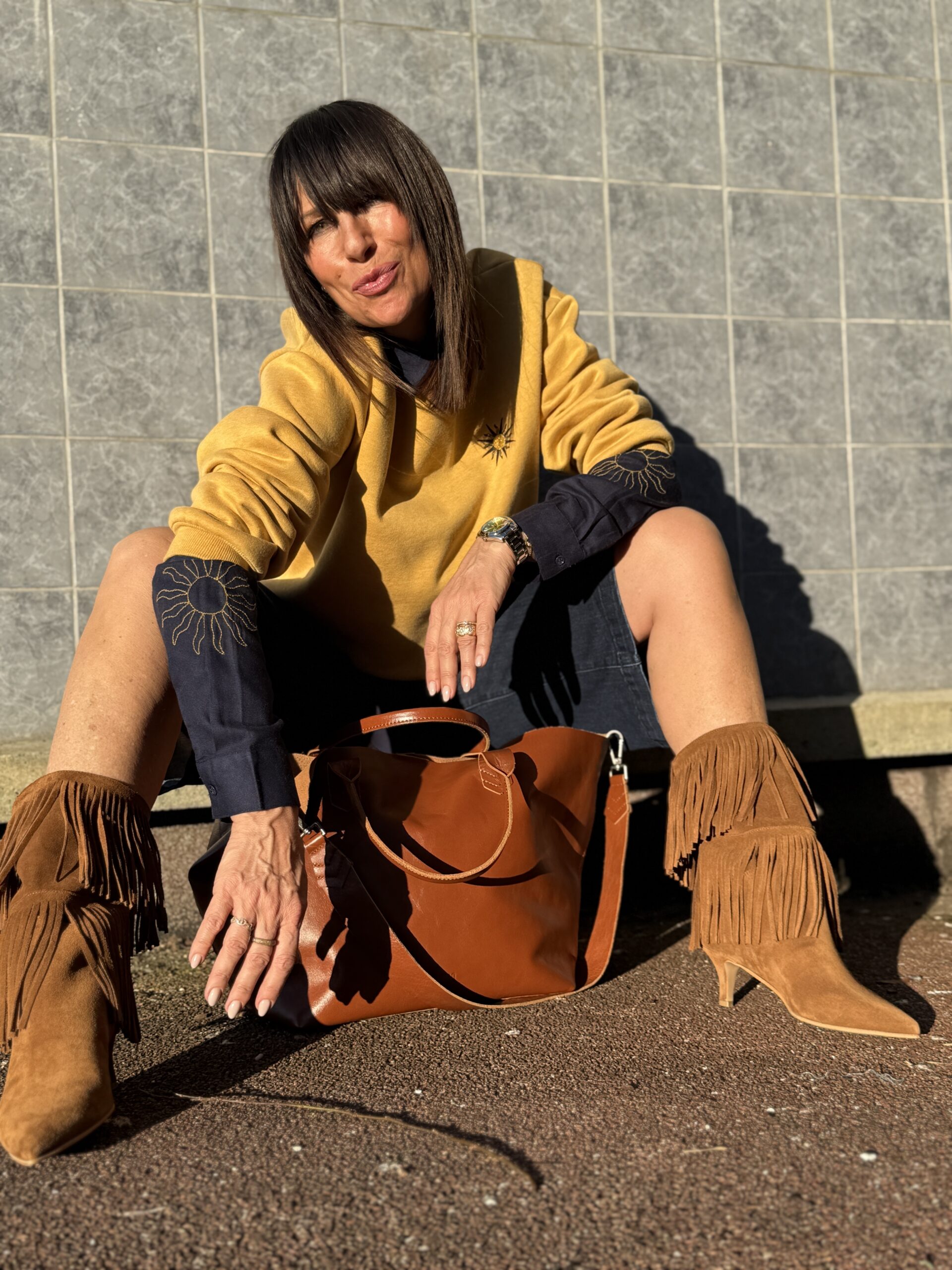 Le sac camel harmonise l’ensemble pour une allure audacieuse, solaire et pleine de personnalité.