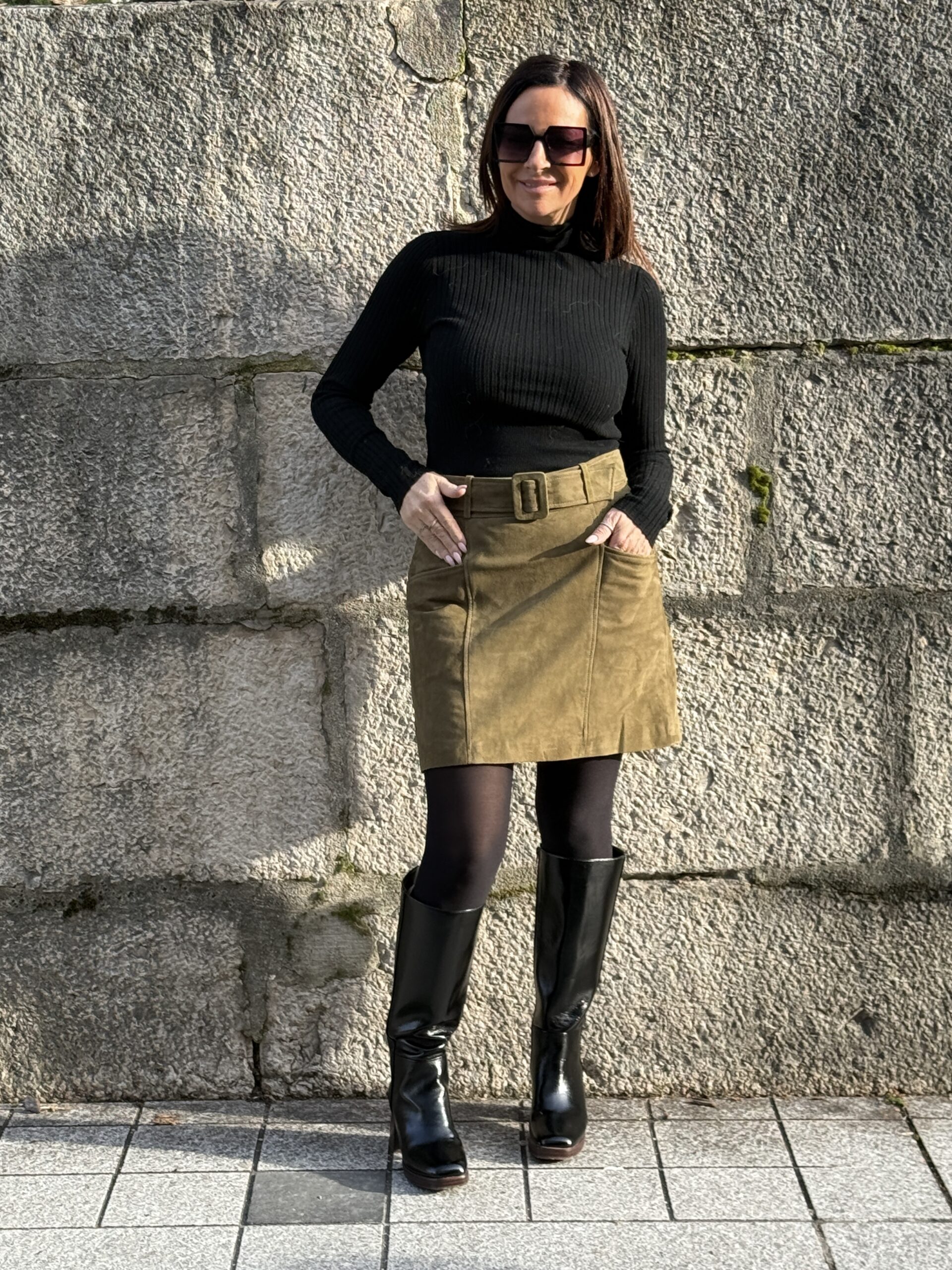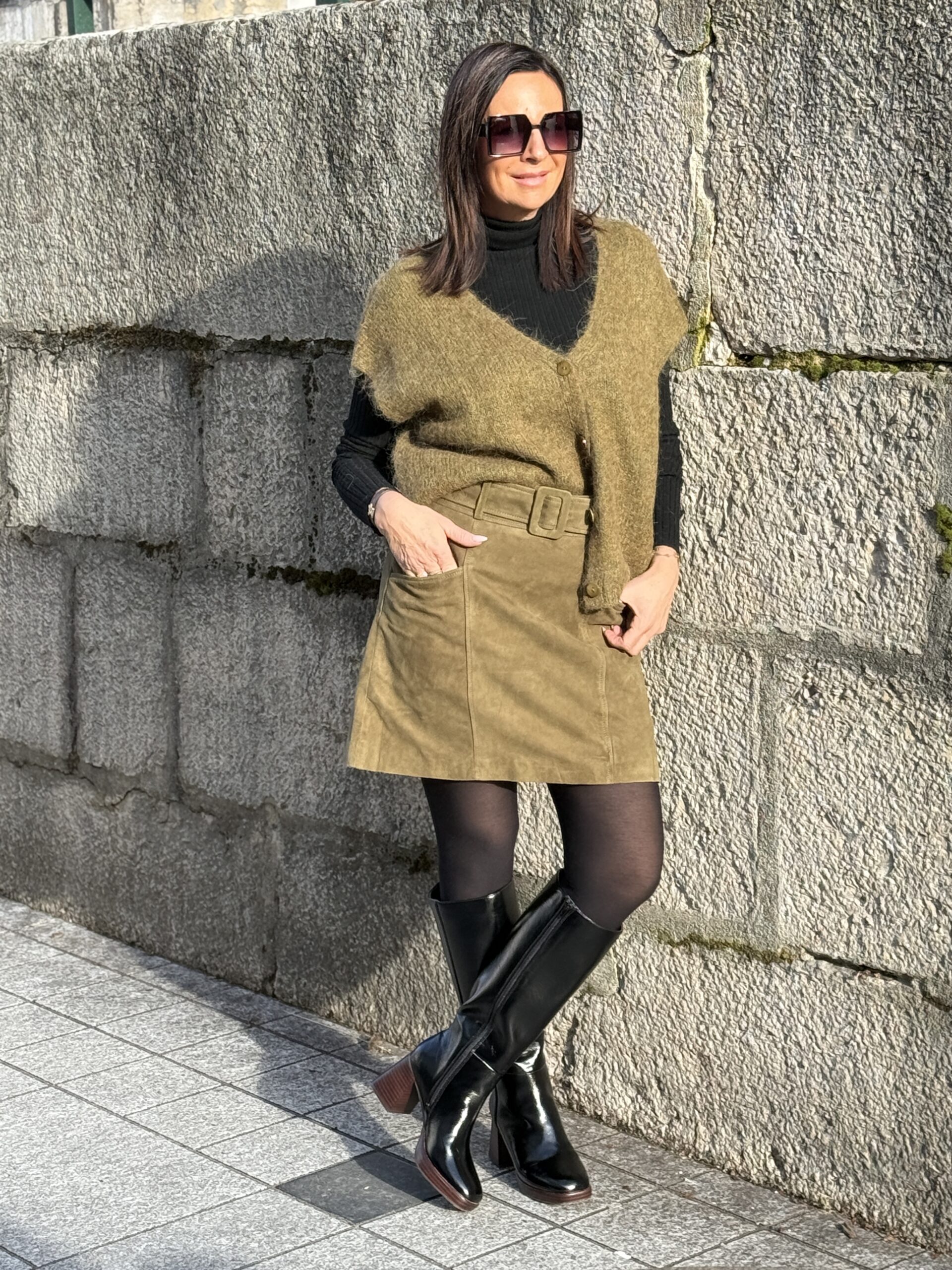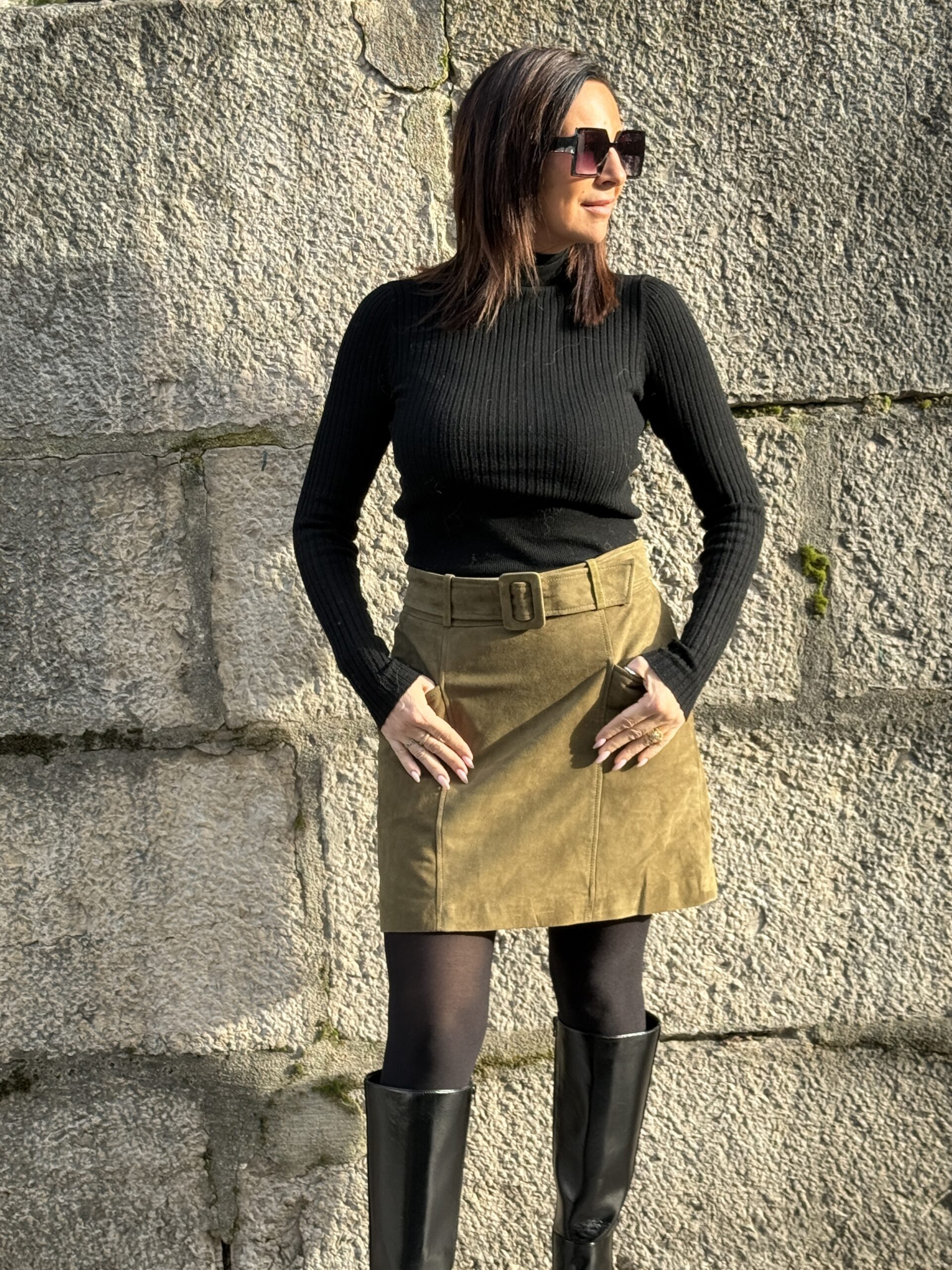 Conseil mode de Nathalie : Porte-la avec des bottes en cuir et un petit pull rentrée pour une silhouette chaleureuse et élégante.
