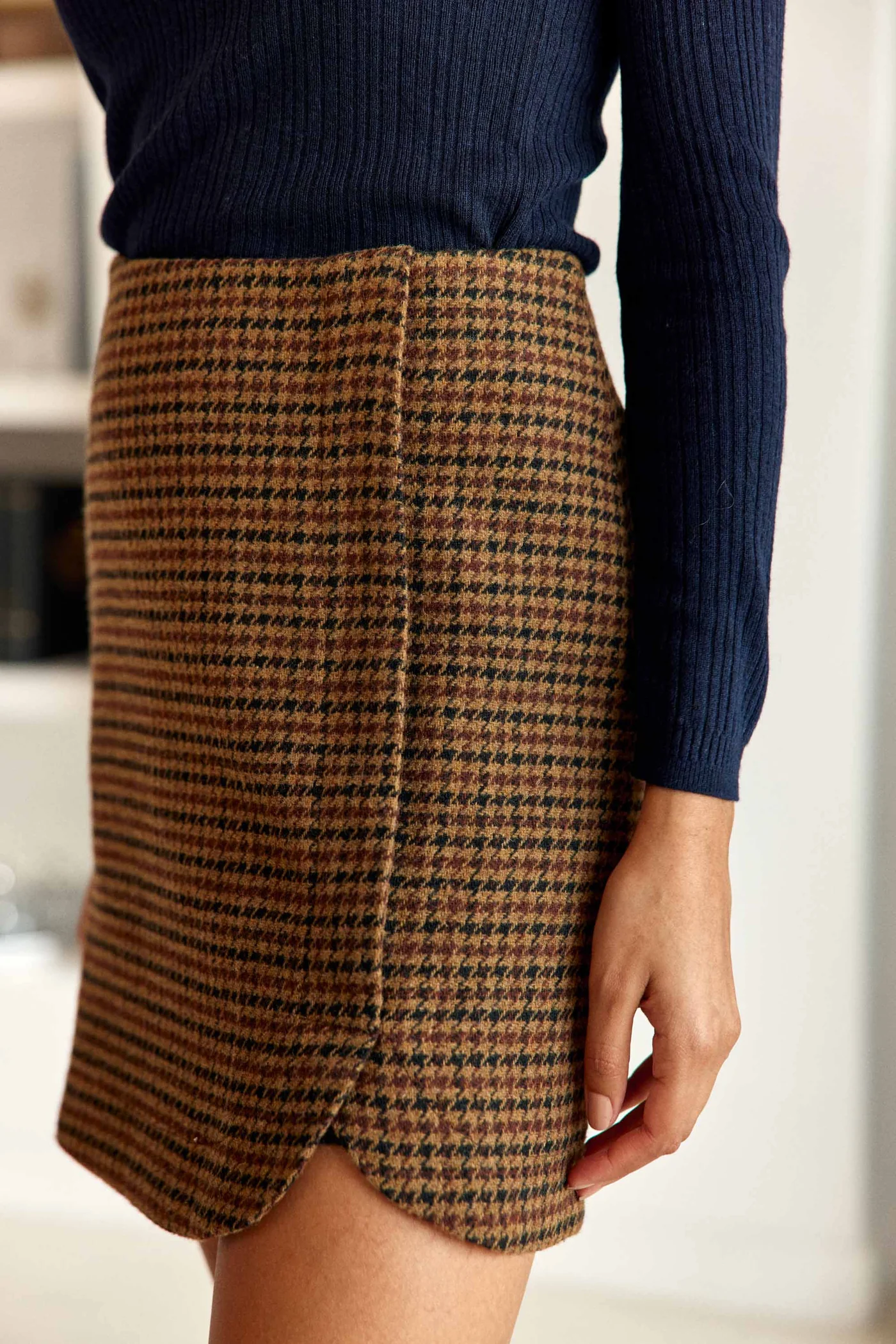Jupe courte gris et bleu coupe portefeuille, confectionnée en tweed à carreaux avec taille haute et boutonnage croisé.