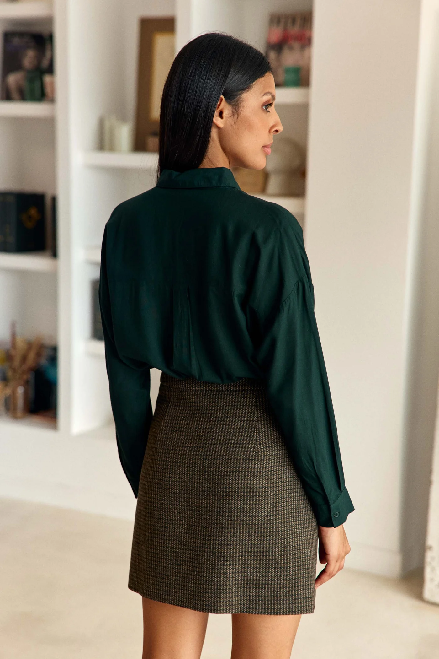 Conseil mode de Nathalie : Porte-la avec un pull fin bordeaux, une veste et des bottes en cuir pour une silhouette chaleureuse et élégante.