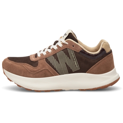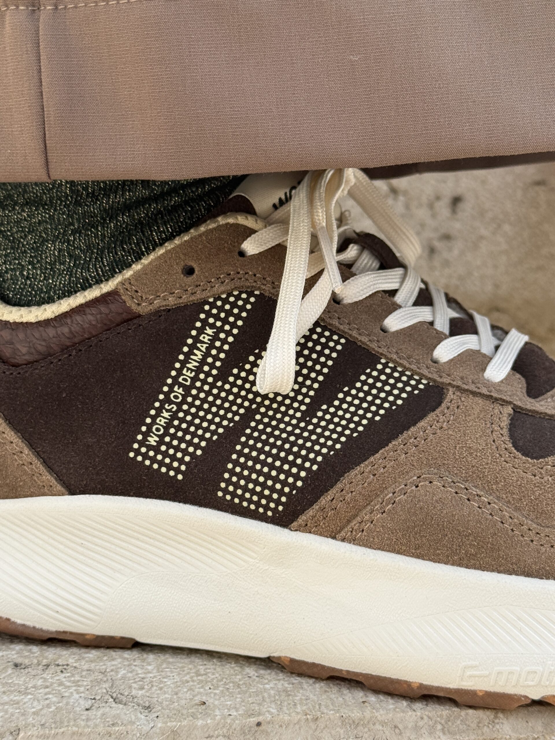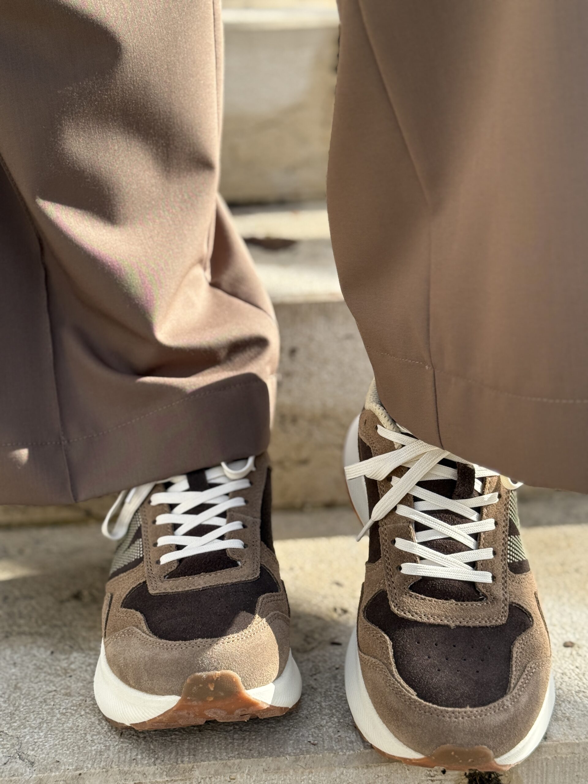 La basket « Mathilde » Runner allie un design sportif à des lignes épurées et à des matériaux éco-responsables. Son empeigne associe du daim certifié et du cuir de poisson recyclé, créant un style moderne à la texture subtile. Sa semelle légère assure un confort optimal tout au long de la journée