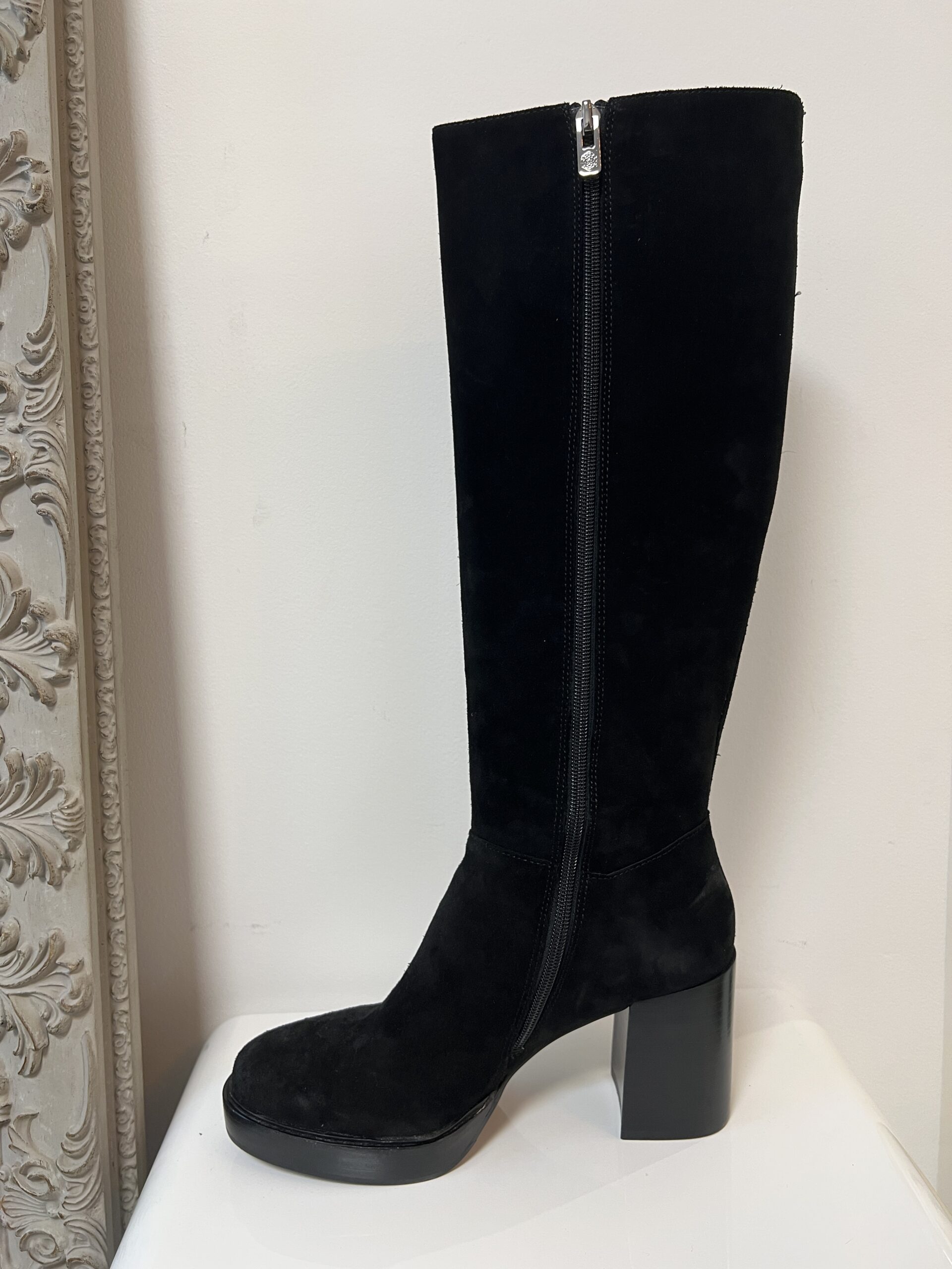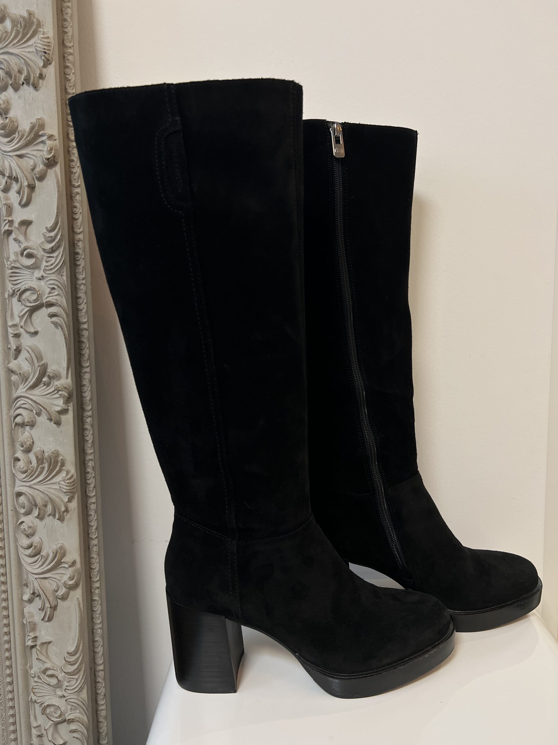 Ces bottes hautes en cuir suédé allient élégance intemporelle et confort moderne. Leur silhouette épurée s’adapte aussi bien à une tenue décontractée qu’à un look habillé.