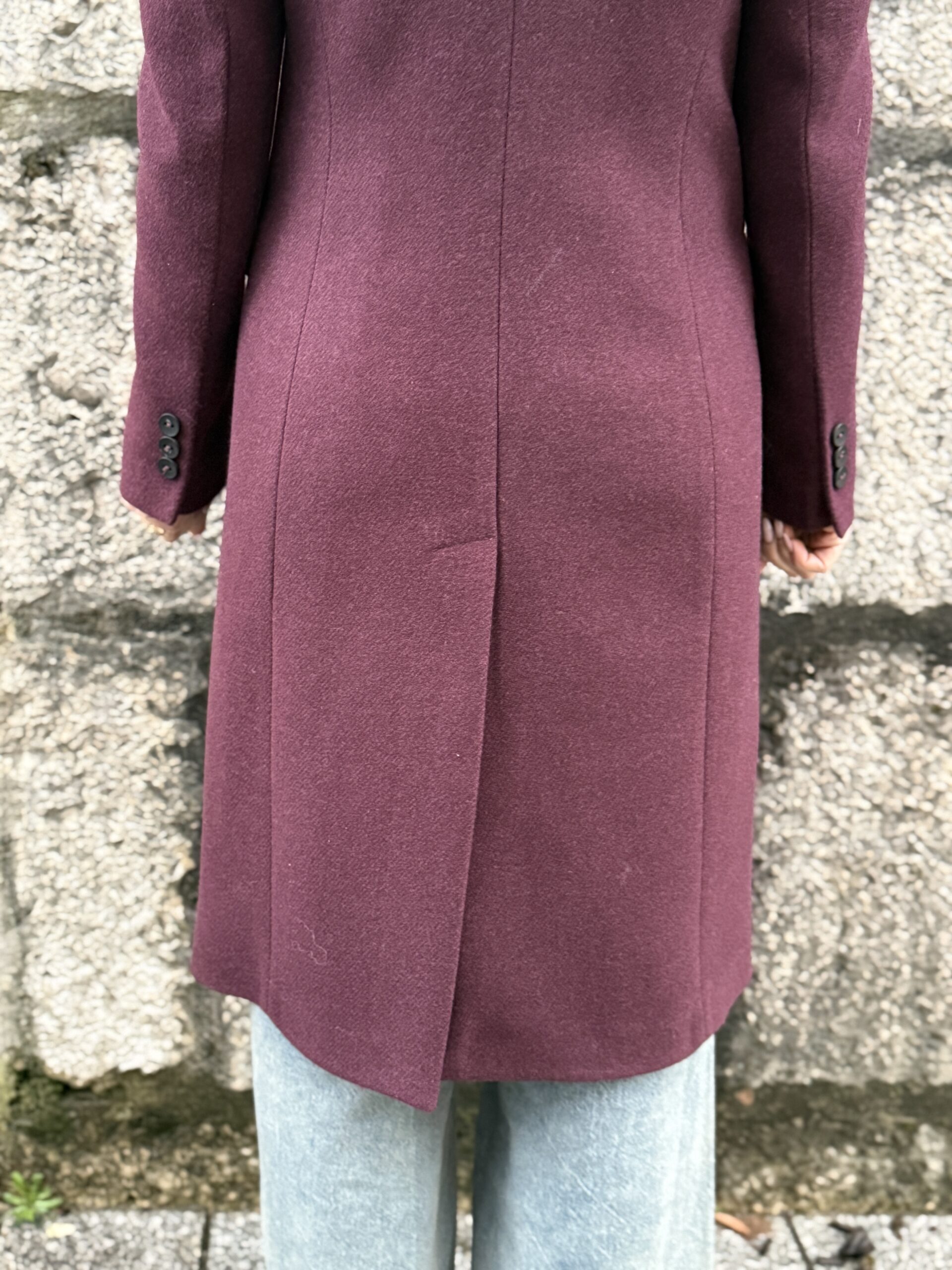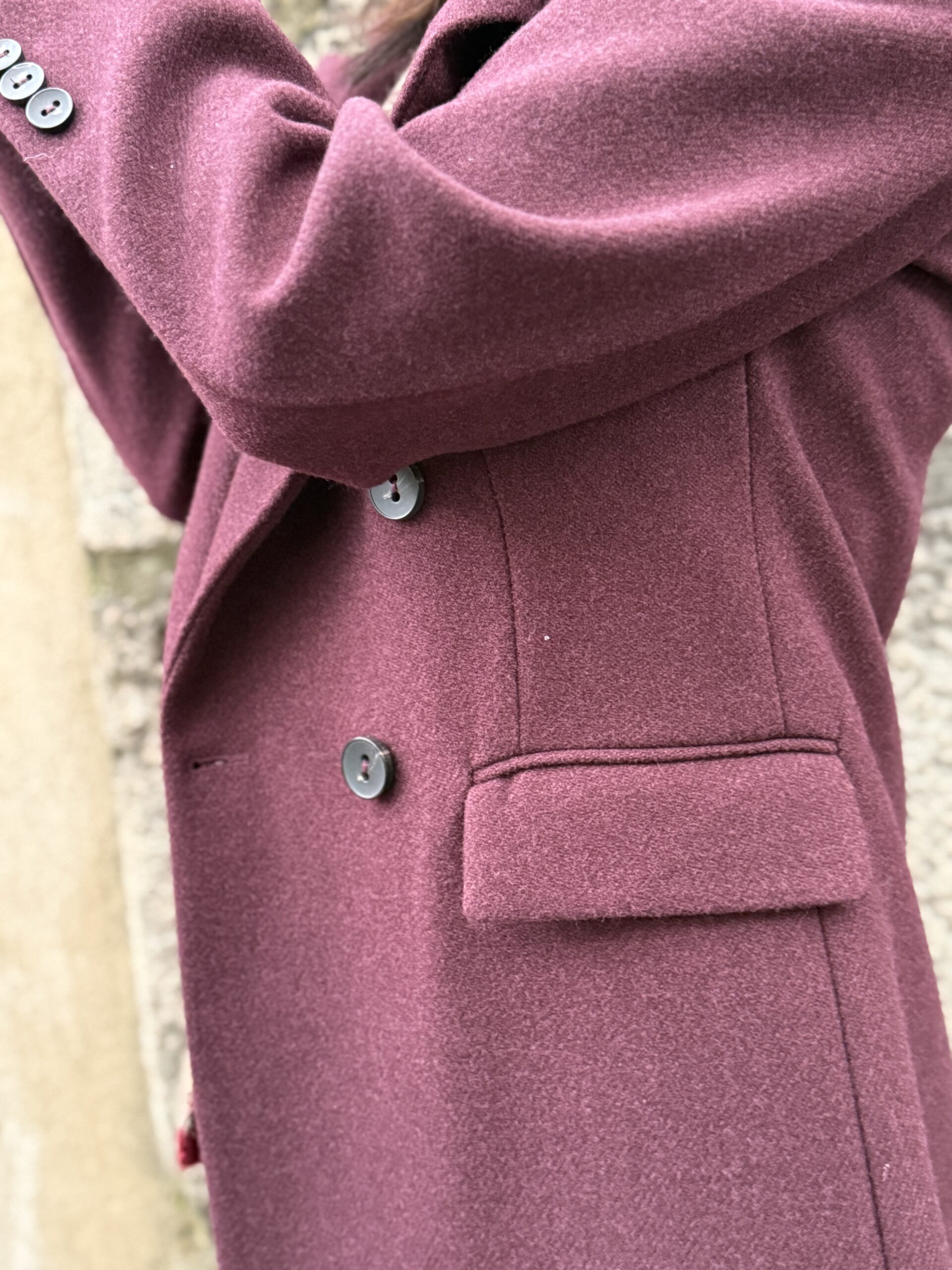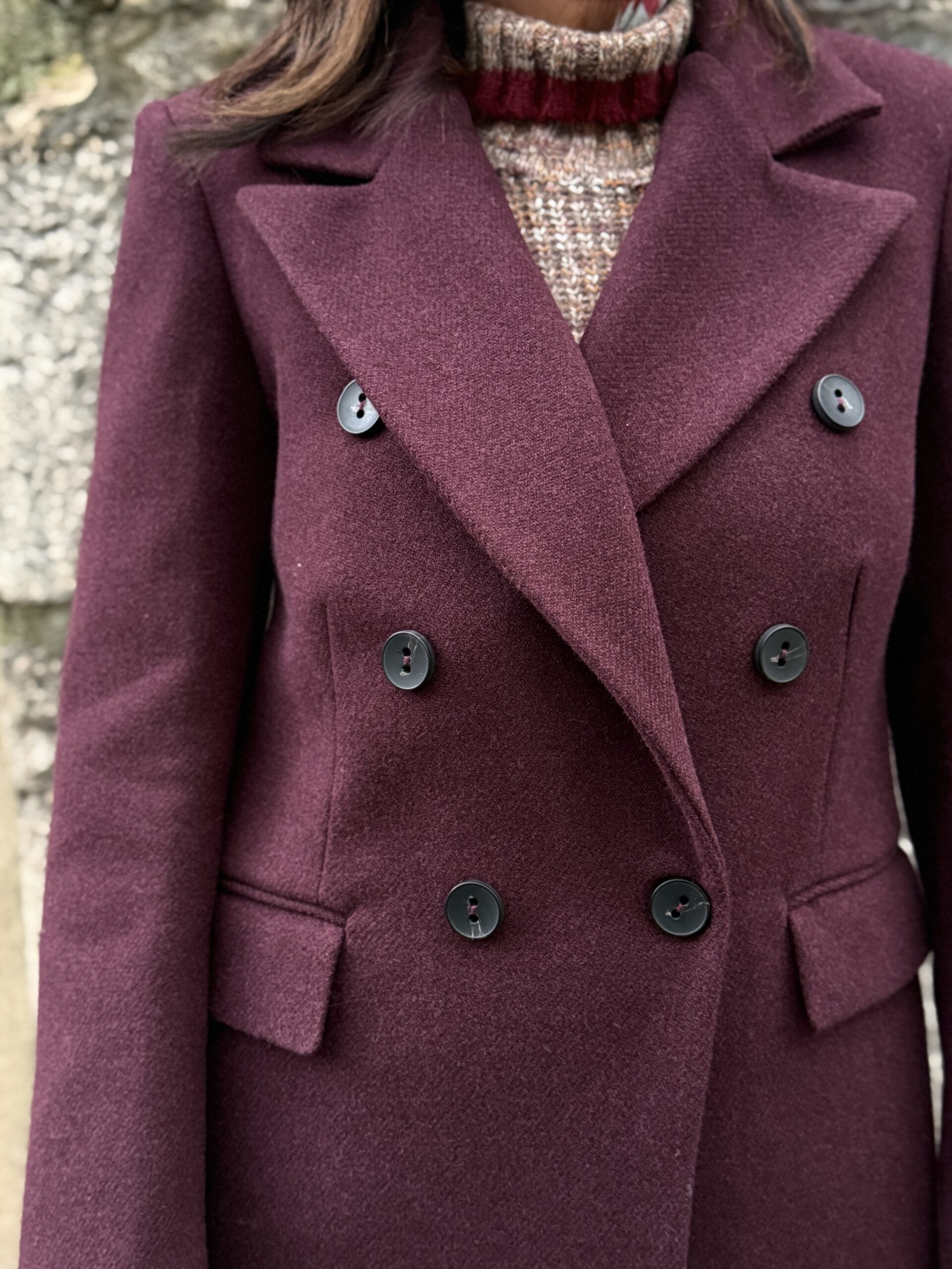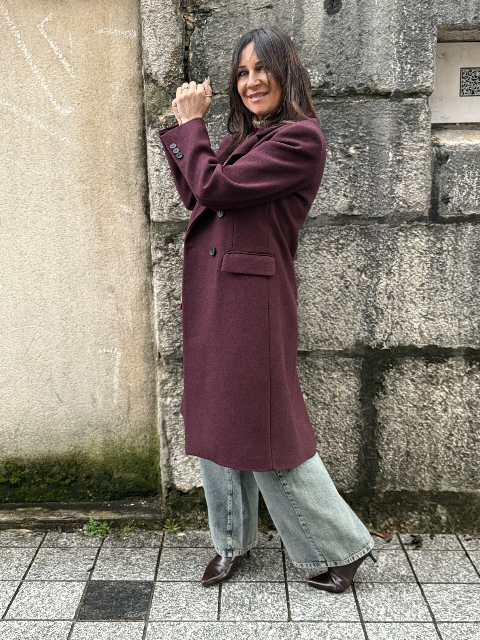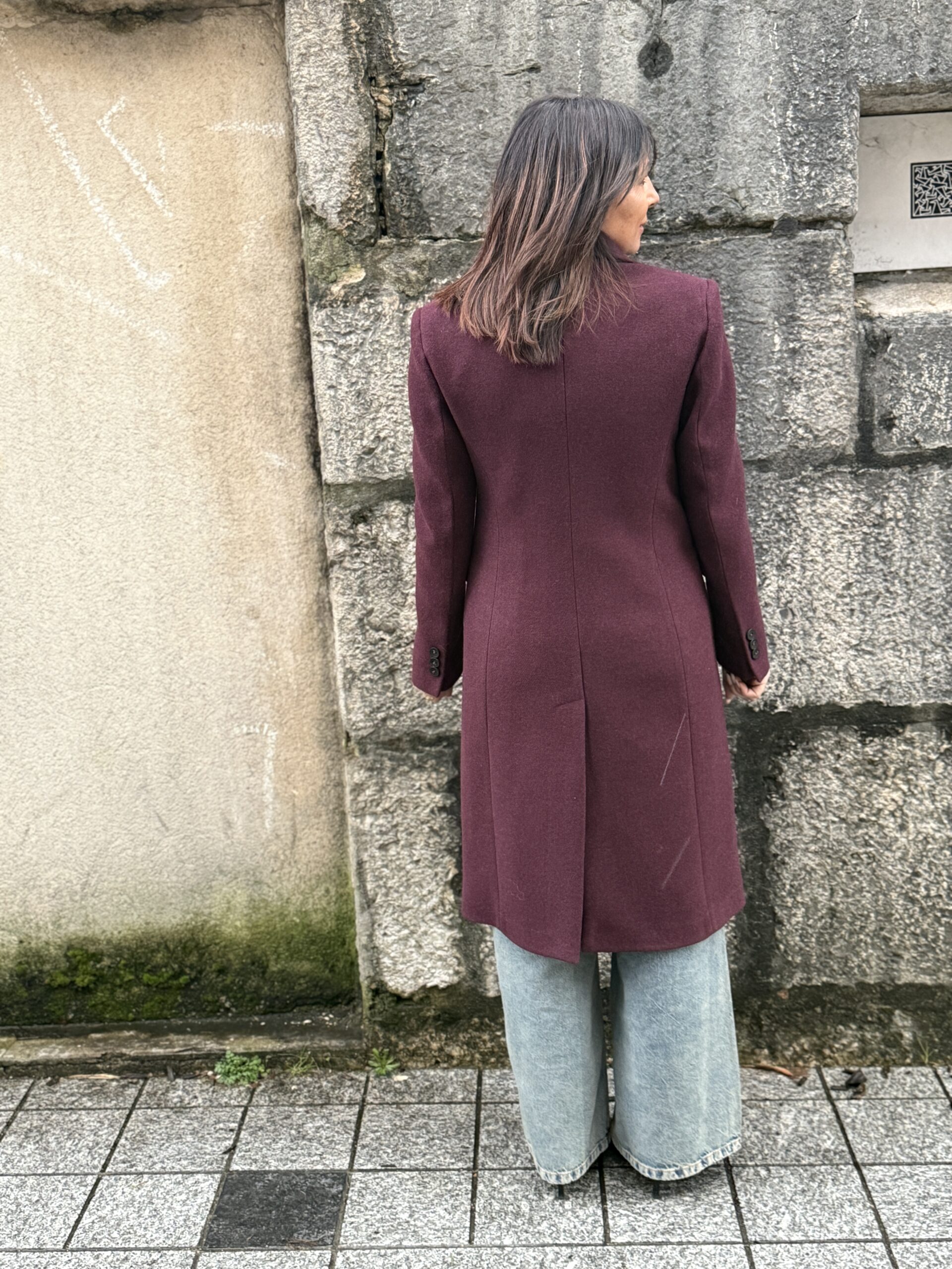 Élégant et intemporel, ce manteau long bordeaux, séduit par sa coupe droite structuré et son double boutonnage classique!