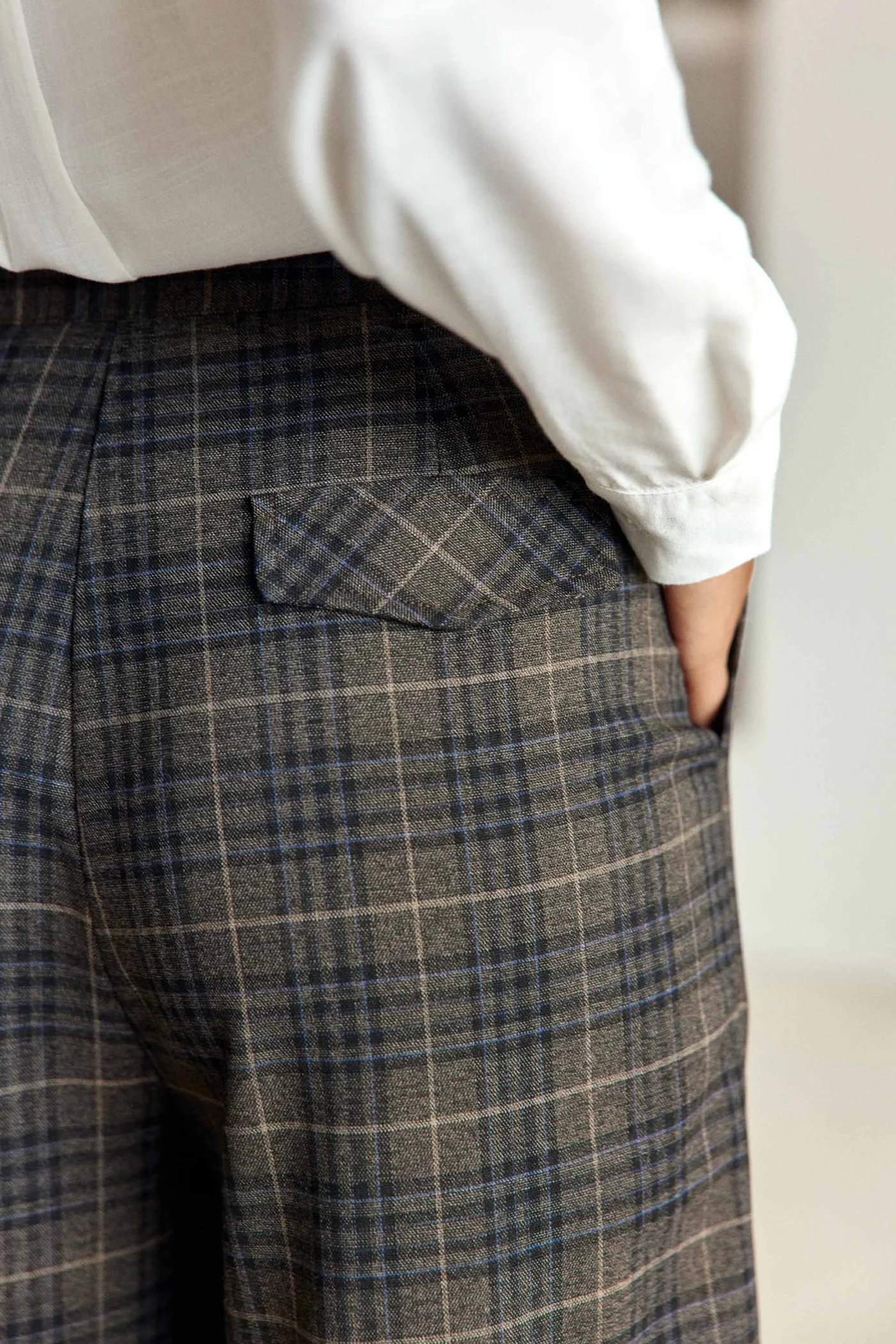 Le pantalon à carreaux à coupe droite et à plis, avec poches italiennes et fermeture zip et boutons.