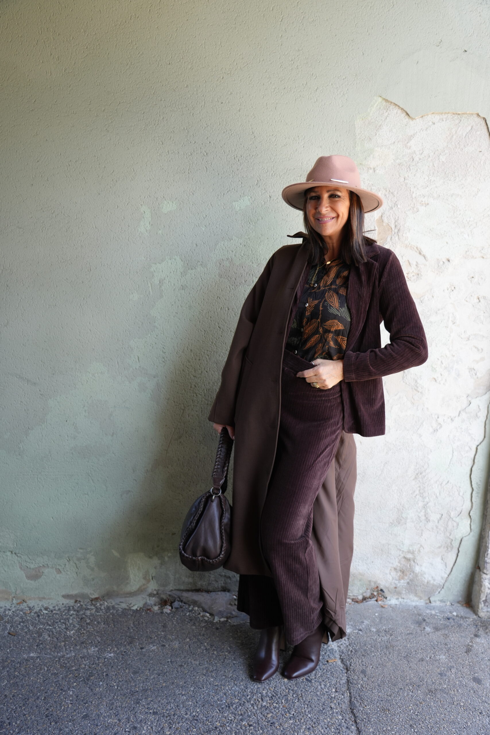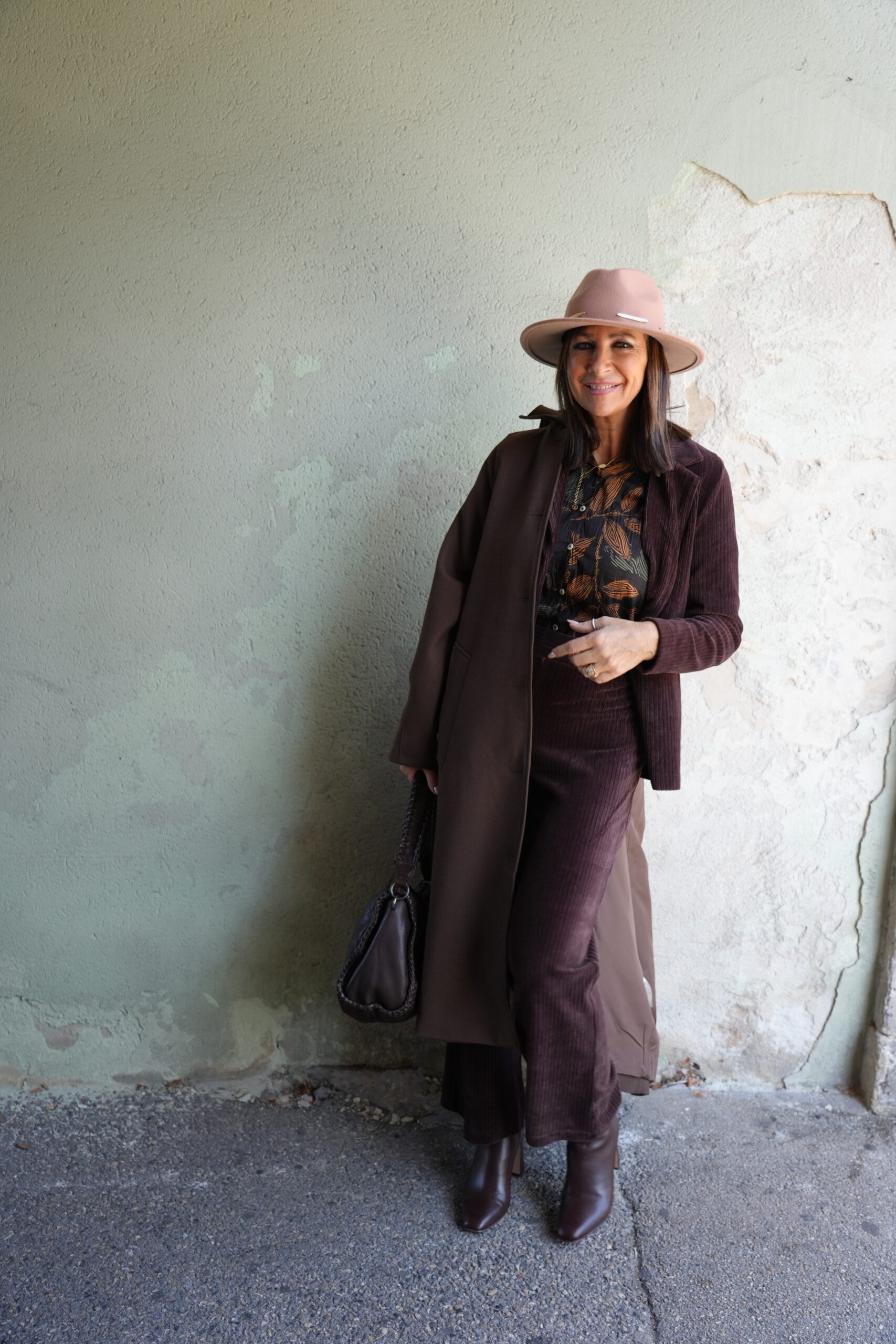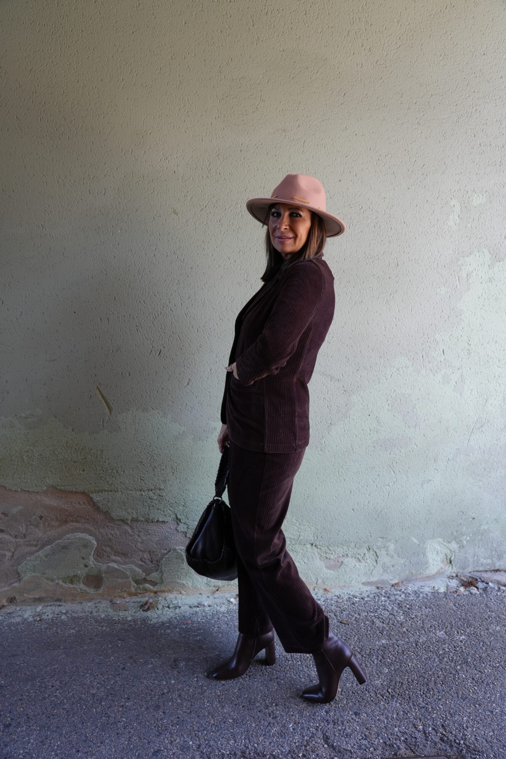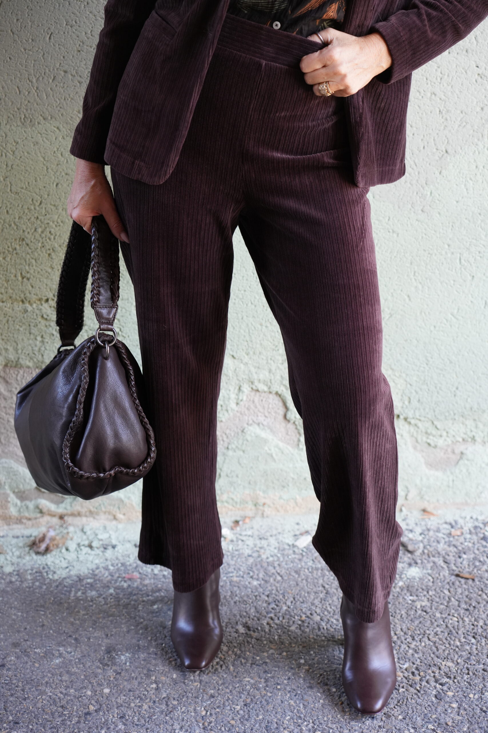 Ce pantalon en velours côtelé allie confort et élégance avec une coupe droite et une taille haute flatteuse. Associé à la veste assortie, il forme un ensemble tailleur moderne et raffiné
