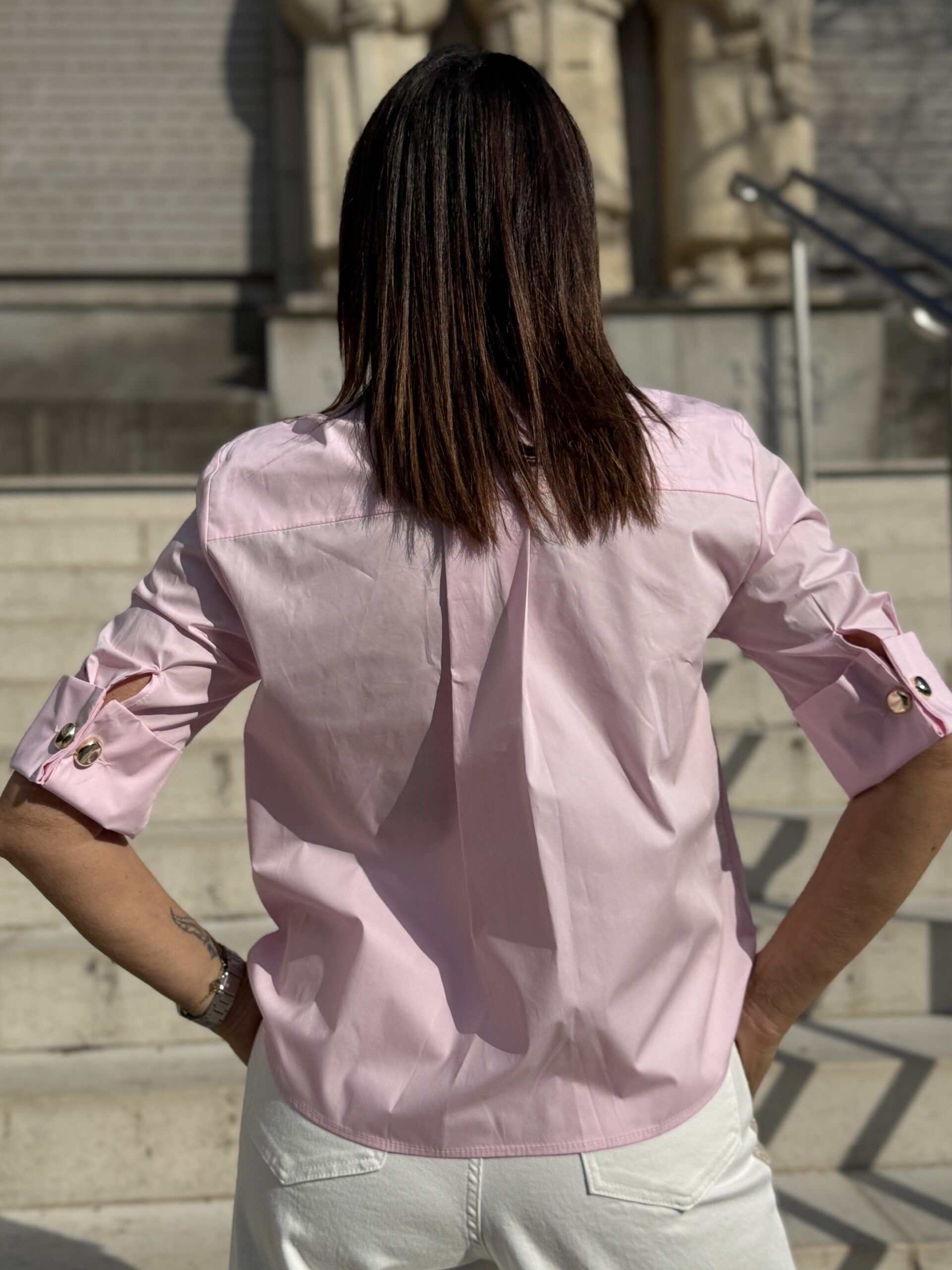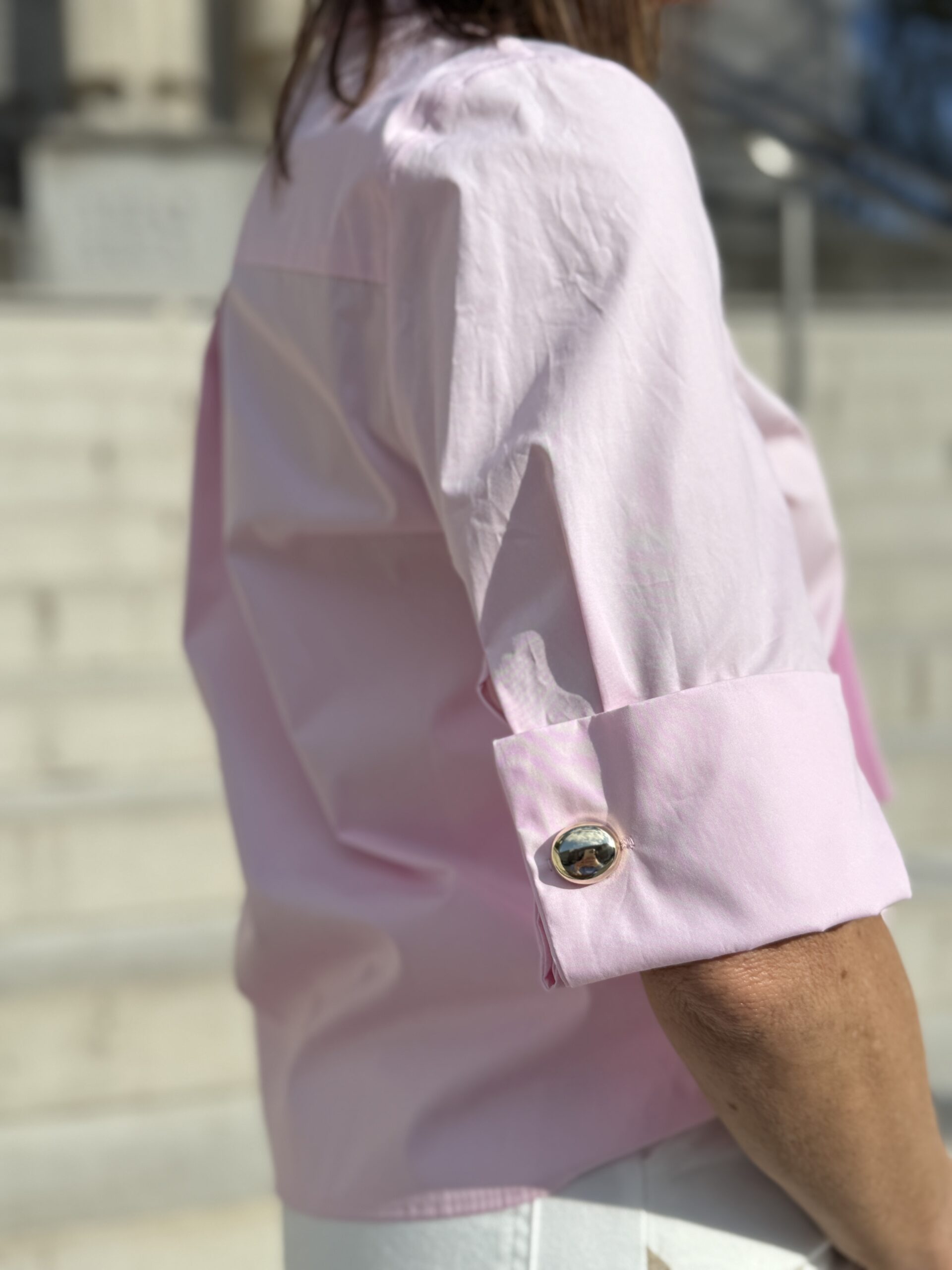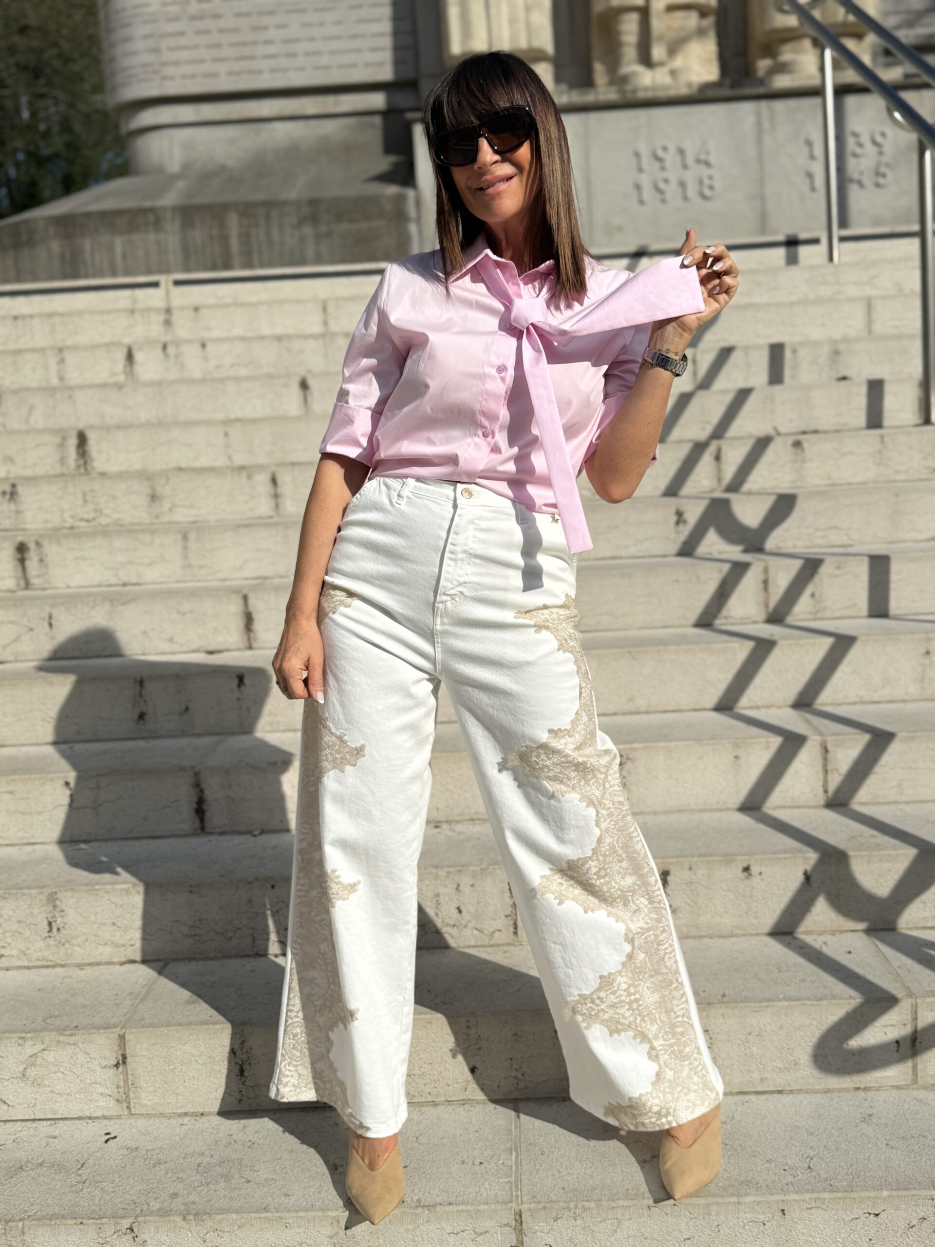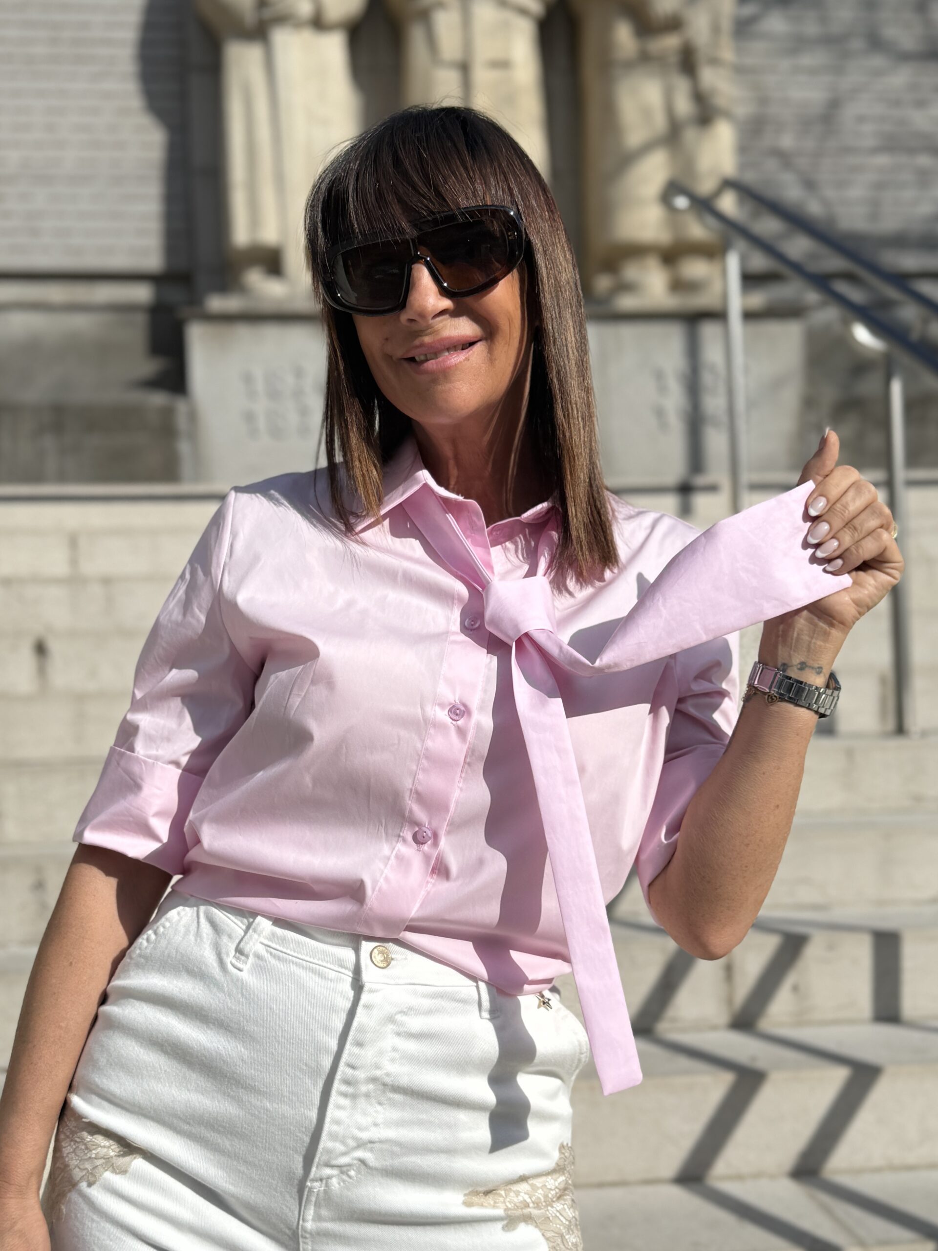 Chemise contemporaine au design affirmé, cette pièce revisite la chemise classique avec un col large structuré et une cravate ton sur ton intégrée. Sa coupe ample, et ses manches courtes à larges poignées apportent une allure moderne et élégante. Le détail du bouton doré, ajoute une touche sophistiquée.