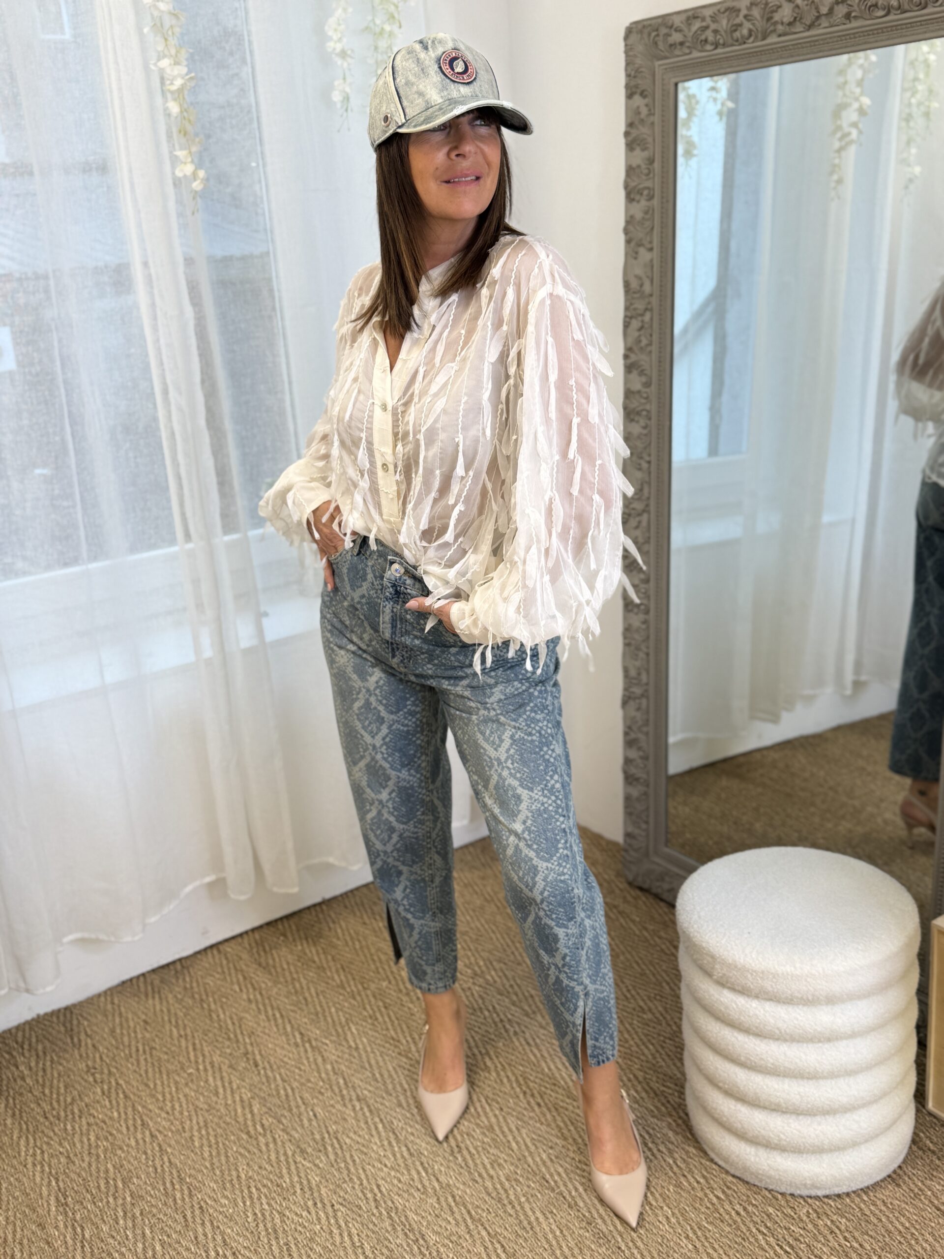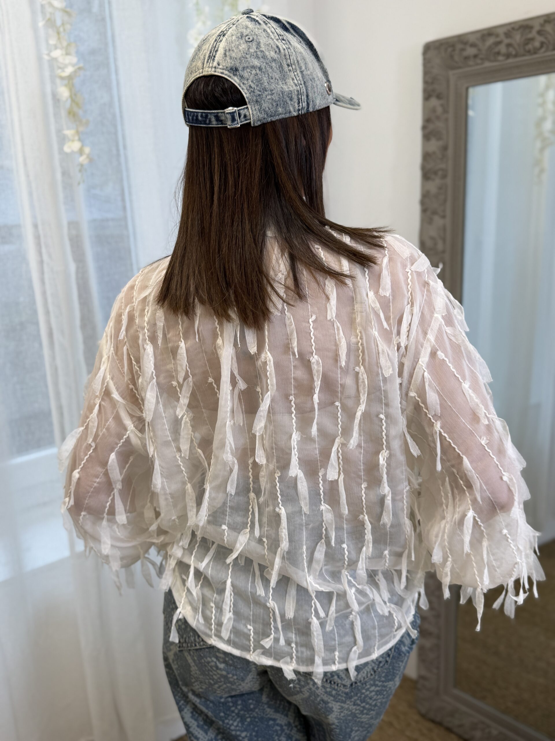 Délicate et aérienne, cette chemise en voile texturée séduit par son jeu de transparence et ses détails en relief façon plumes.