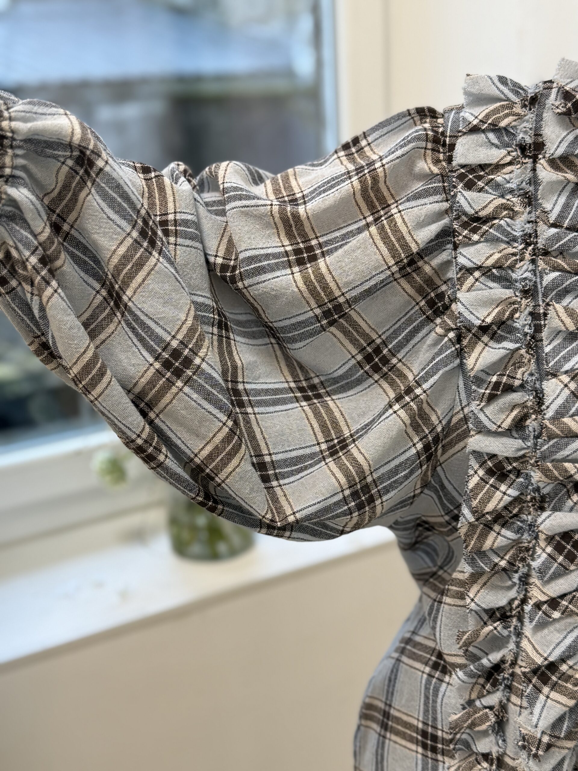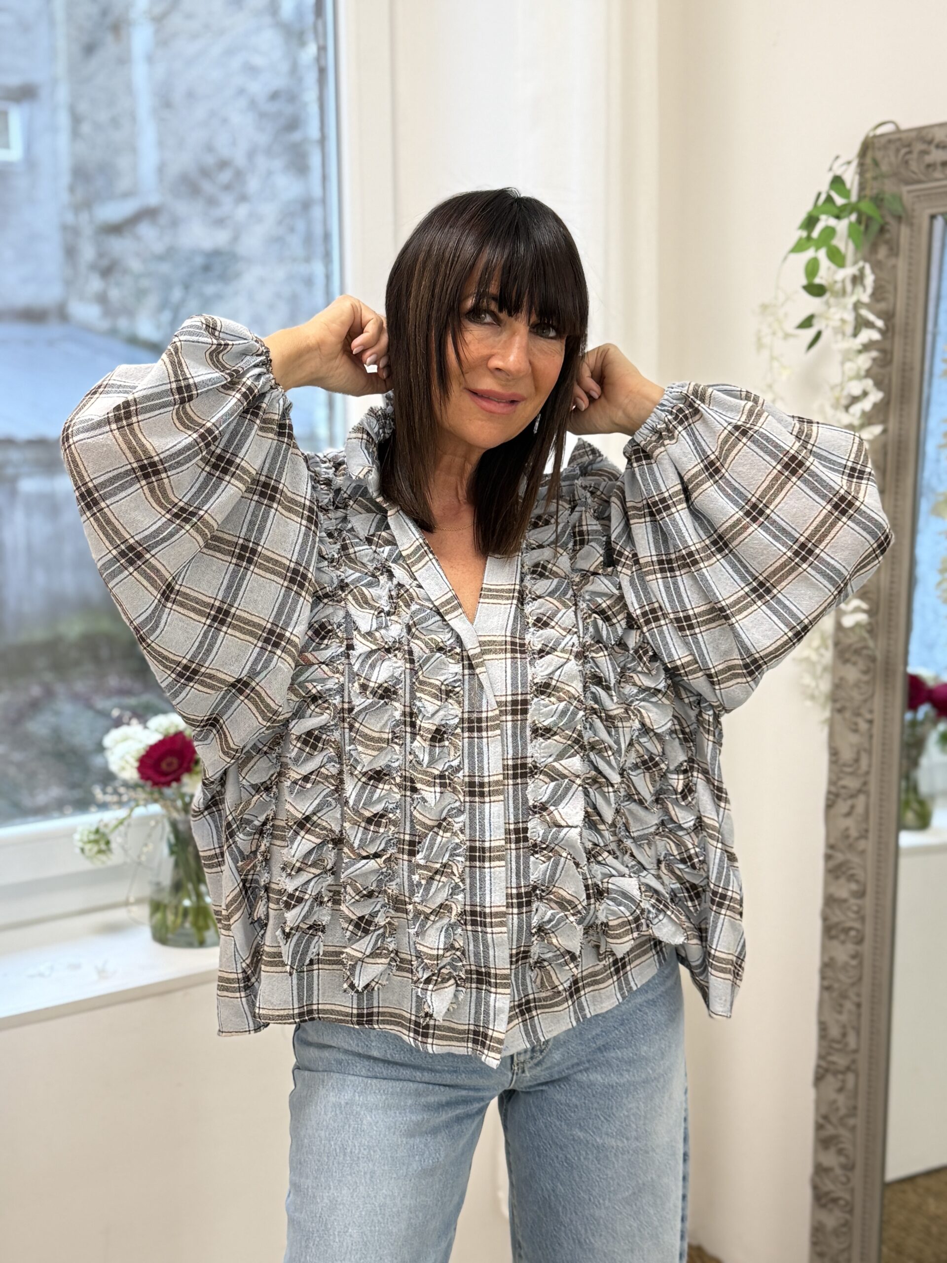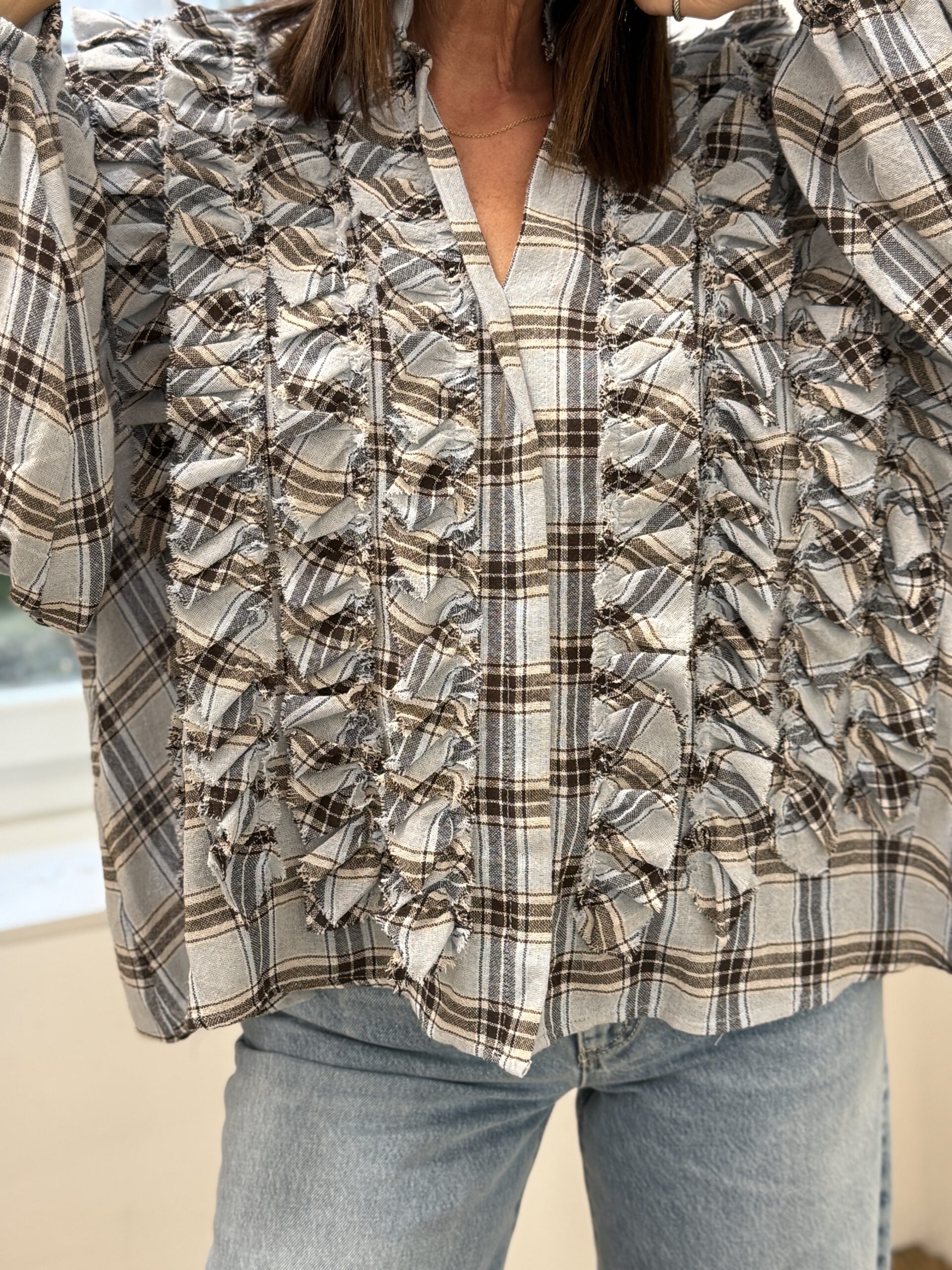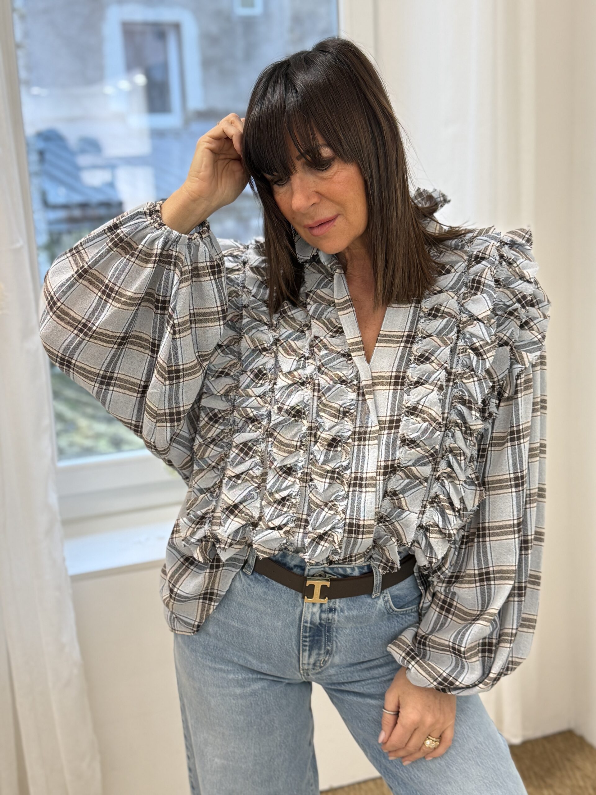Blouse statement au design audacieux, revisitée avec un travail de matière original. Son motif classique à carreaux contraste élégamment avec les détails effiloché en relief, créant une pièce forte et résolument mode.