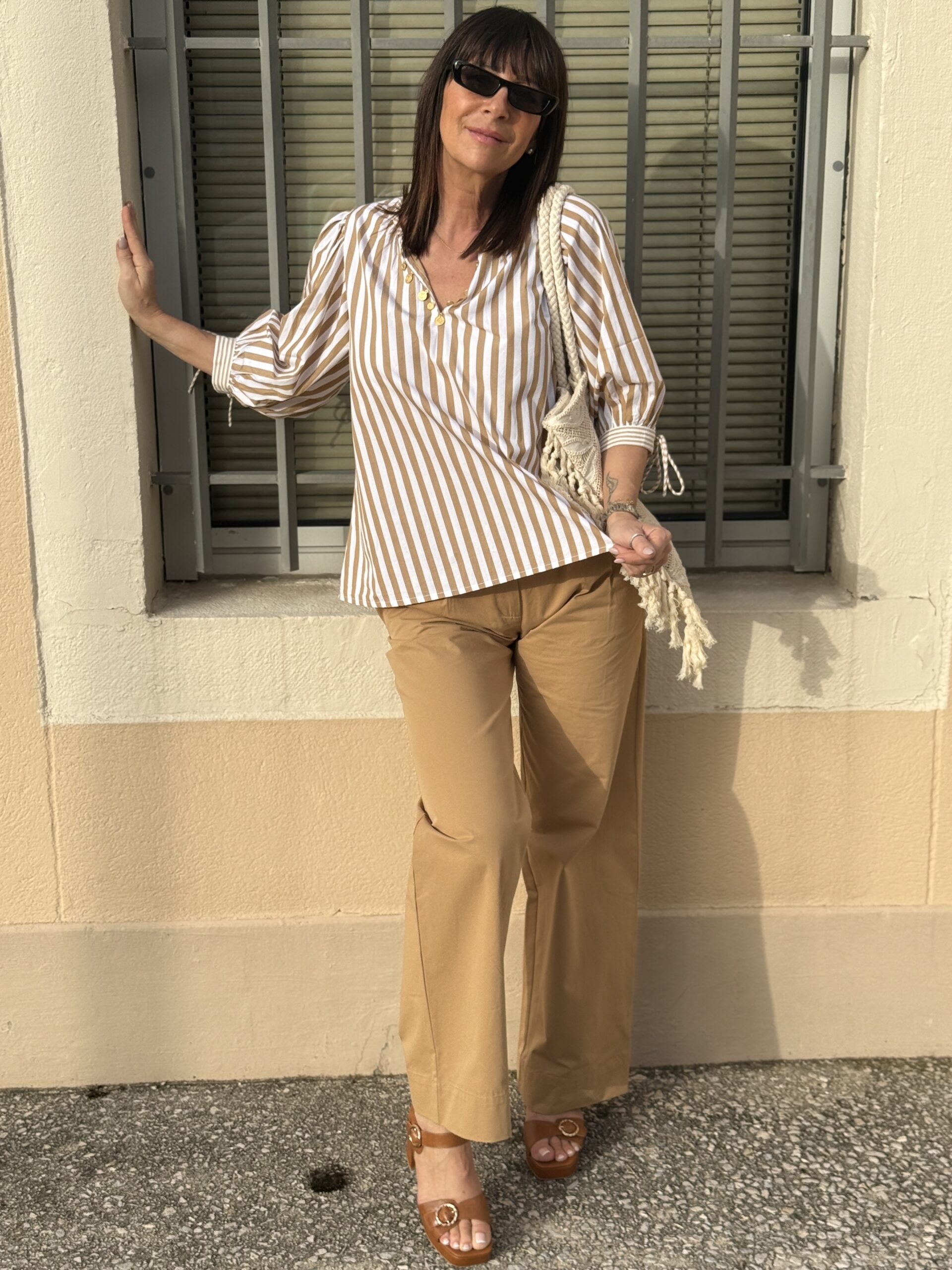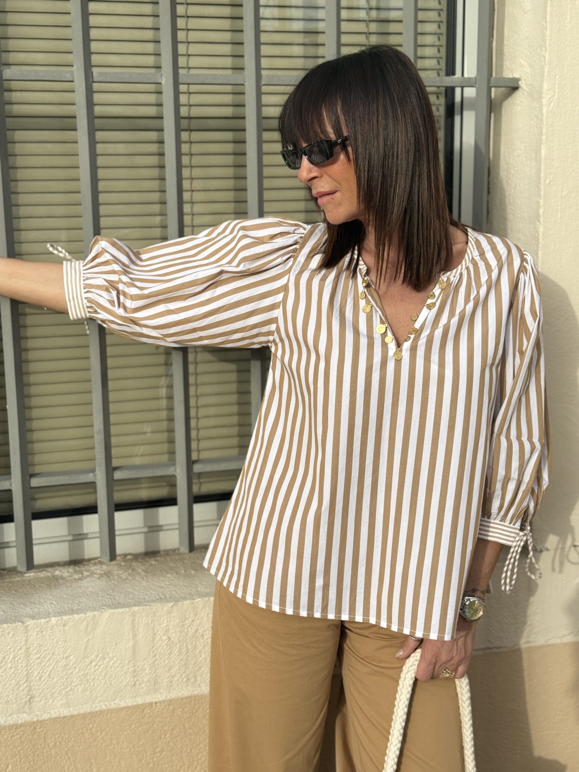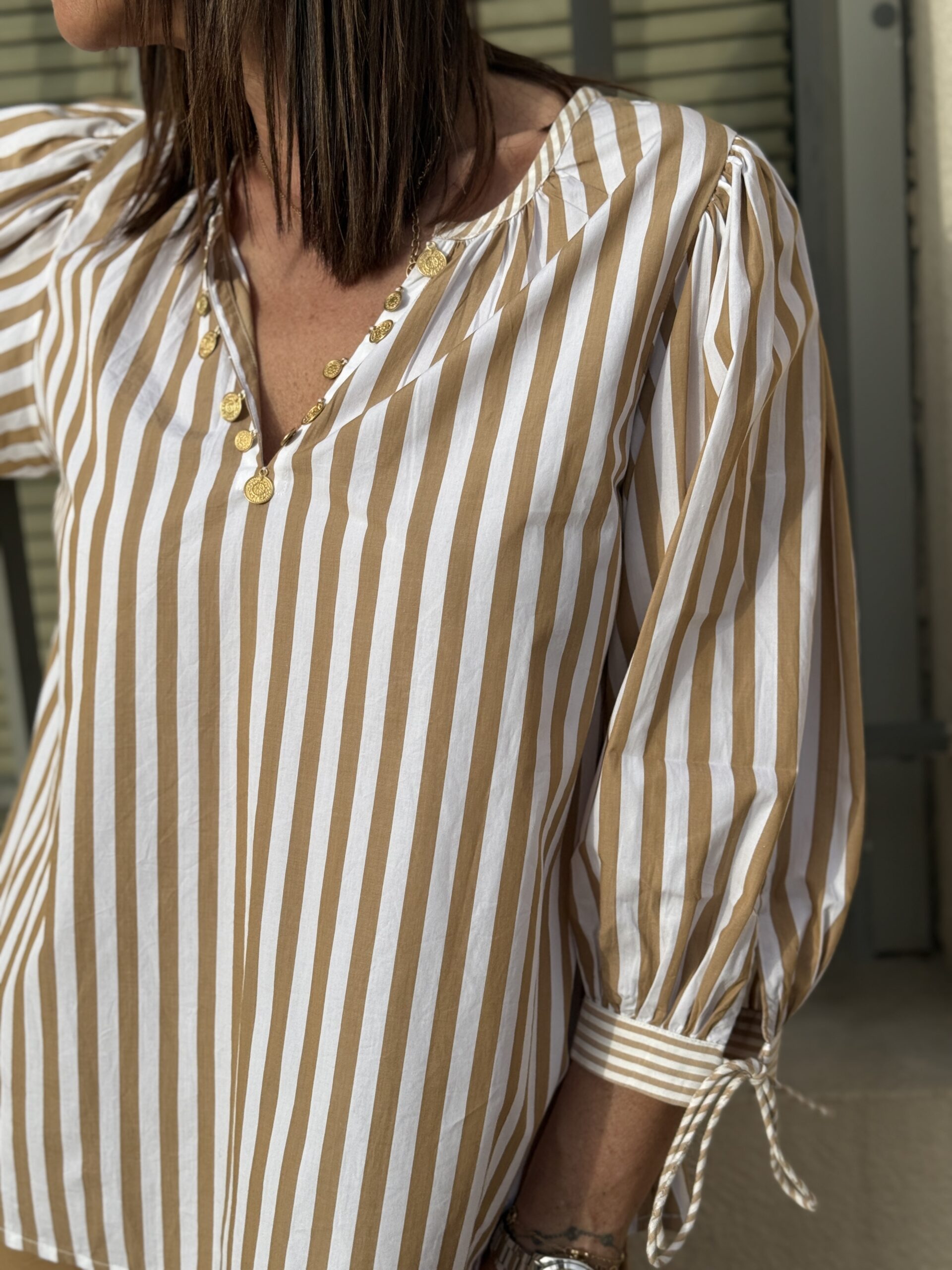 Chic et lumineuse, cette blouse rayée sable et écru apporte une touche élégante et naturelle à votre dressing