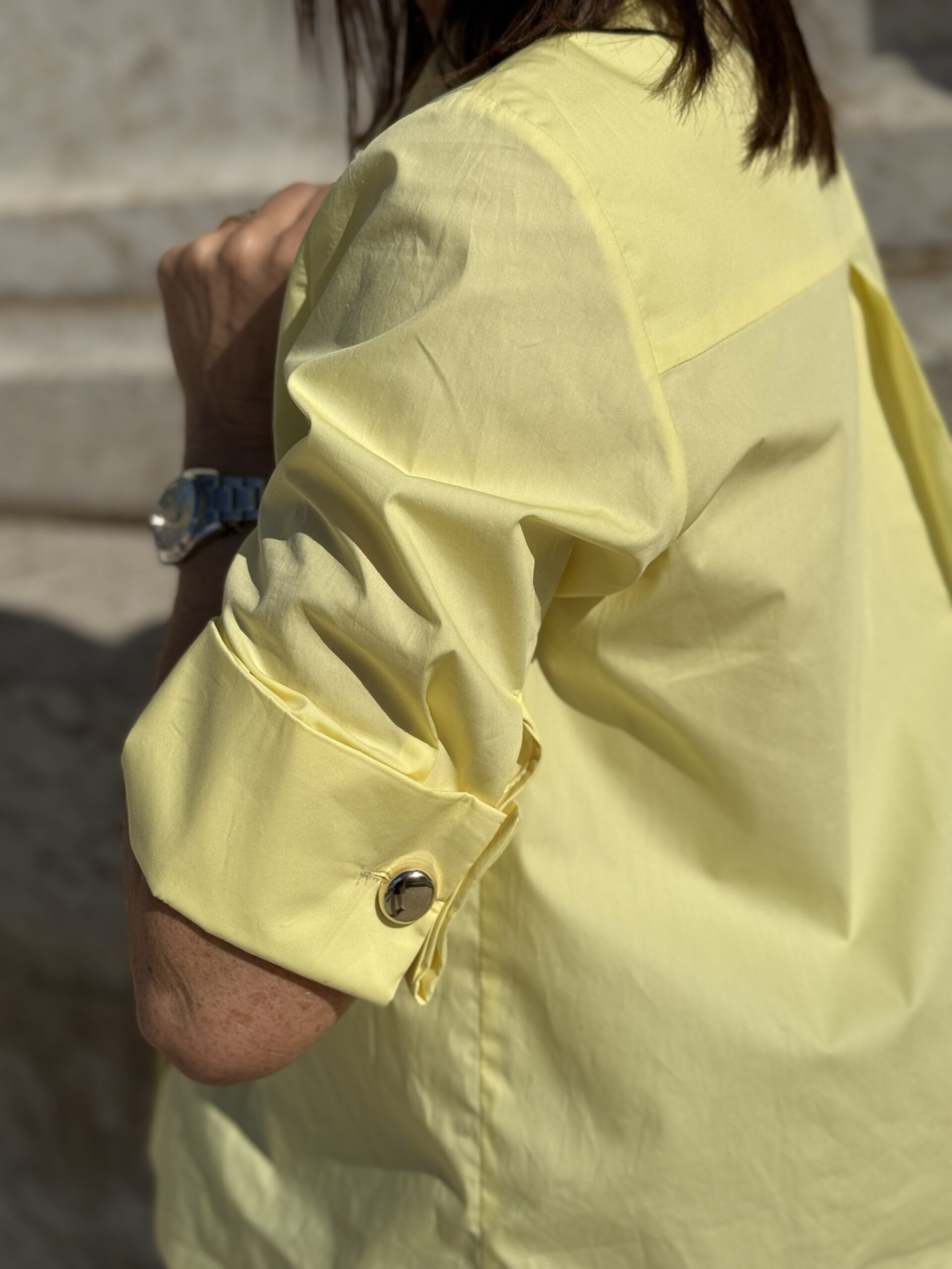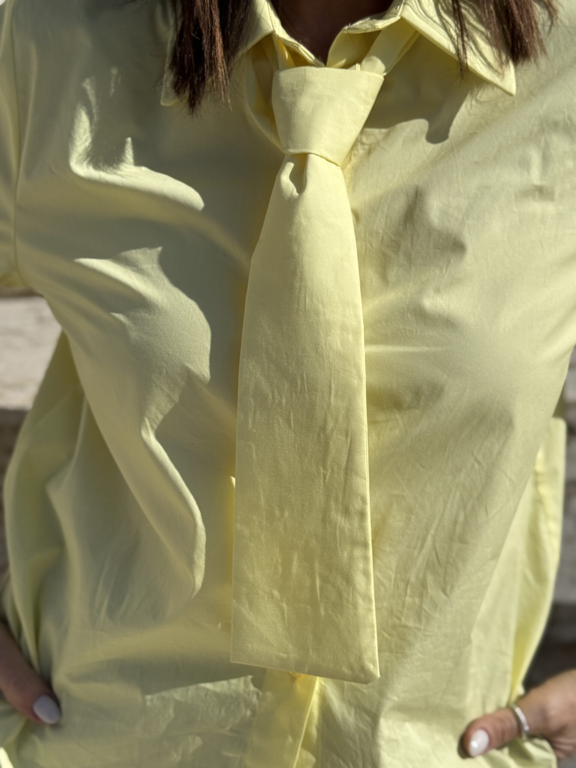 Chemise contemporaine au design affirmé, cette pièce revisite la chemise classique avec un col large structuré et une cravate ton sur ton intégrée. Sa coupe ample, et ses manches courtes à larges poignées apportent une allure moderne et élégante. Le détail du bouton doré, ajoute une touche sophistiquée.