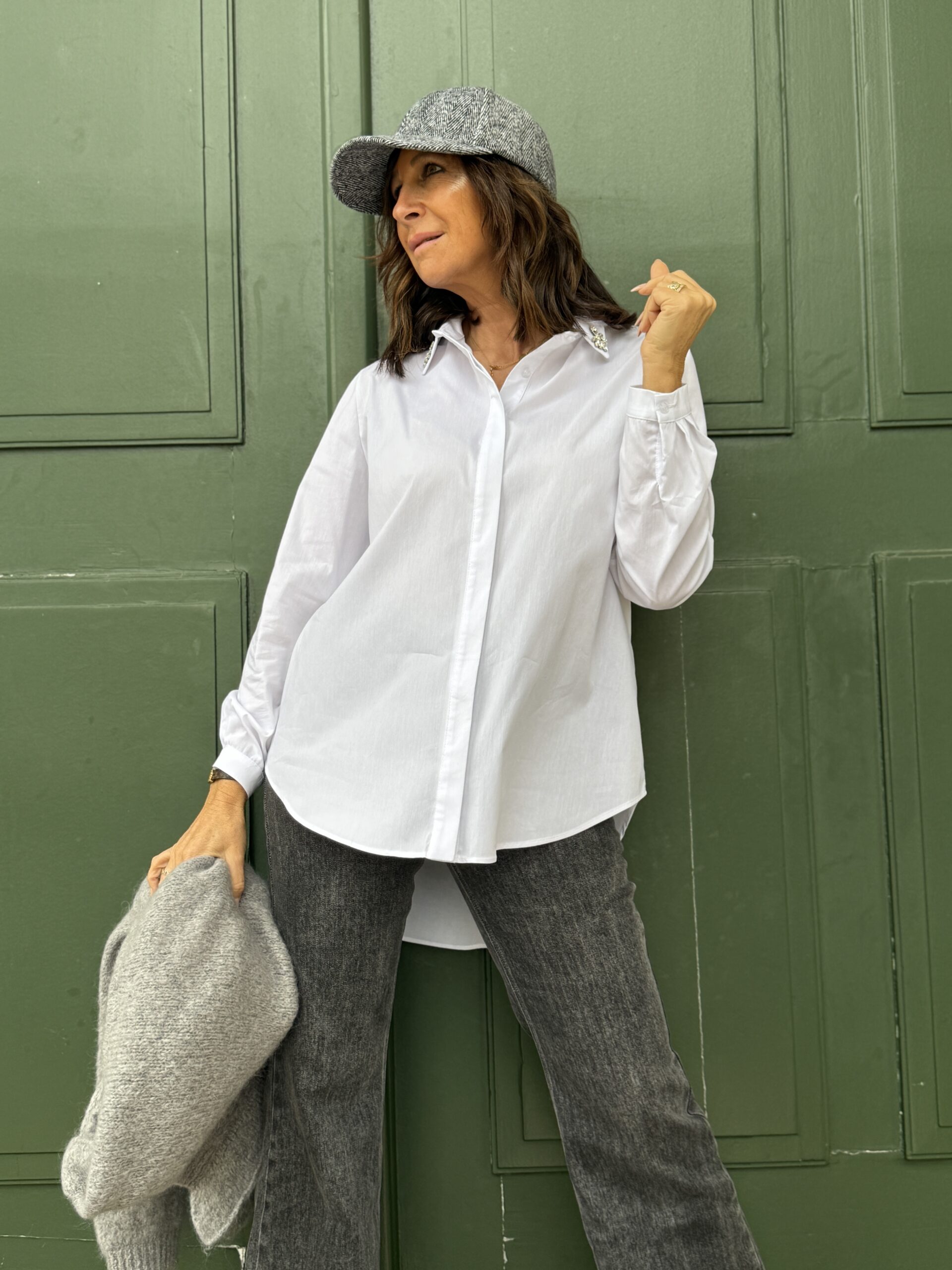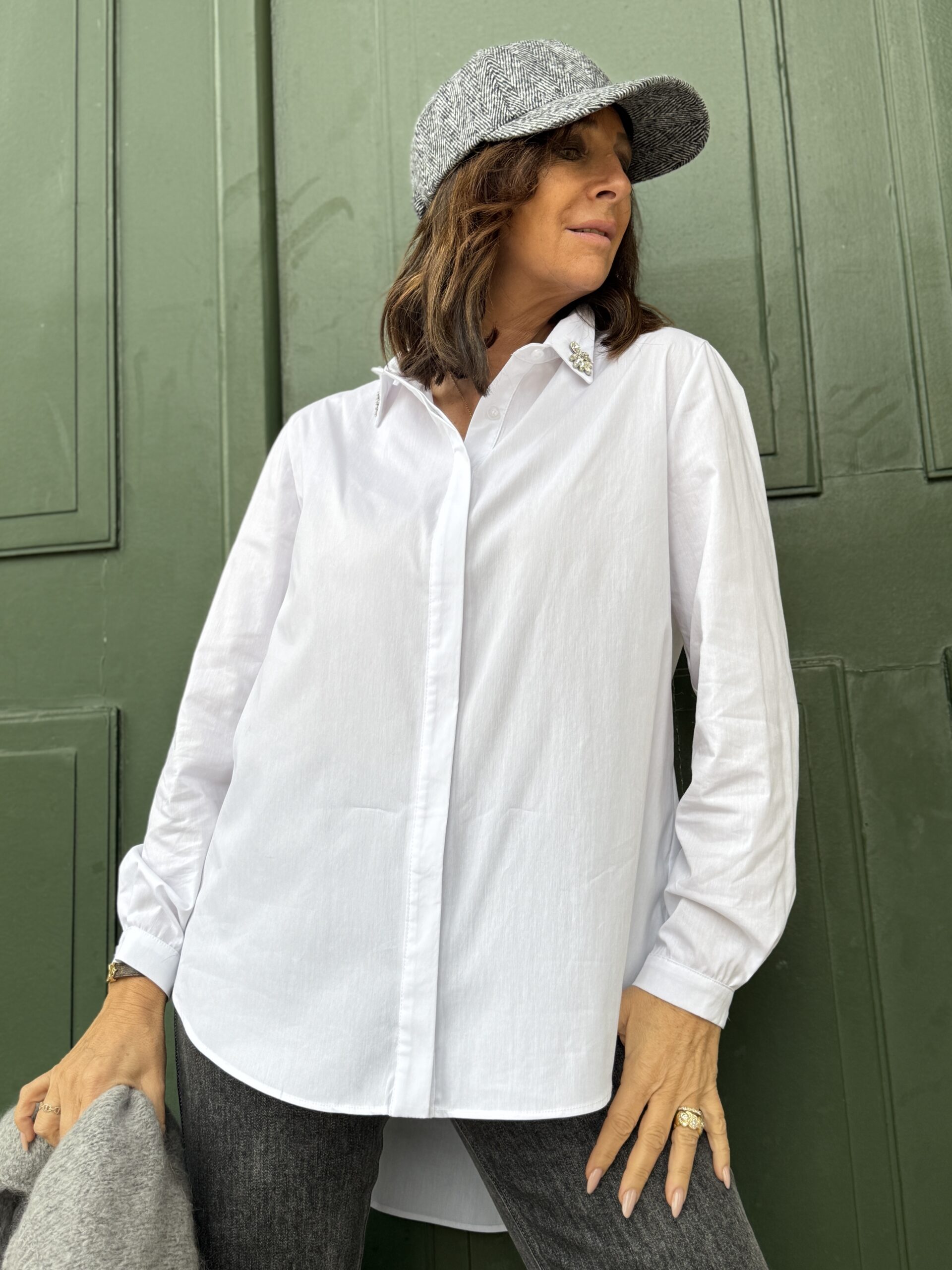 Élégante et intemporelle, cette chemise blanche revisite un classique du vestiaire féminin avec une touche raffinée grâce à son col ornée de bijoux.