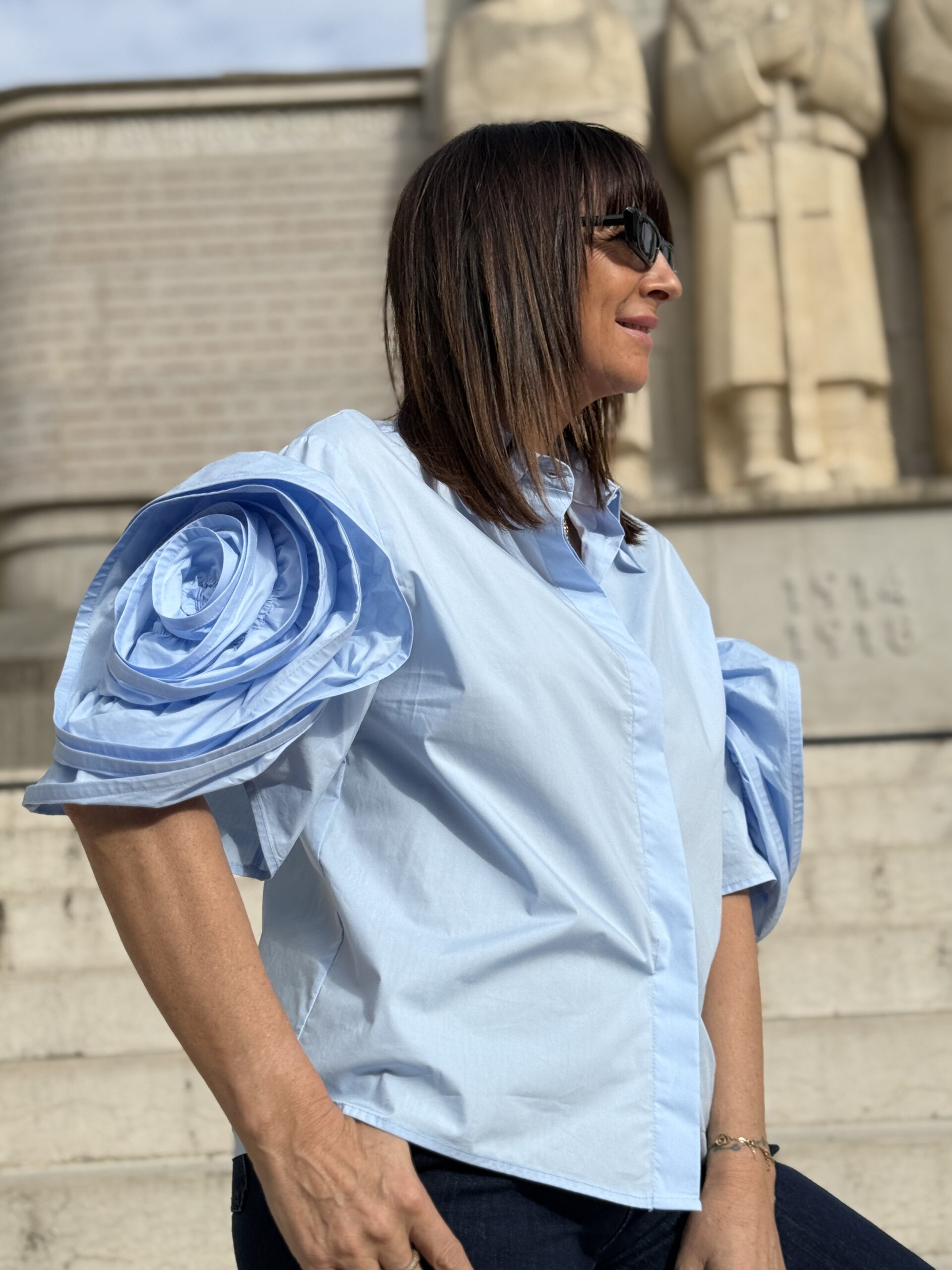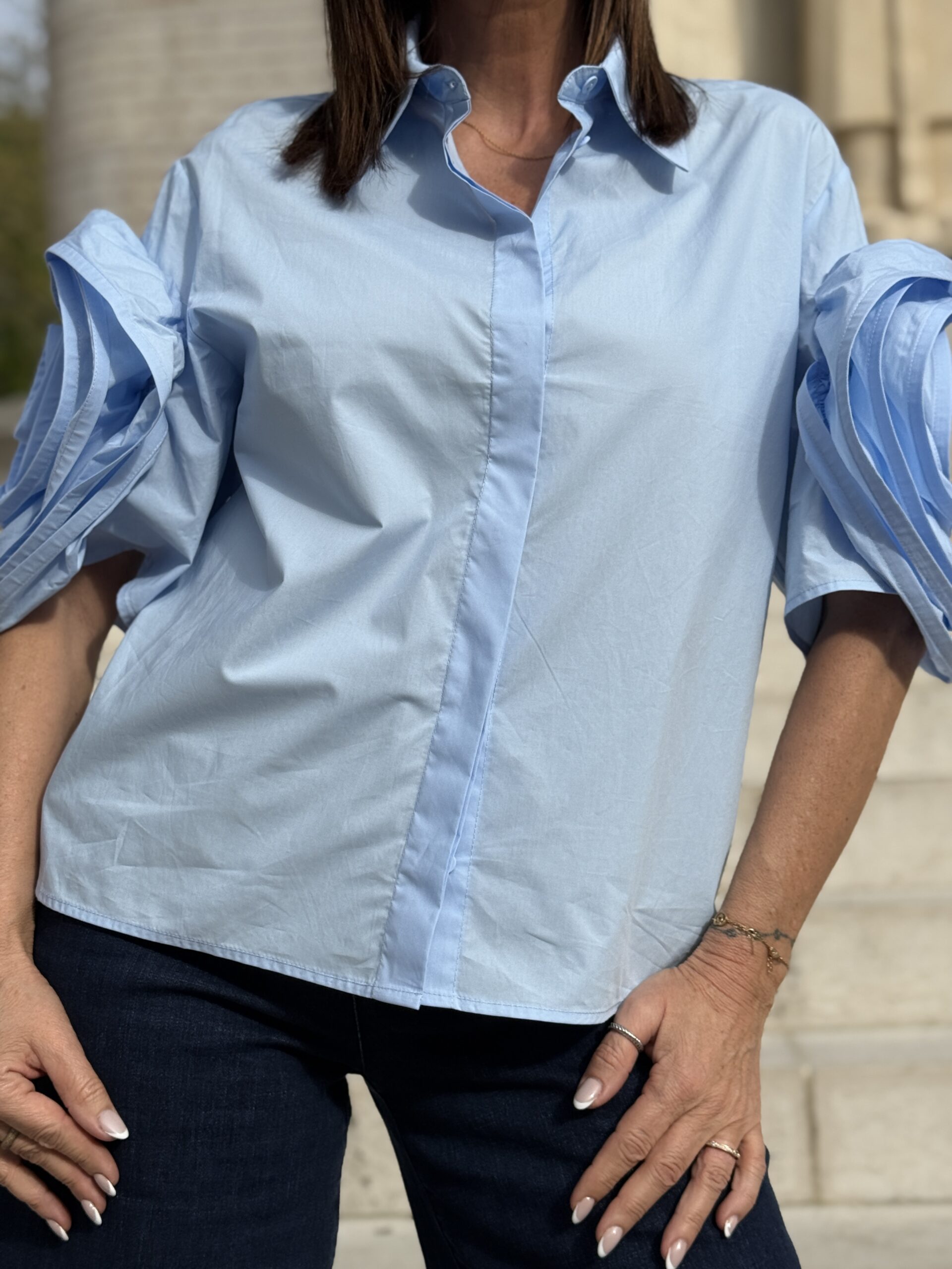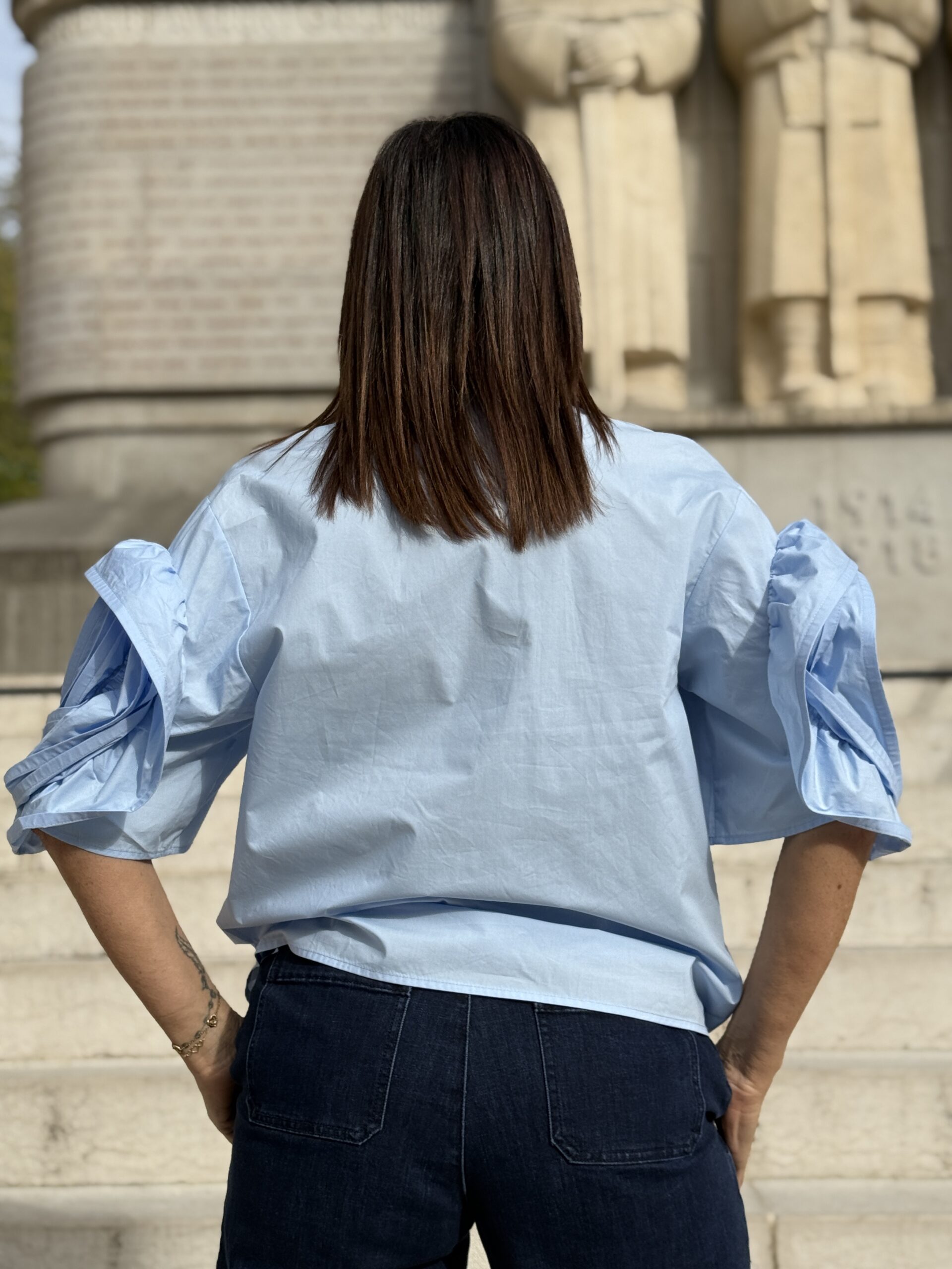 Chemise blanche revisitée avec des manches courtes volumineuse au design structuré et féminin.