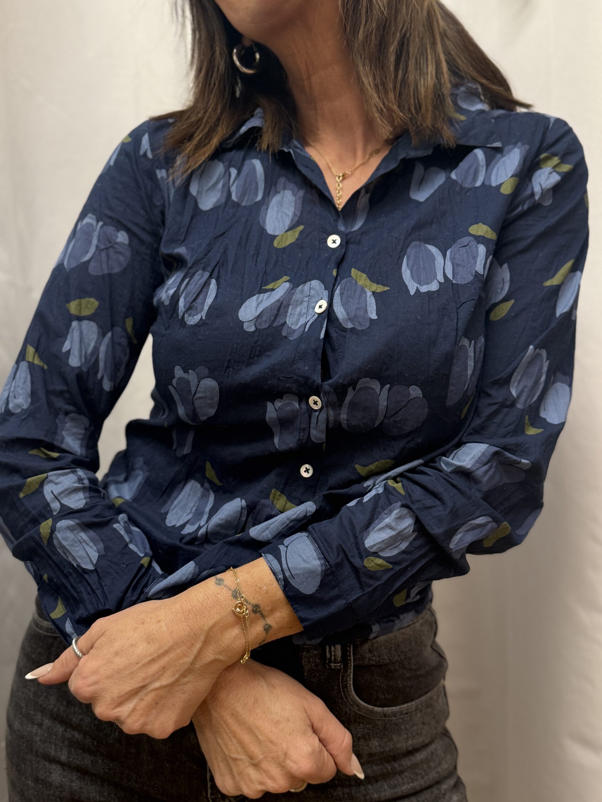 Élégante et moderne, cette chemise effet froissée pour femme se distingue par son tissu bleu nuit agrémenté d’un motif floral dans des tons de bleu et de vert .