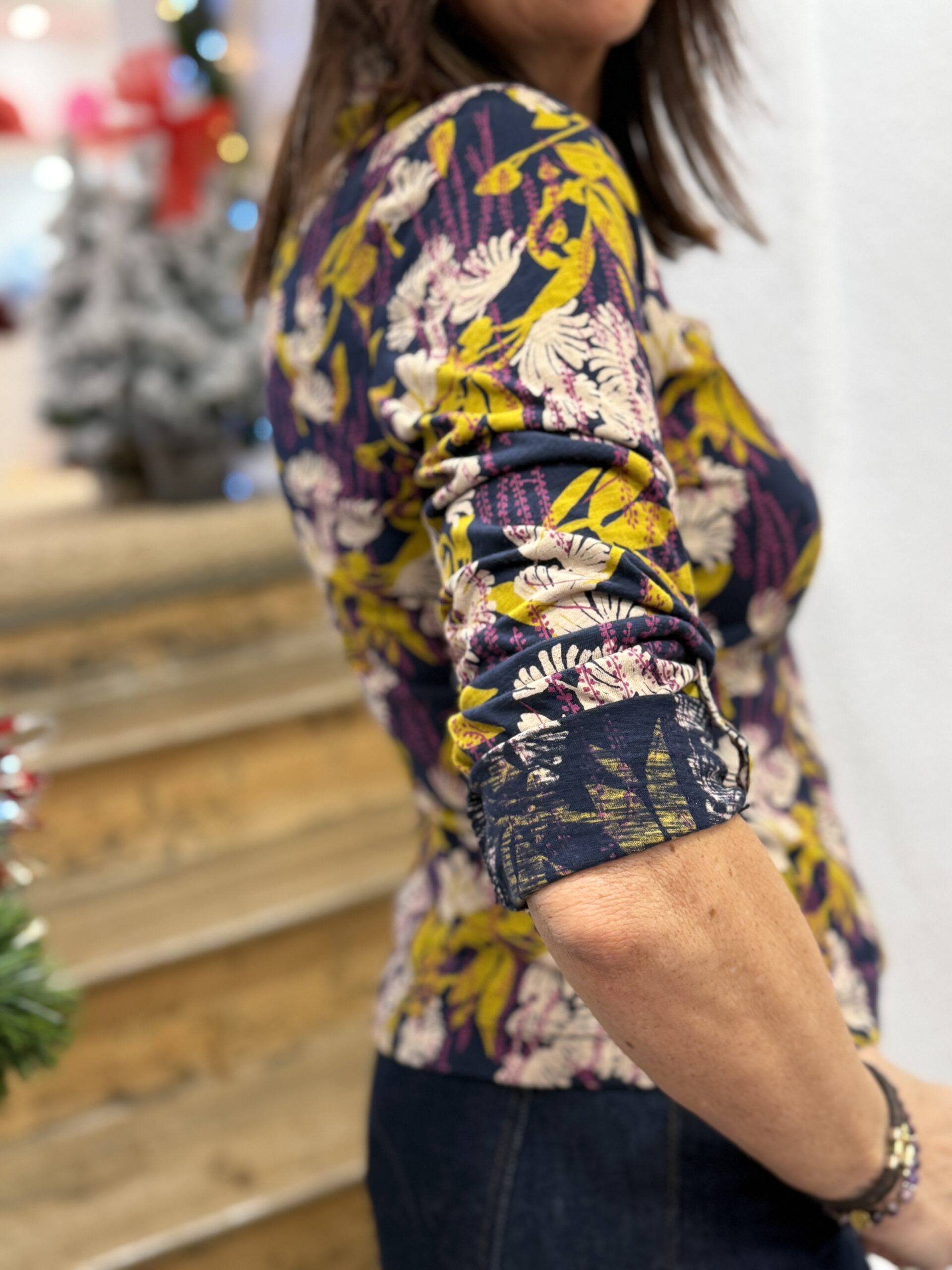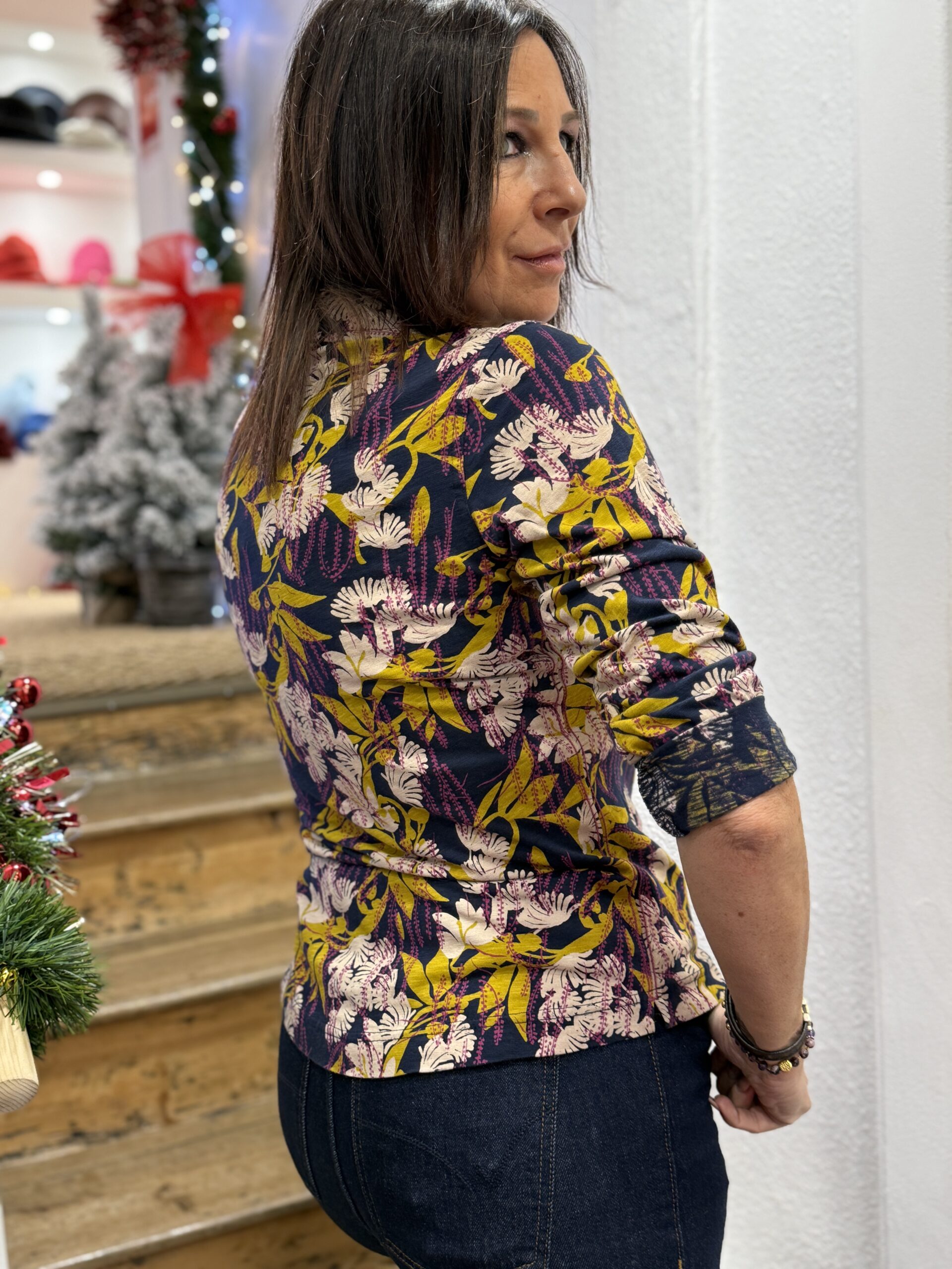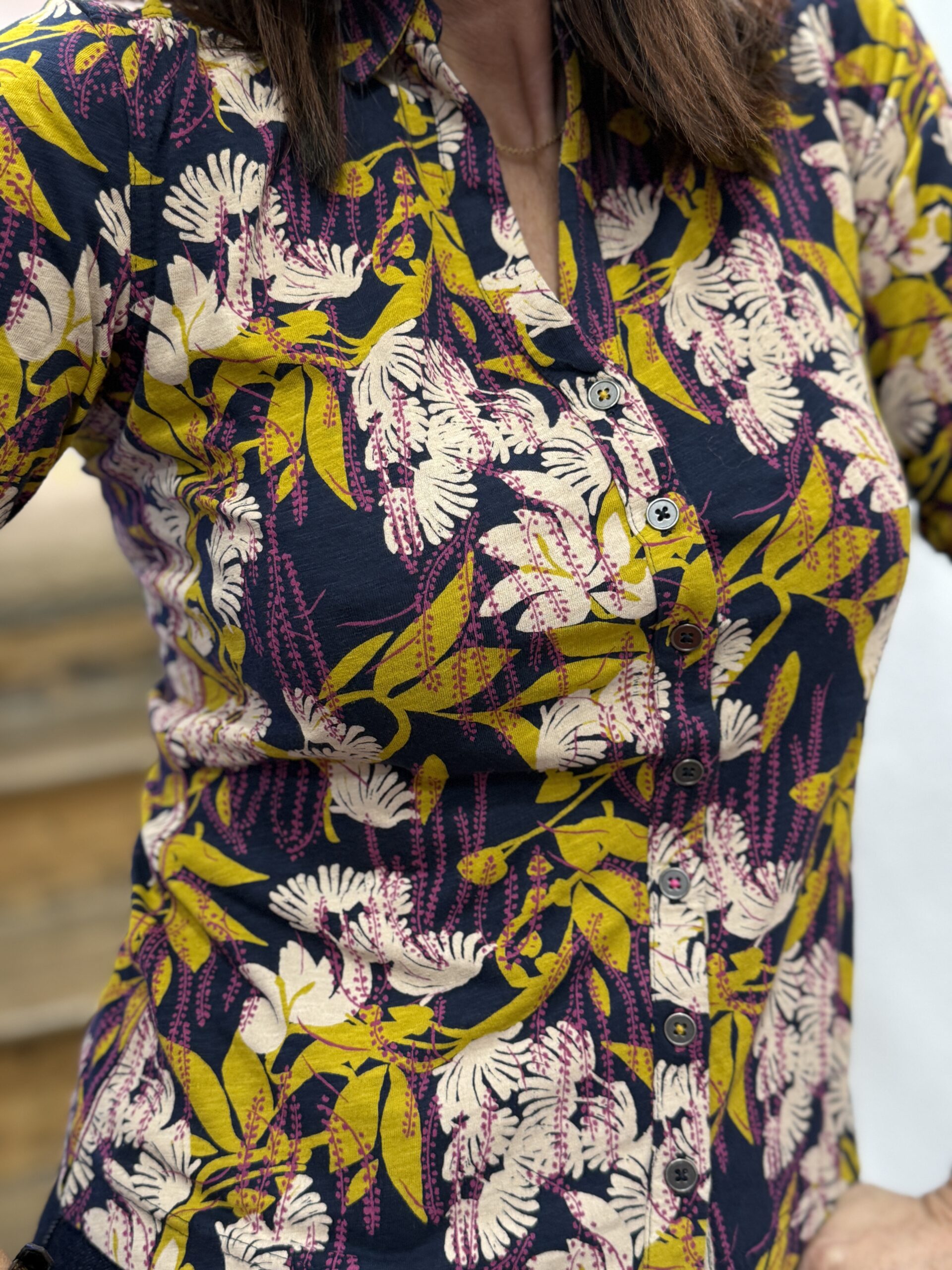 Apportez une touche de fraîcheur à vos tenues avec cette chemise imprimé floral raffiné mêlant des tons de jaune, rose et violet sur fond marine.