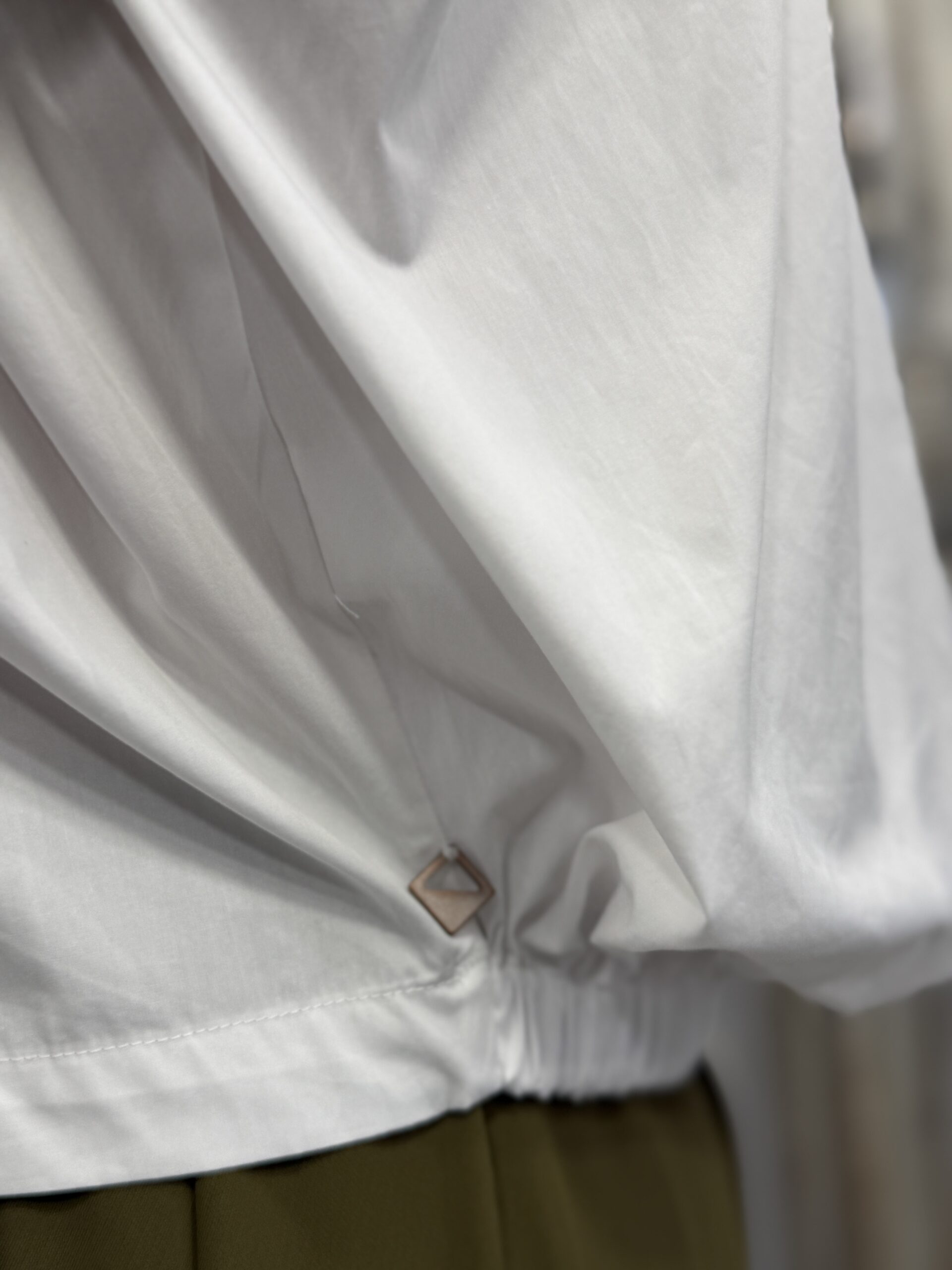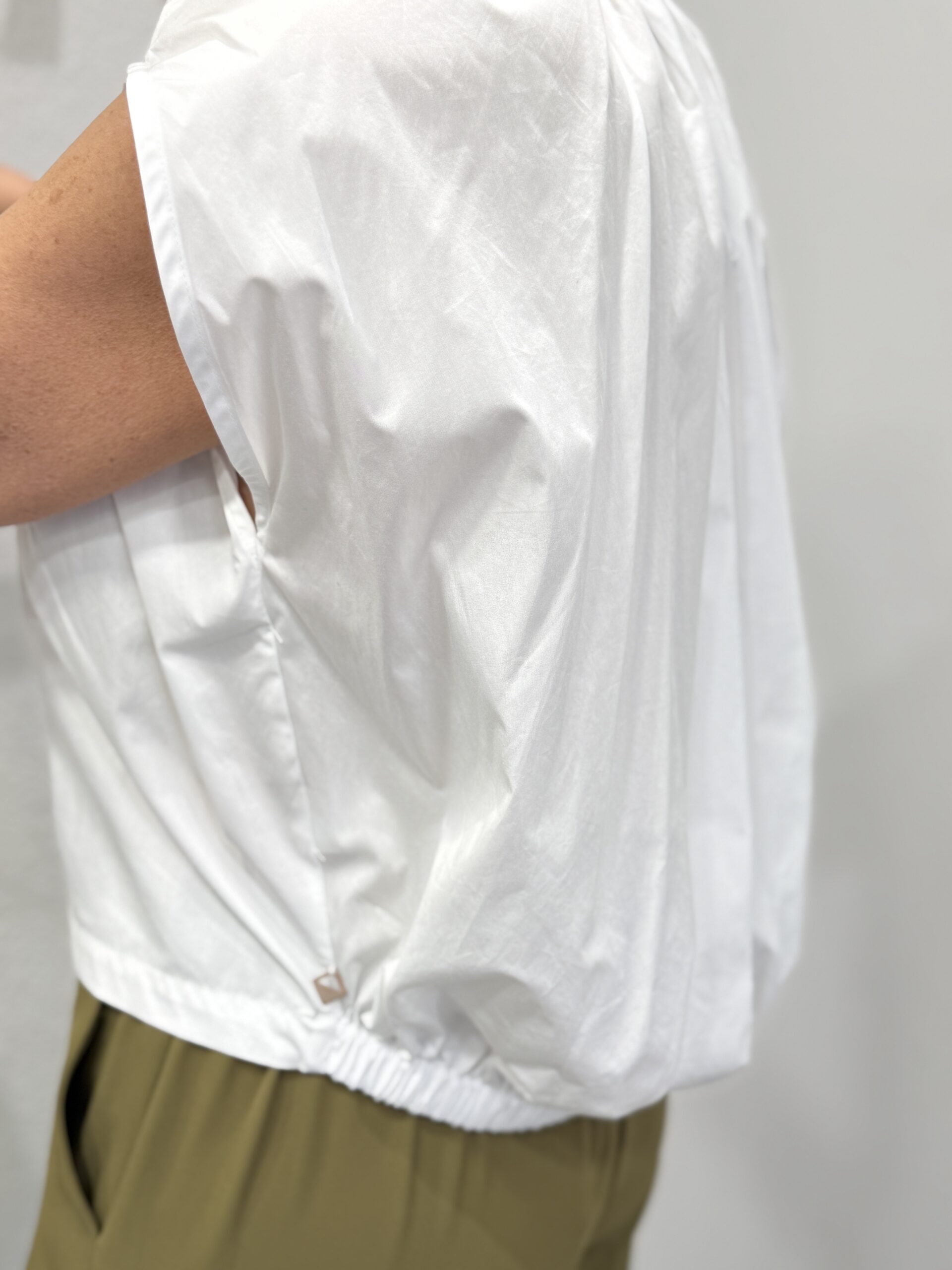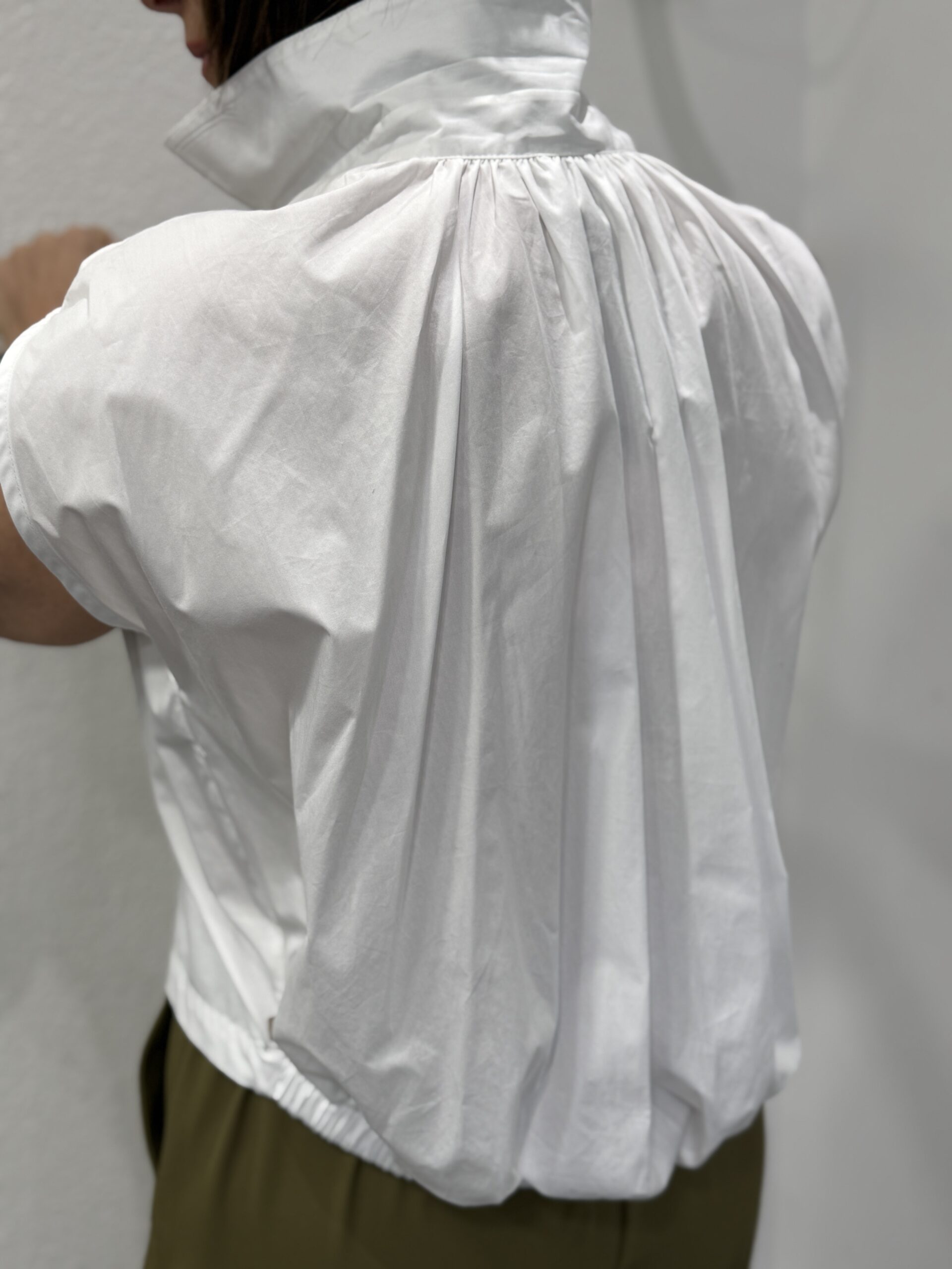 Chemise blanche au design moderne et structuré, idéale pour une silhouette élégante et contemporaine. Son volume ample et ses plis au dos créent un tombé fluide er sophistiqué. Le col classique et la patte de boutonnage apportent une touche intemporelle, tandis que la coupe sans manches renforce son caractère mode.