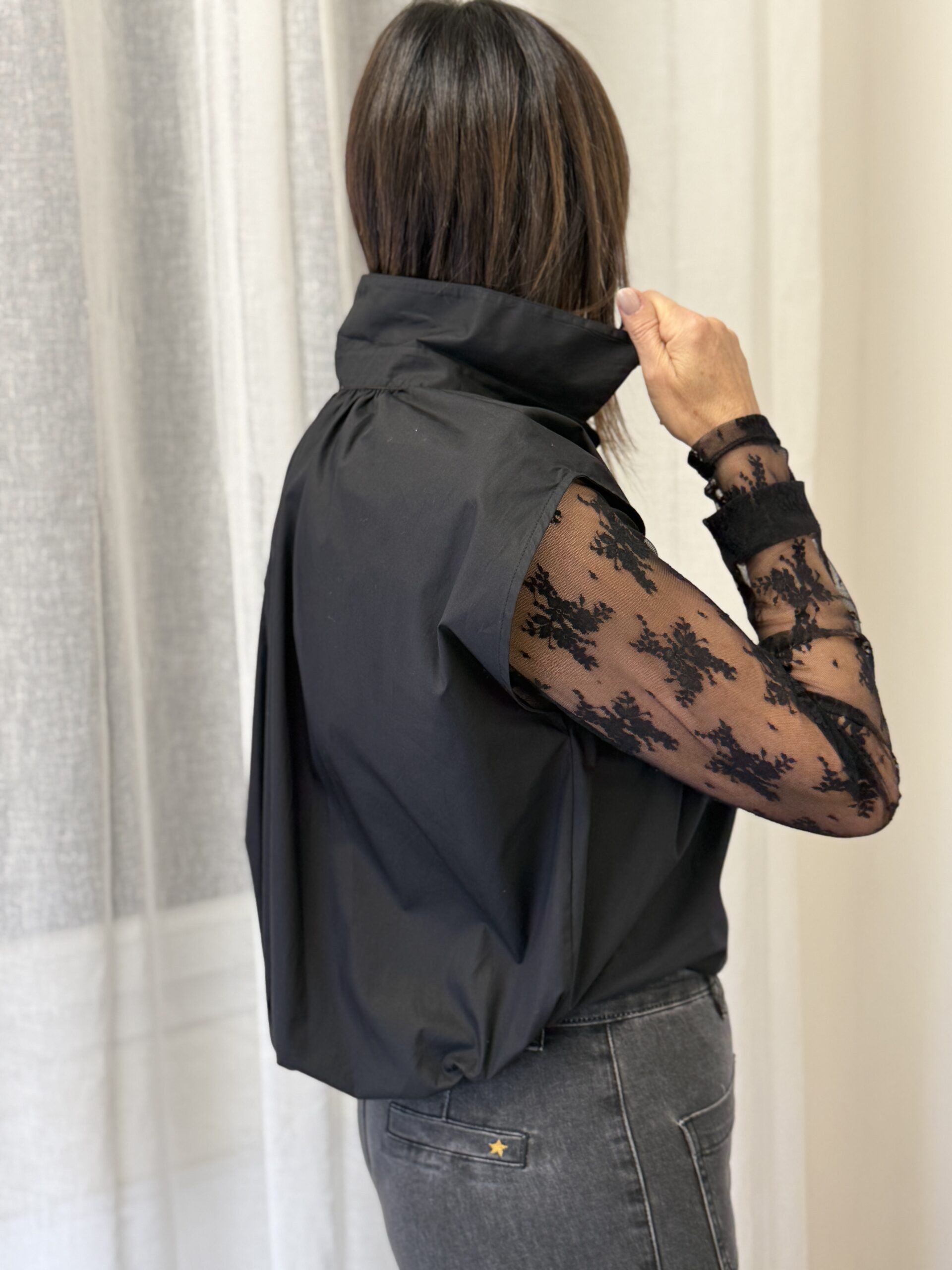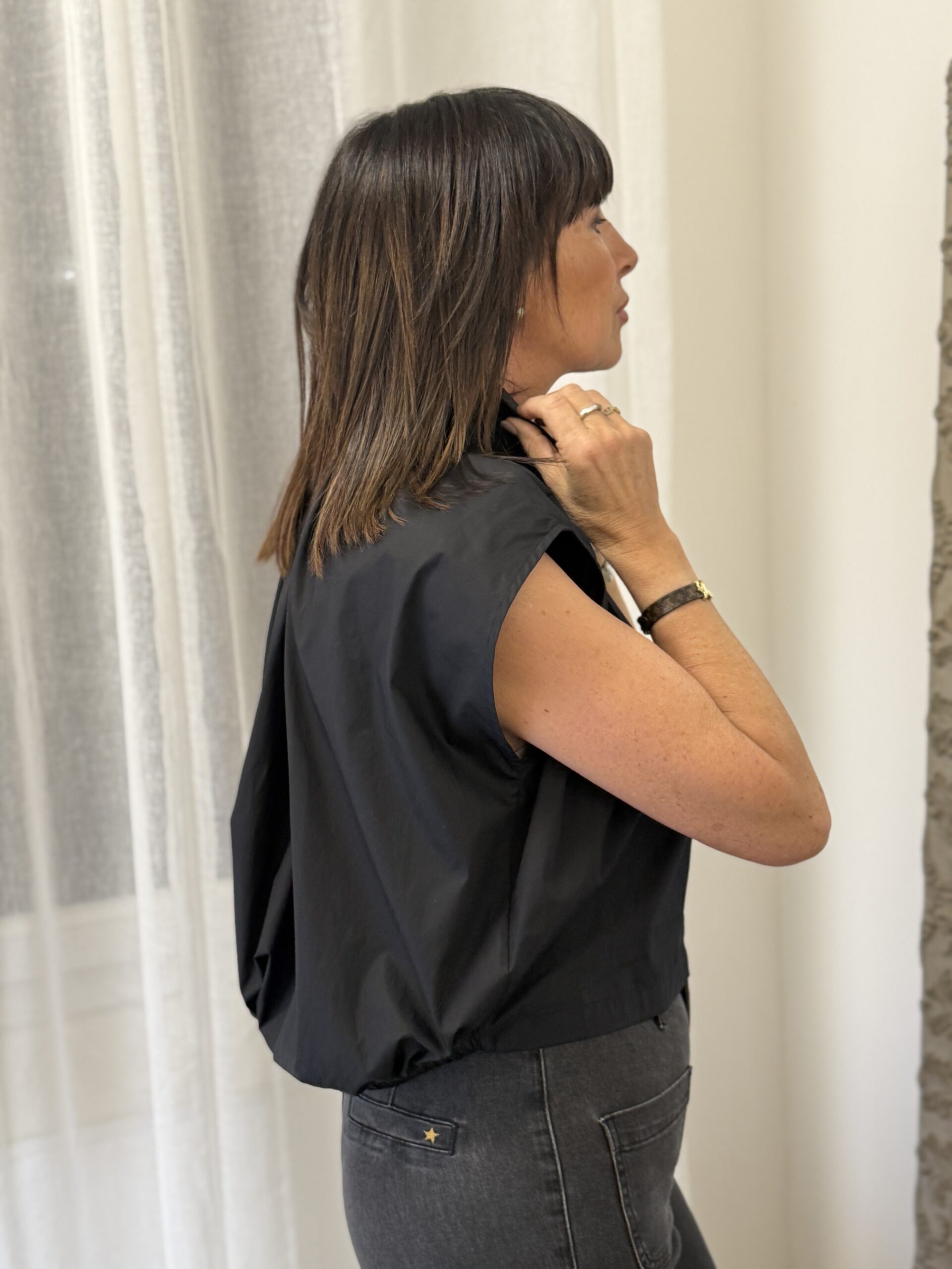 Chemise noire au design moderne et structuré, idéale pour une silhouette élégante et contemporaine. Son volume ample et ses plis au dos créent un tombé fluide er sophistiqué. Le col classique et la patte de boutonnage apportent une touche intemporelle, tandis que la coupe sans manches renforce son caractère mode.