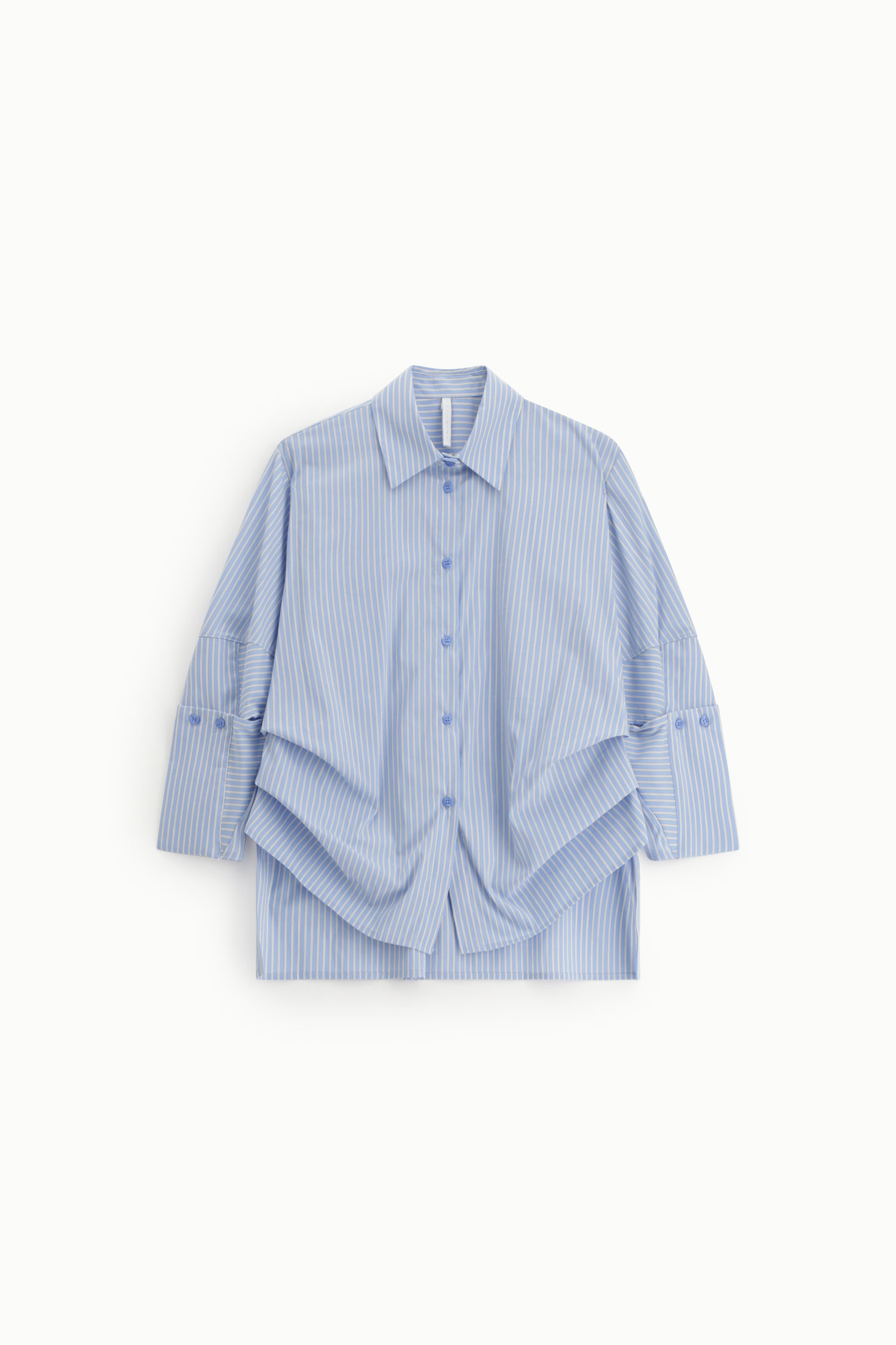 Chemise pour femme à rayures fine bleu ciel et blanches, à la coupe droite et légèrement ample.