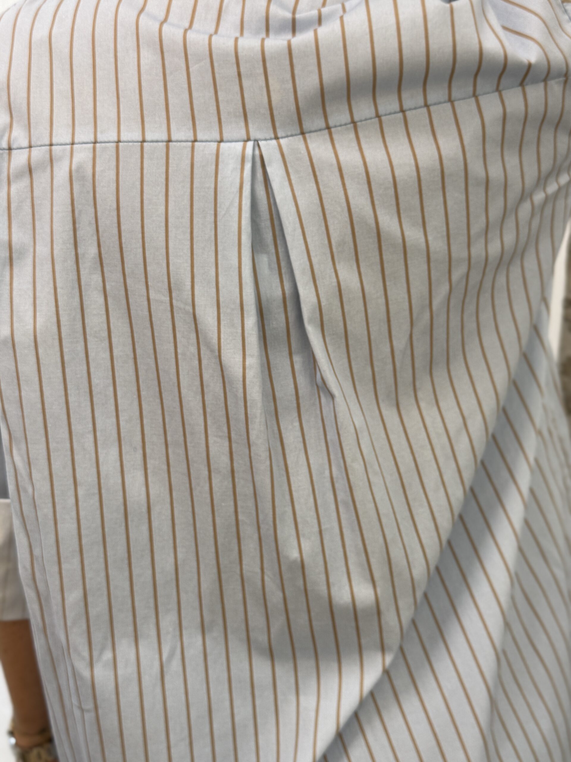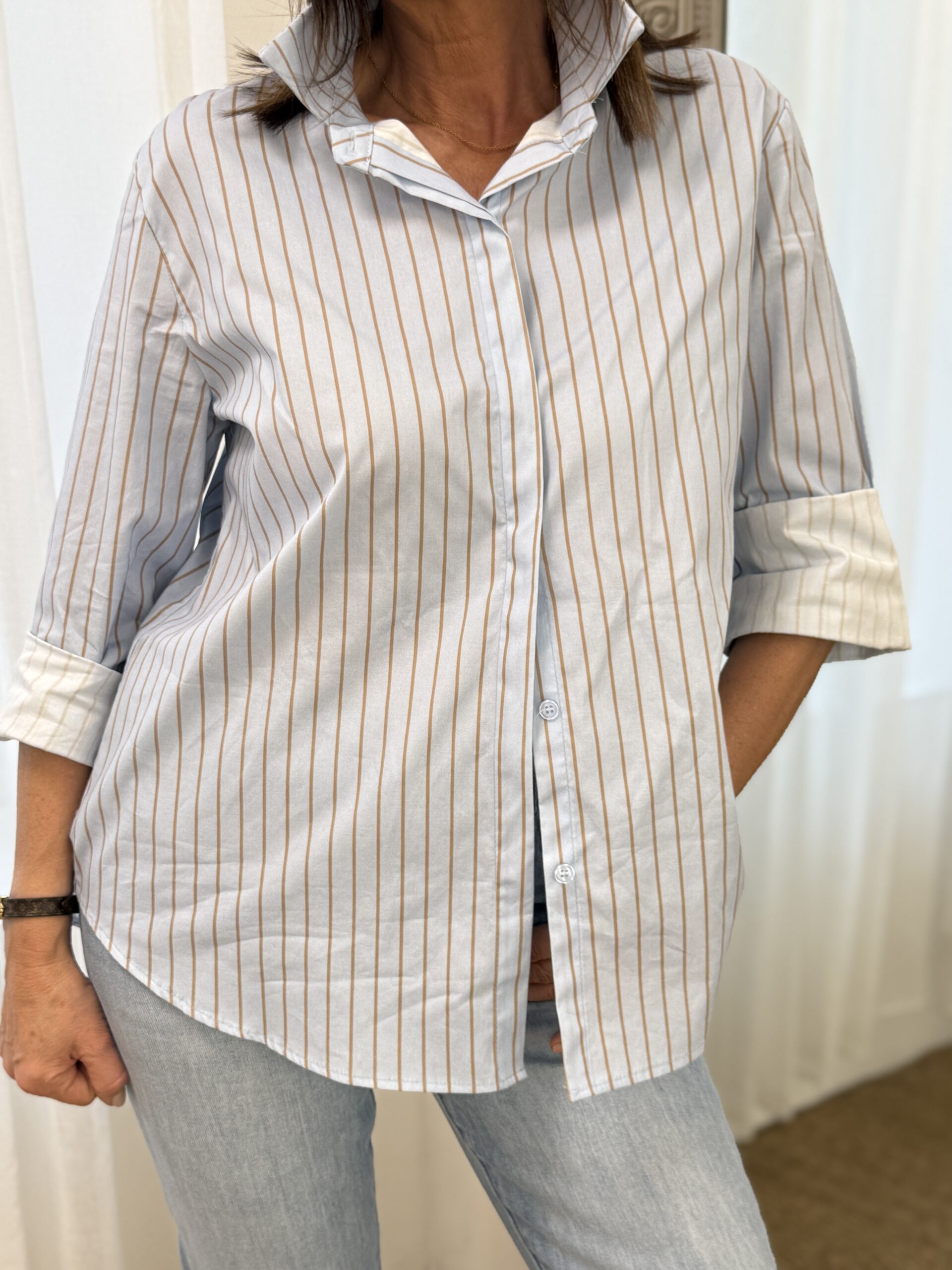 Chemise bleu clair à fines rayures verticales, parfaite pour un look moderne et effotless. Ca coupe oversize offre une silhouette fluide et confortable, idéale pour les tenues casual ou plus habillées.