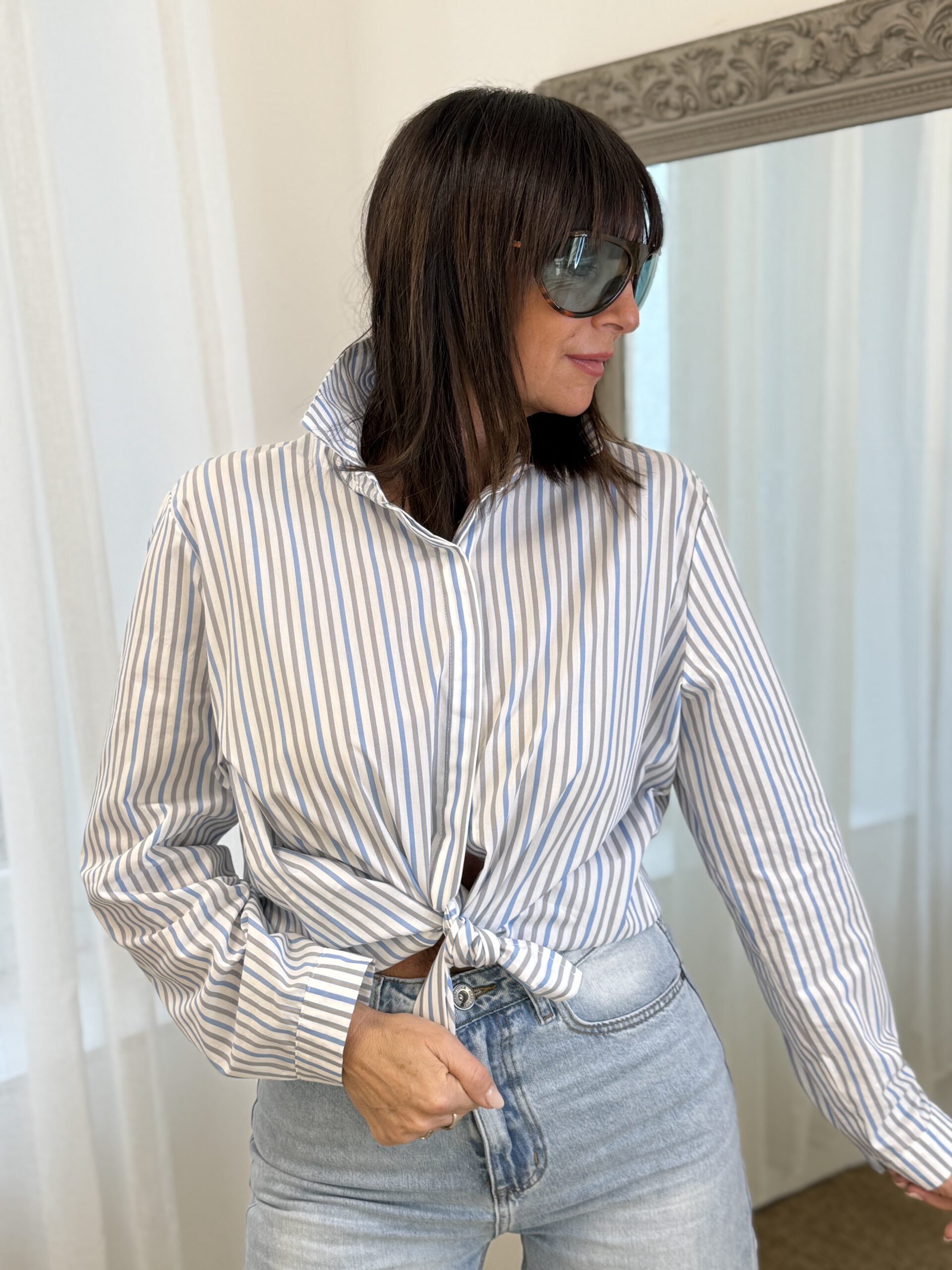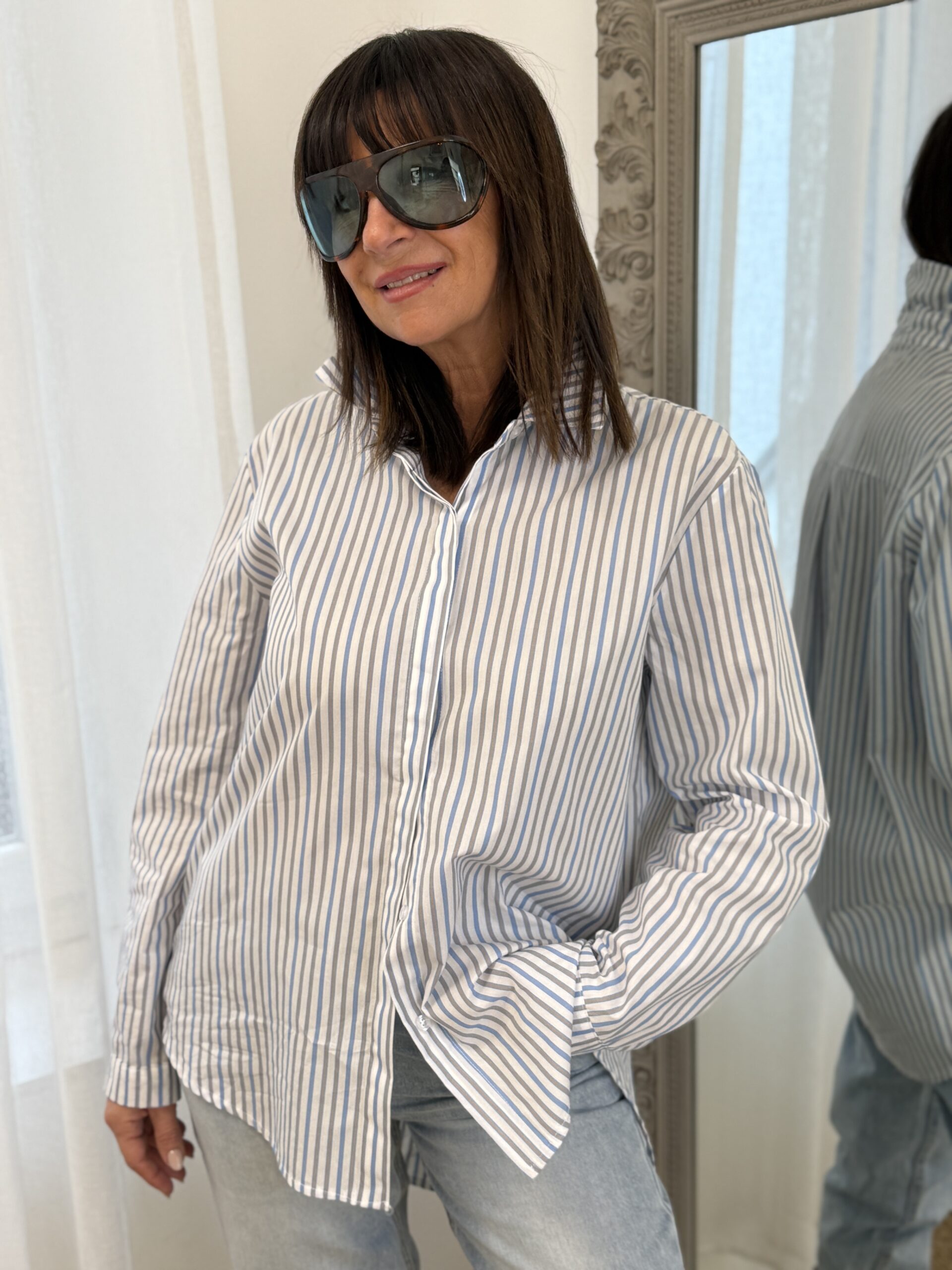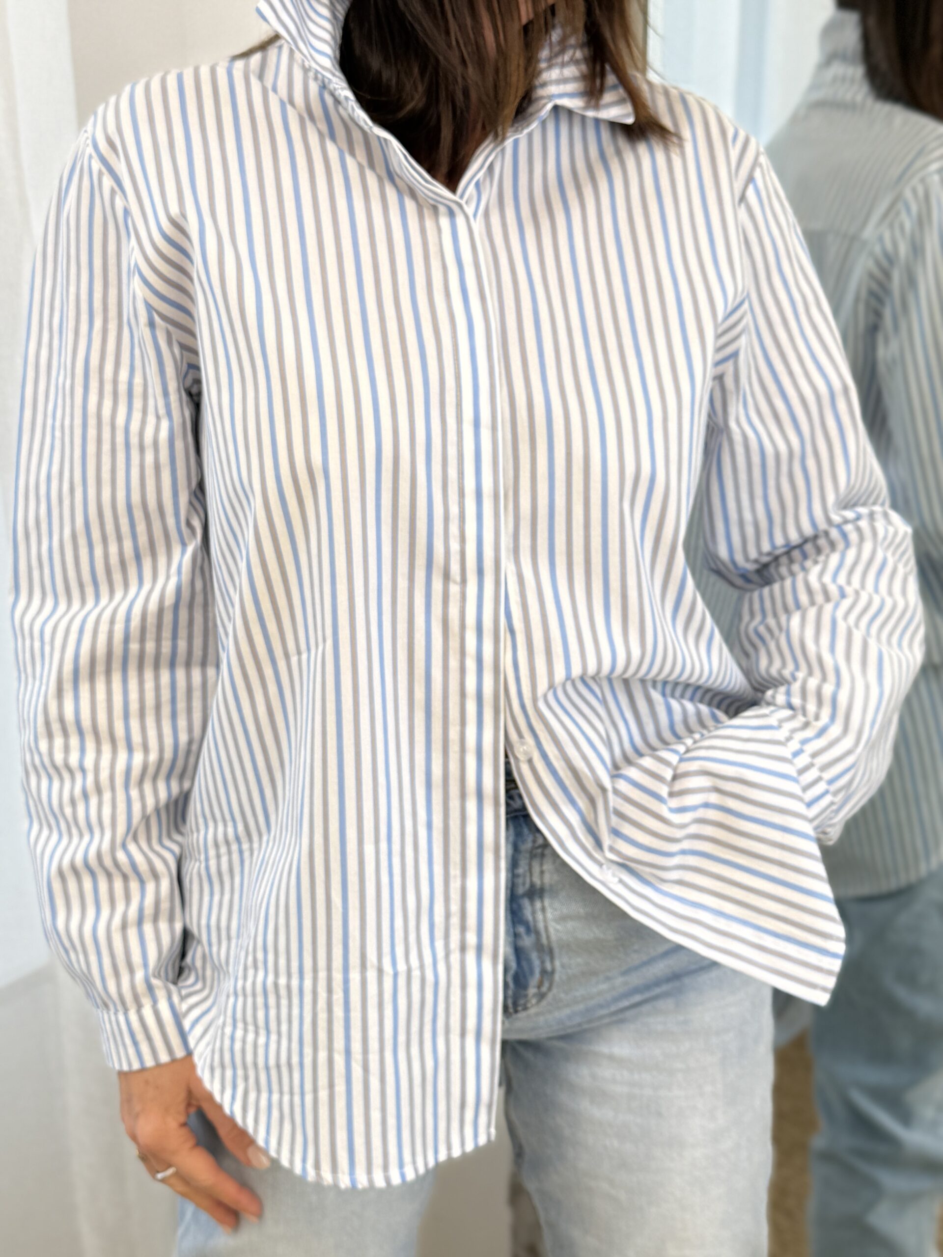 Chemise à rayures verticales bleu et beige, au design moderne et facile à porter. Ça coupe oversize crée une silhouette fluide et élégante, parfaite pour un look décontracté, mais soigné. Une pièce polyvalente du vestiaire quotidien.