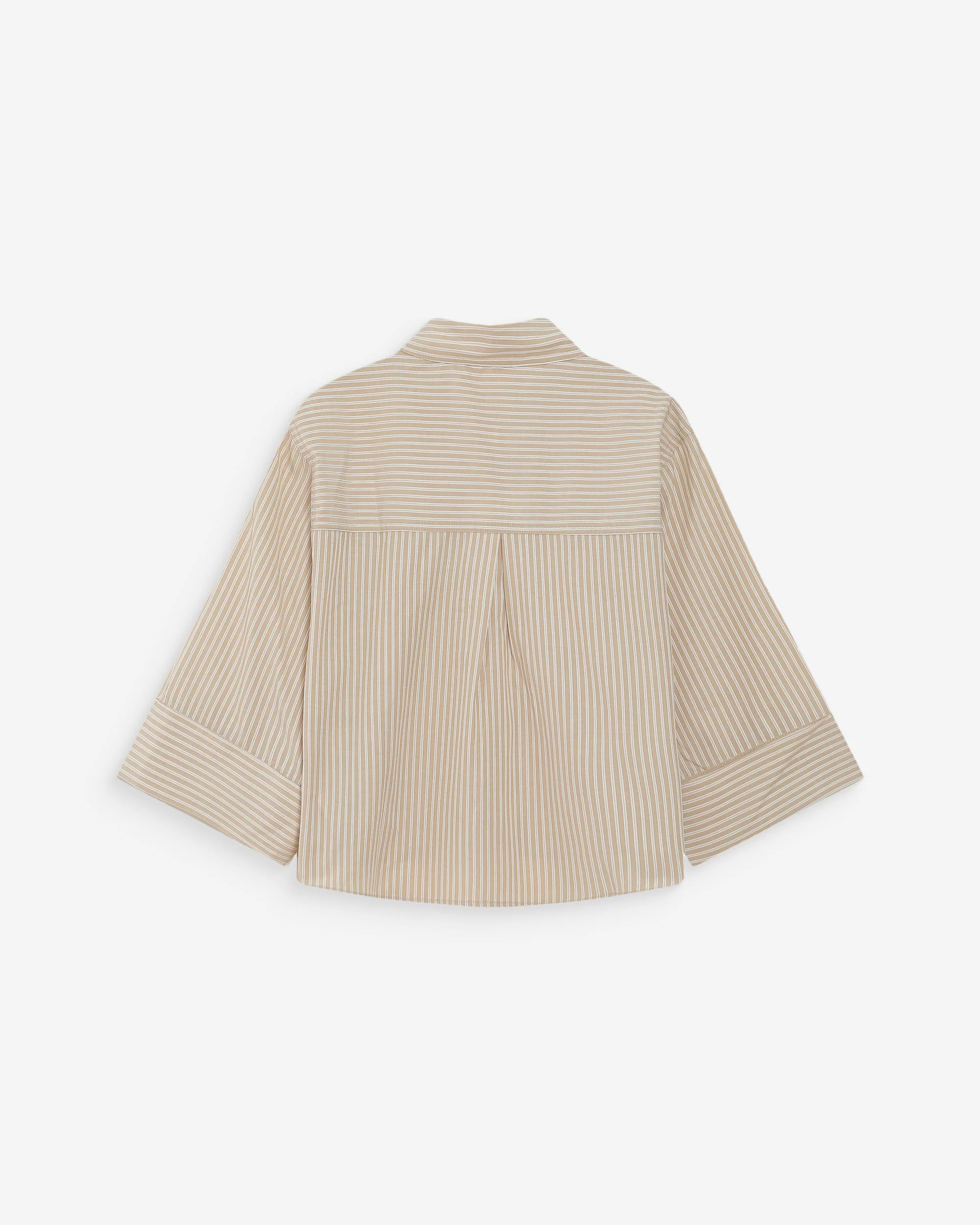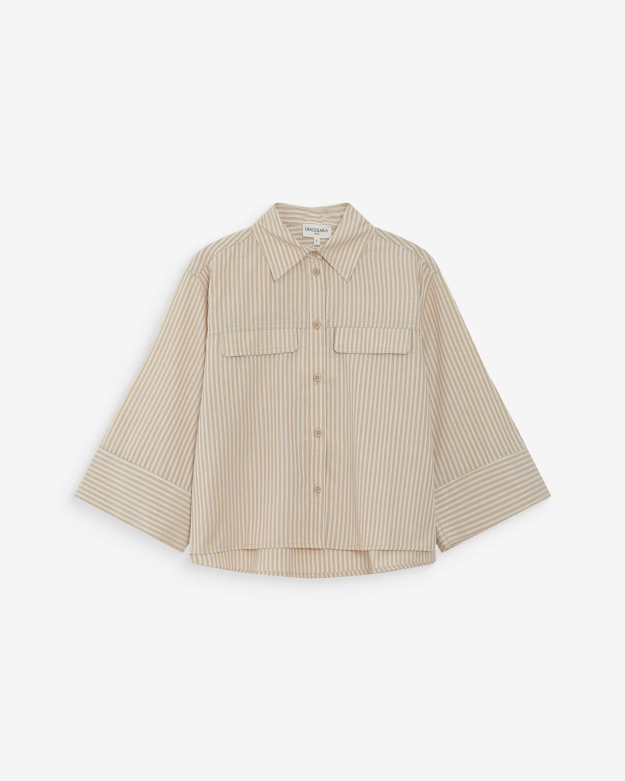 La chemise courte à rayure sable et blanc « Voice » dévoile une coupe courte et droite, les manches 3/4 se terminent par de larges poignets. Le col chemise classique et les poches à rabats sur la poitrine offrent une revisite moderne de la chemise de travail traditionnelle. Les rayures verticales allongent visuellement la silhouette.