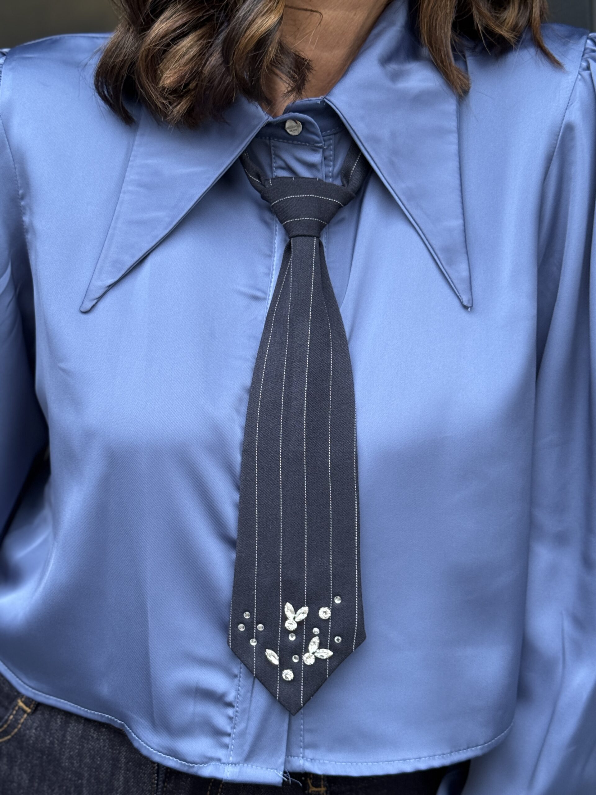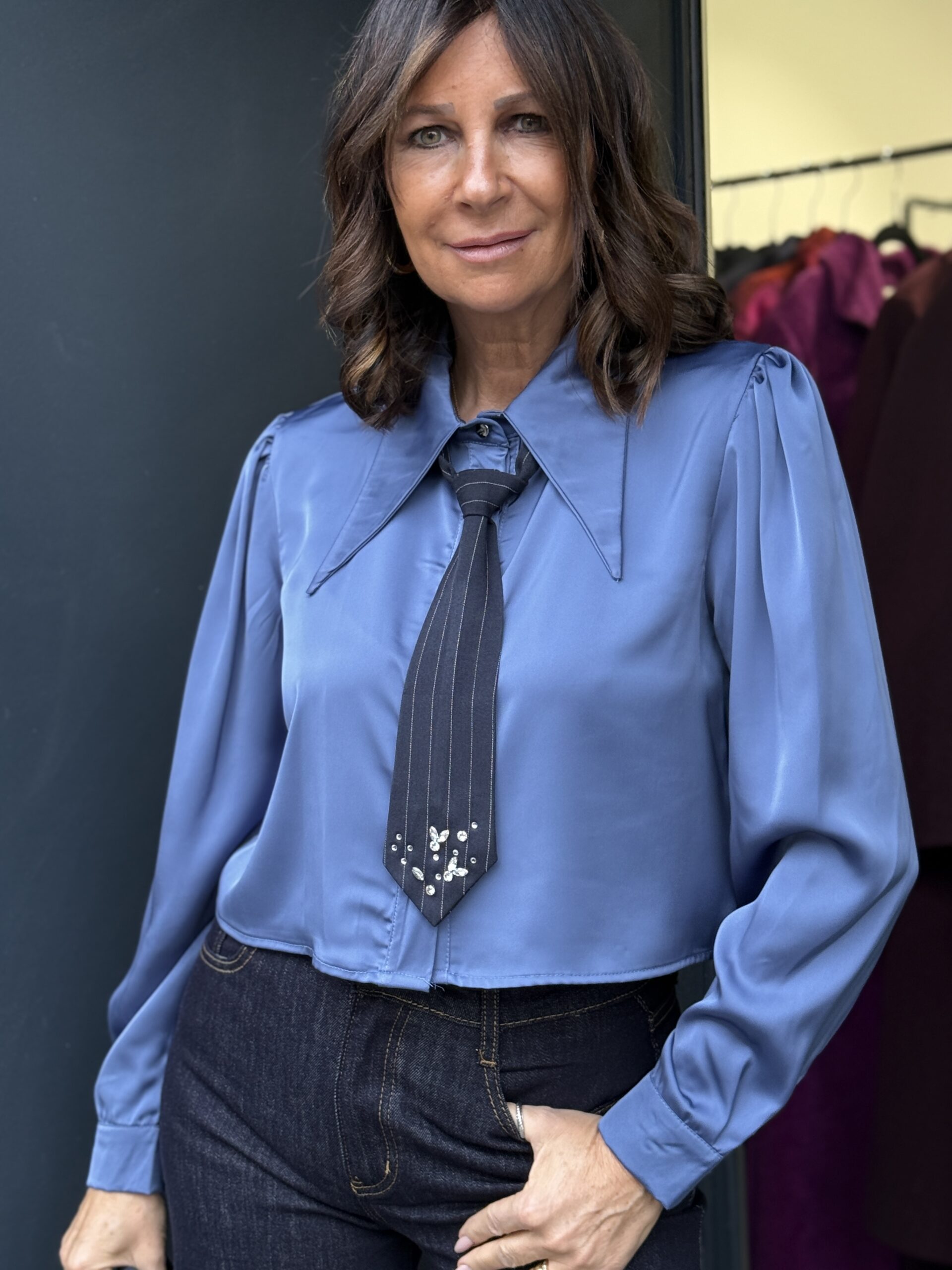 Élégante et audacieuse, cette chemise bleu acier revisite les codes du vestiaire féminin avec une touche rétro assumée.