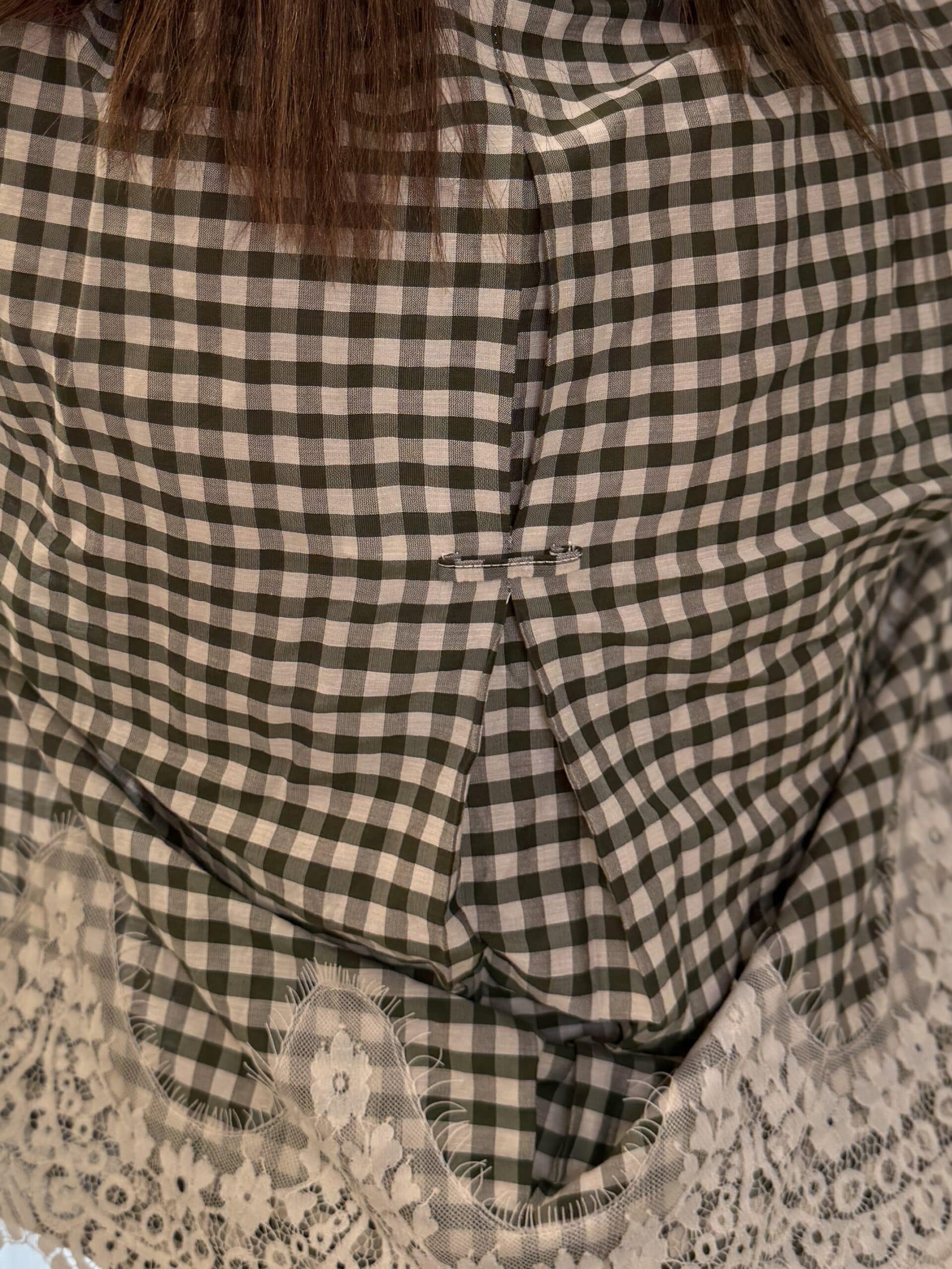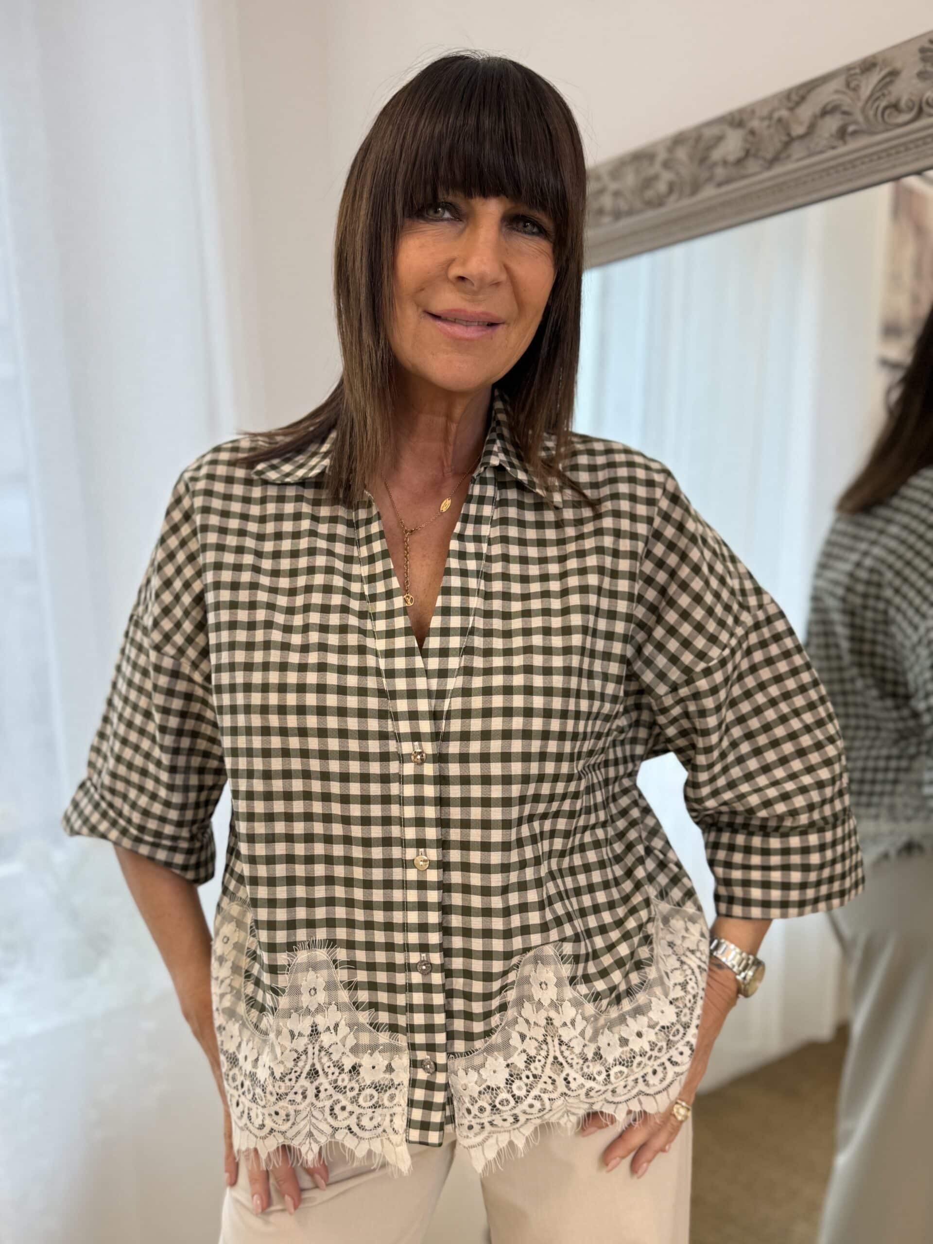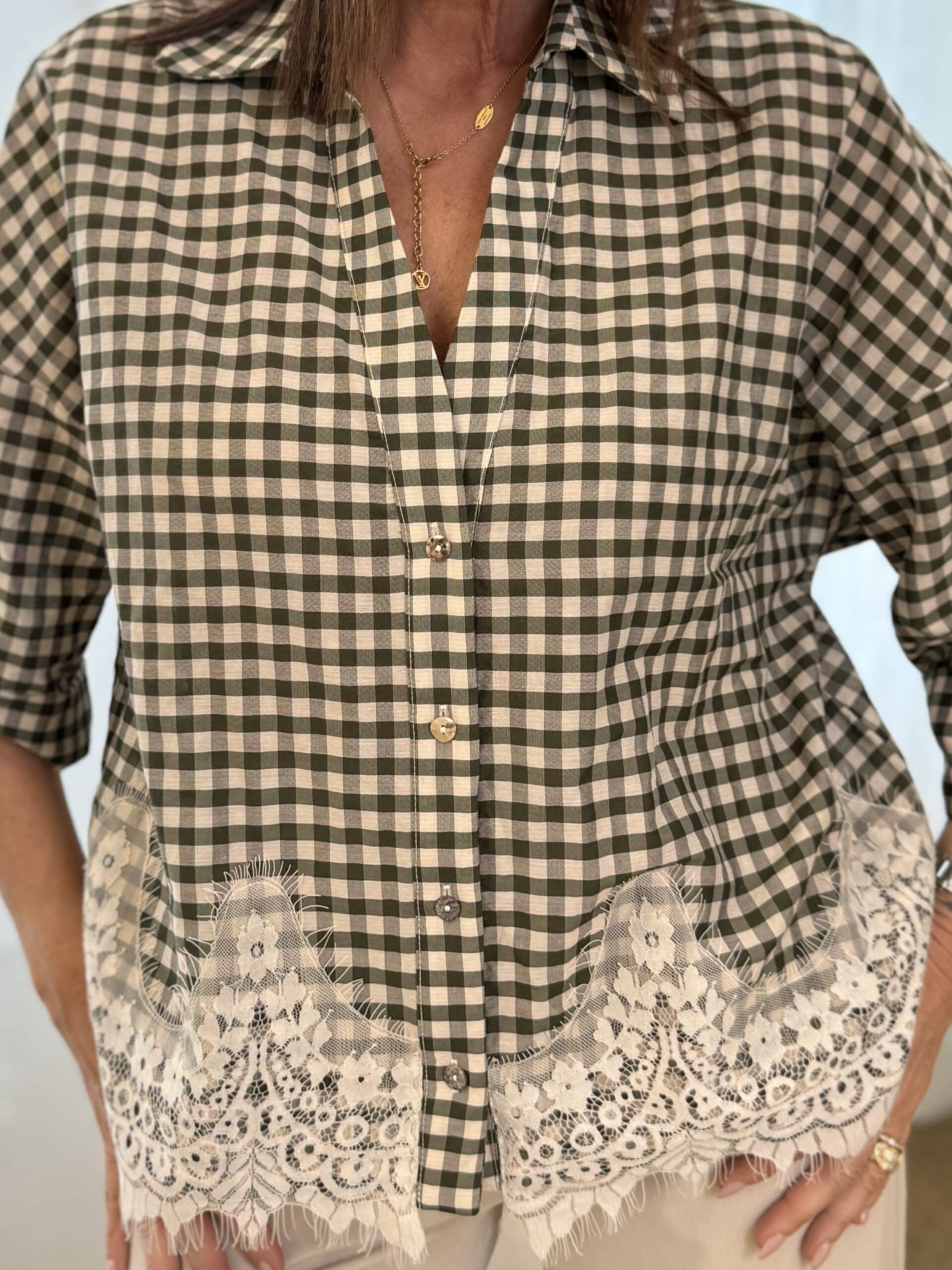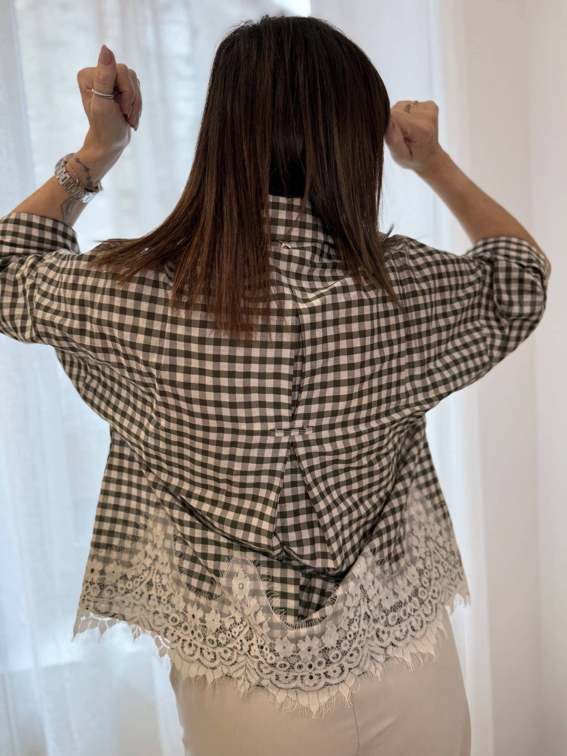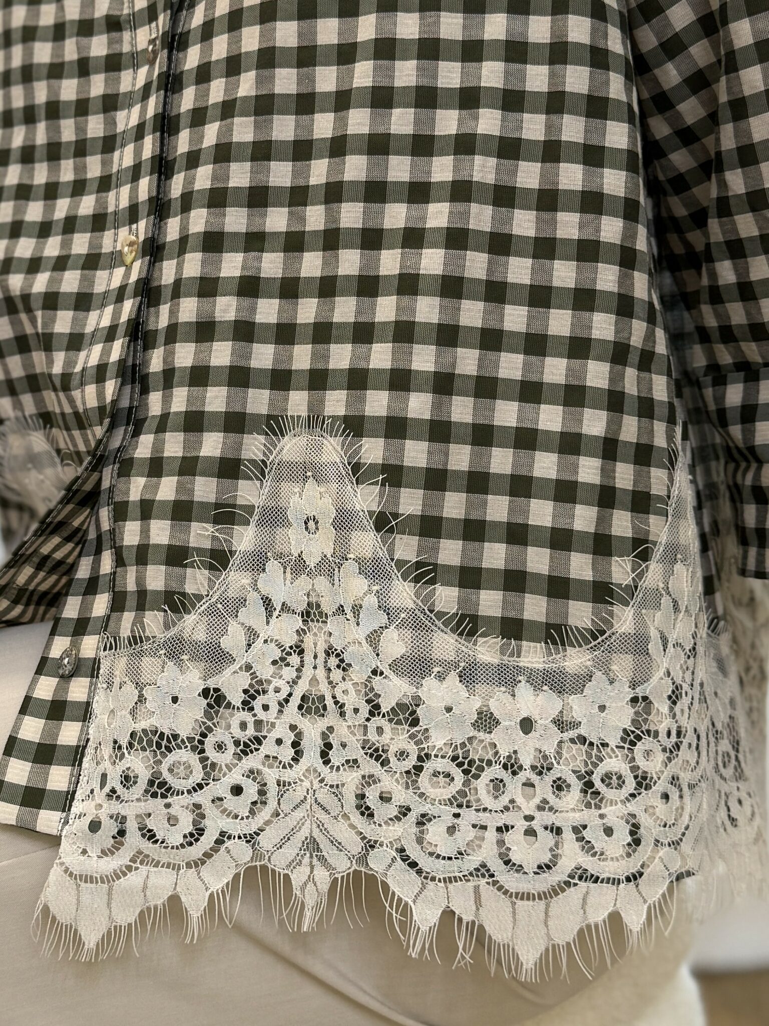 Chemise à motif vert et écru avec manches courtes et col classique. Le bas est orné d’un empiècement en dentelle florale, qui apporte une touche féminine et originale.