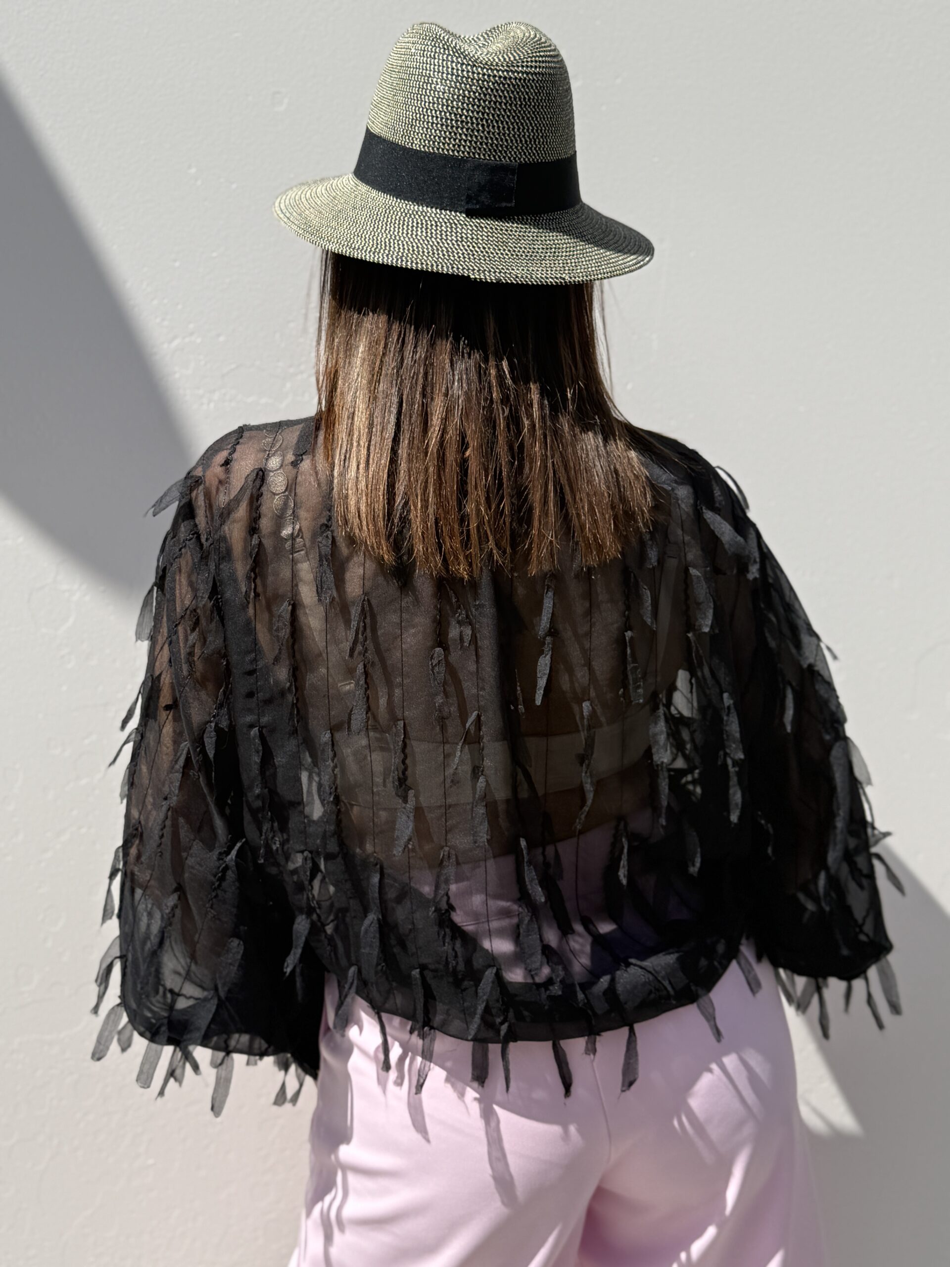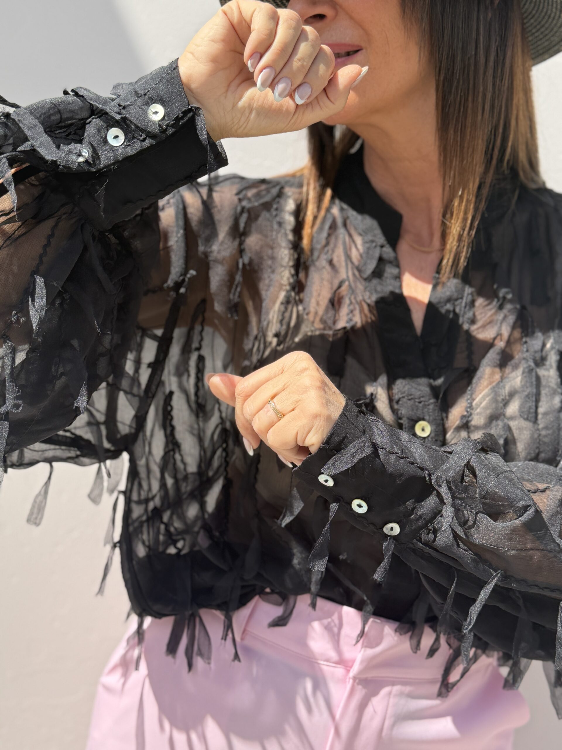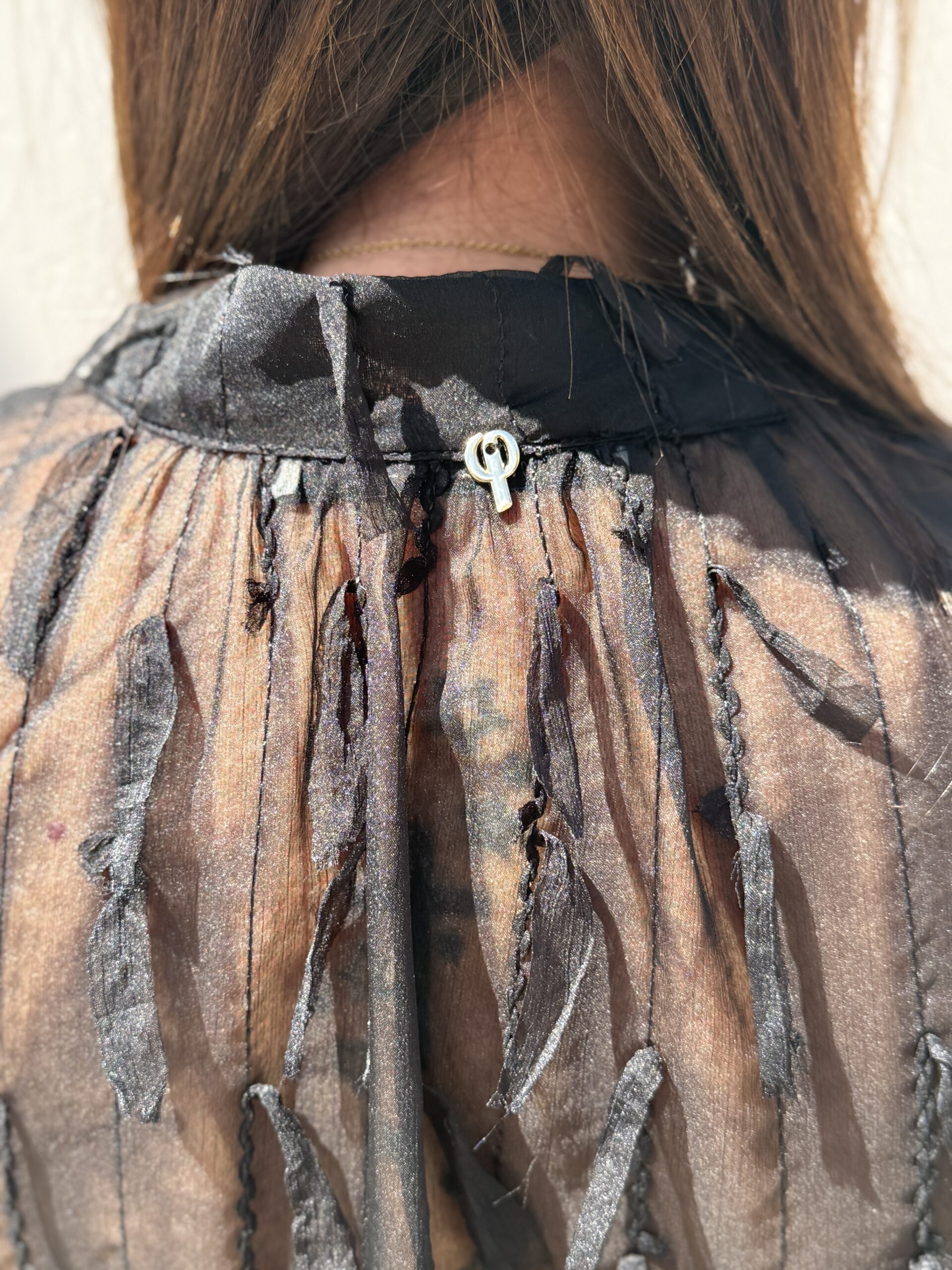 Délicate et aérienne, cette chemise en voile texturée séduit par son jeu de transparence et ses détails en relief façon plumes.