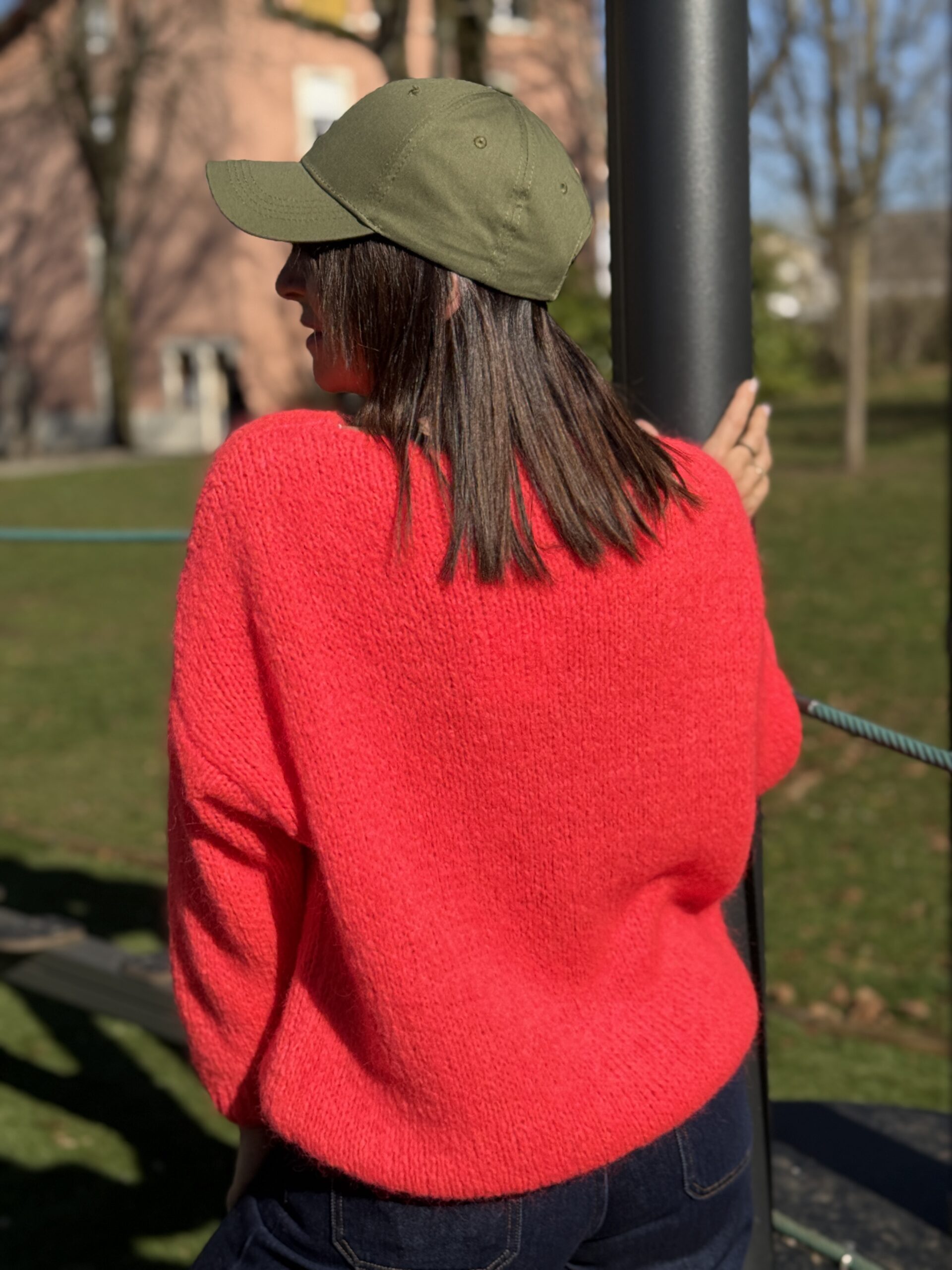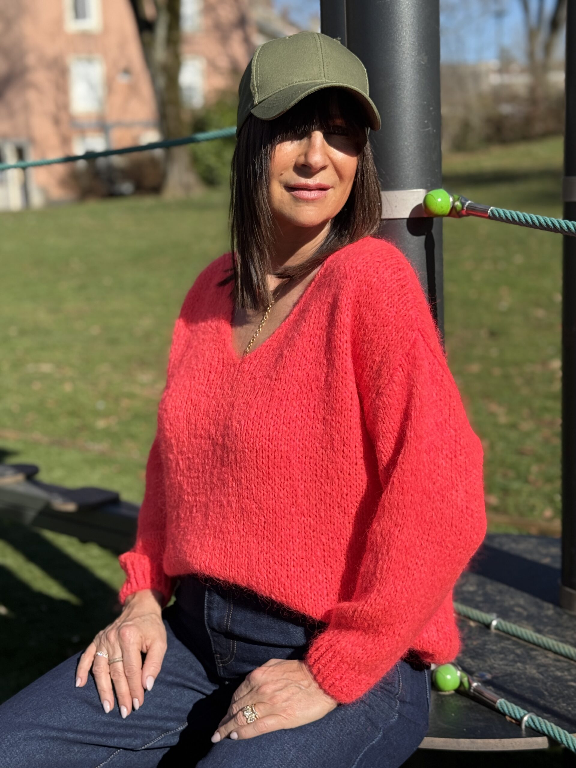 Craquez pour ce pull en maille douce au coloris néon corail vibrant, parfait pour dynamiser vos tenues du quotidien.