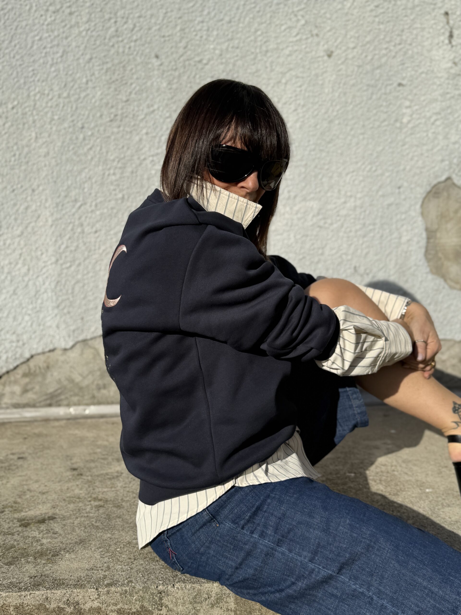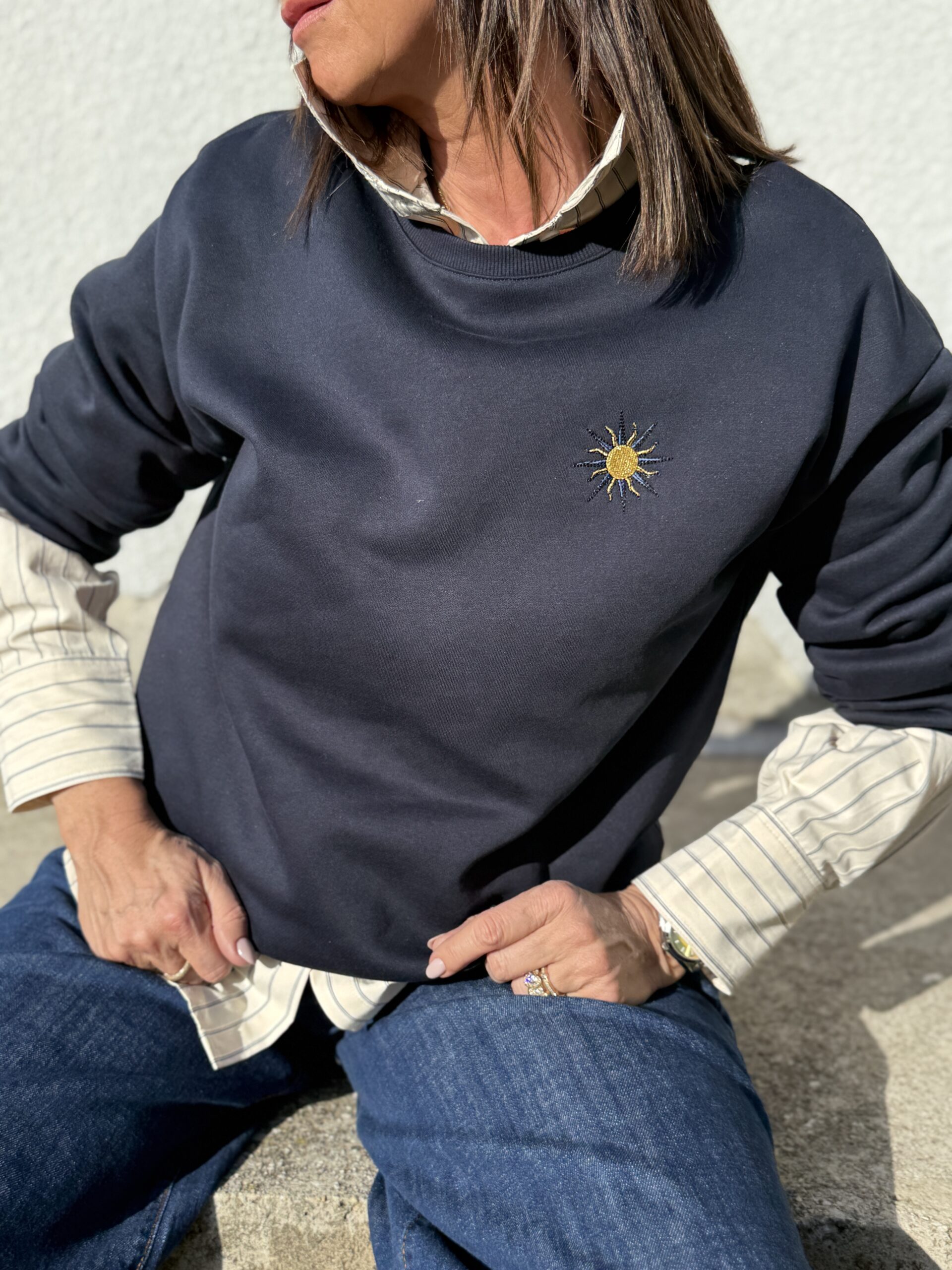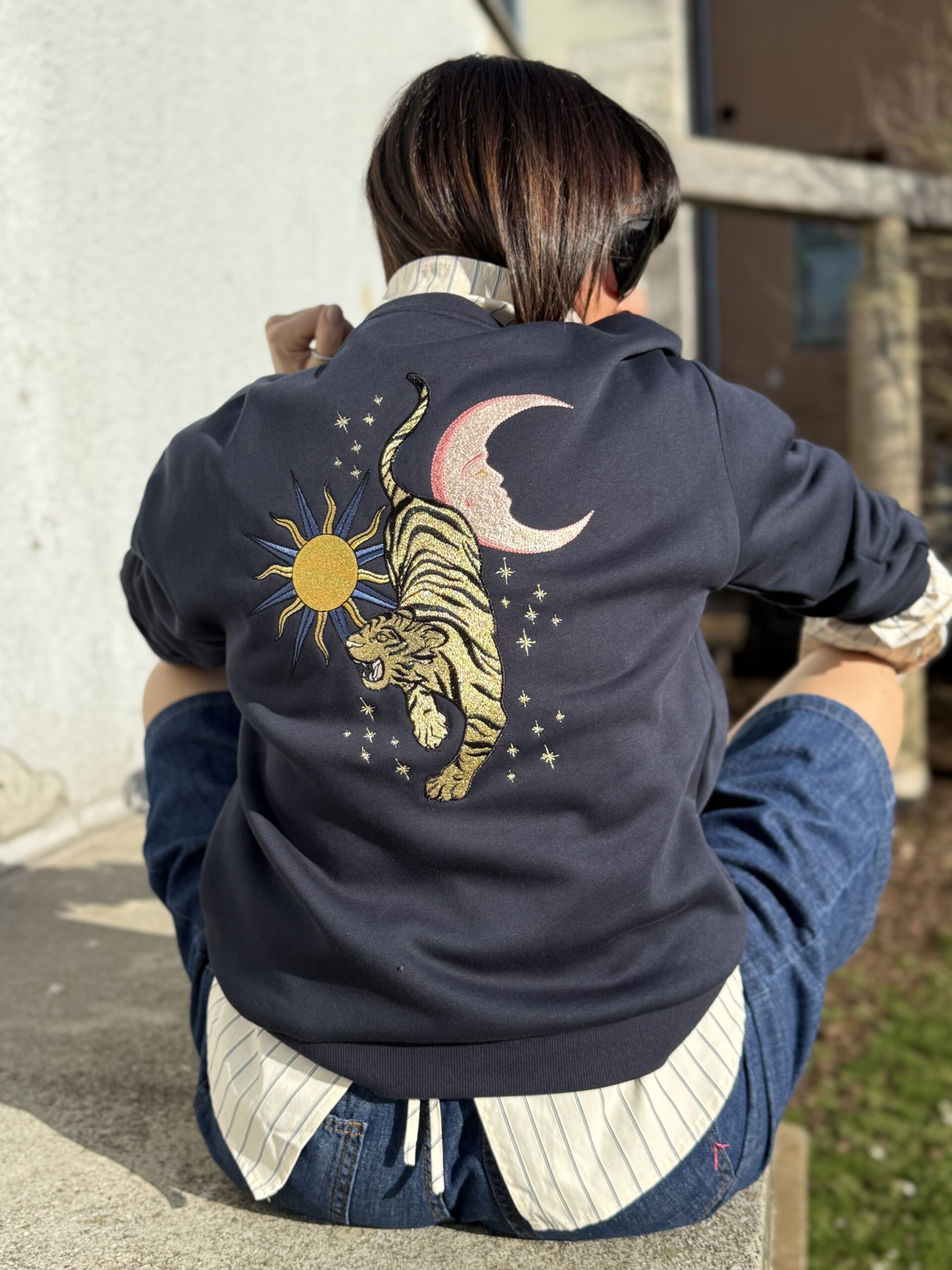 Tiger, le sweat en molleton chiné marine, orné d’une broderie tigre devant et dans le dos, avec finitions bord-côte !