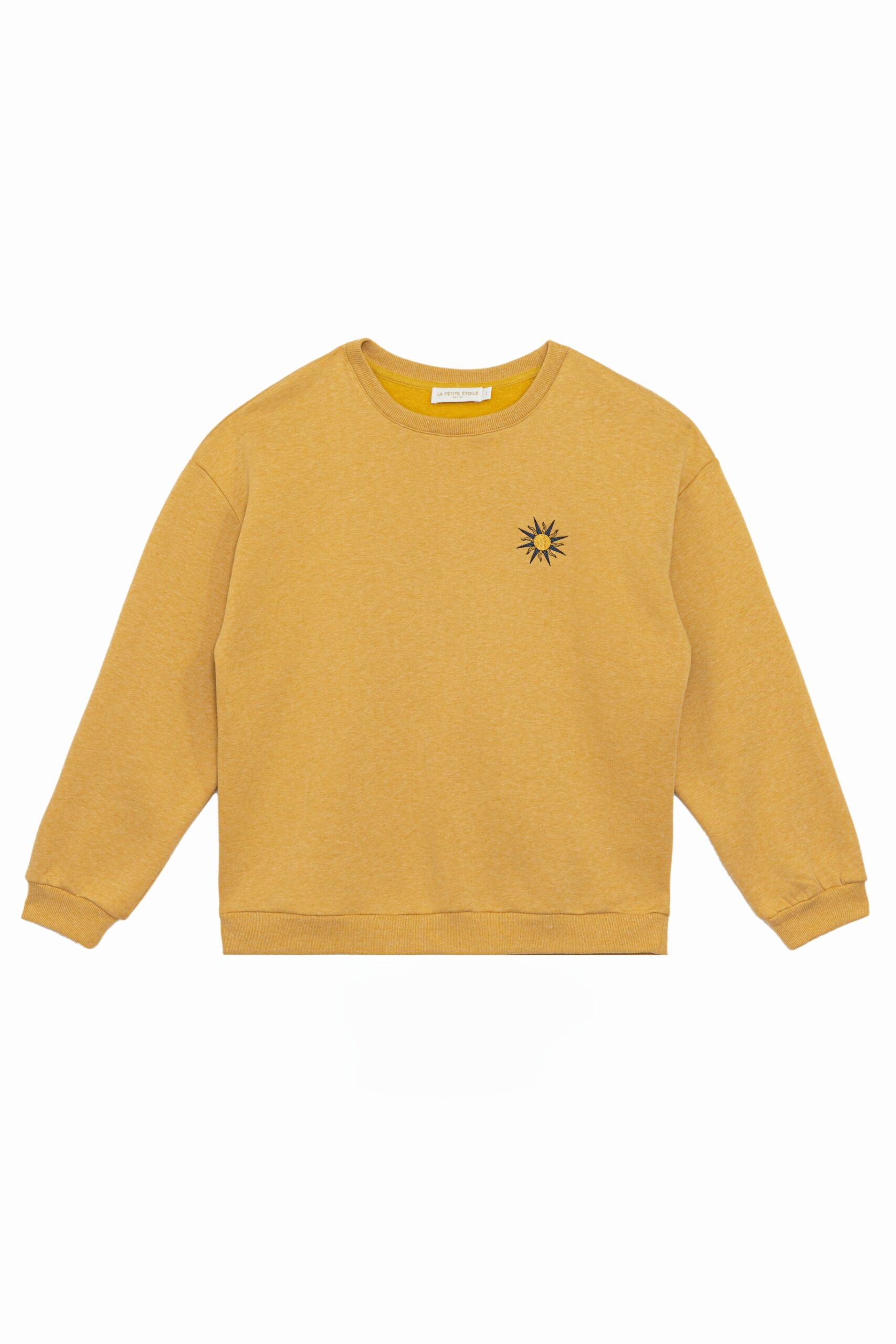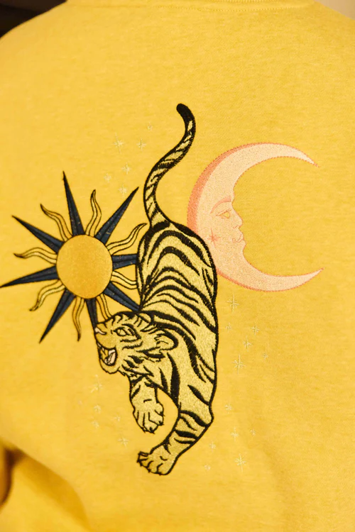 Tiger, le sweat en molleton chiné ocre, orné d’une broderie tigre devant et dans le dos, avec finitions bord-côte !