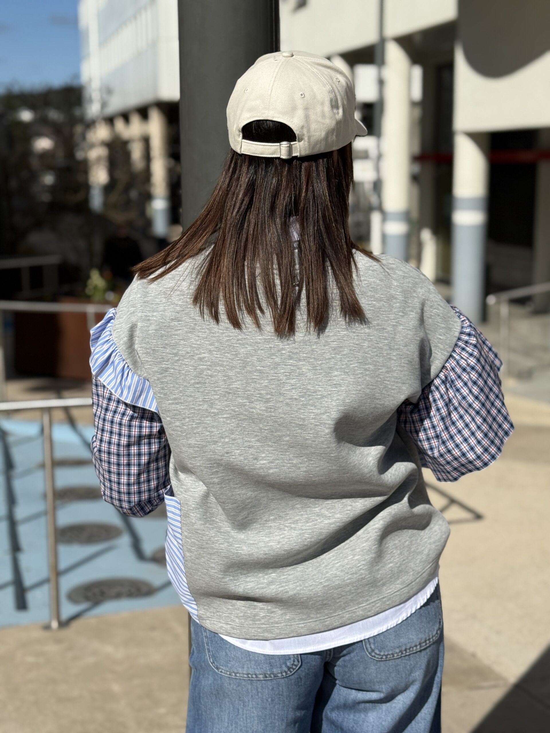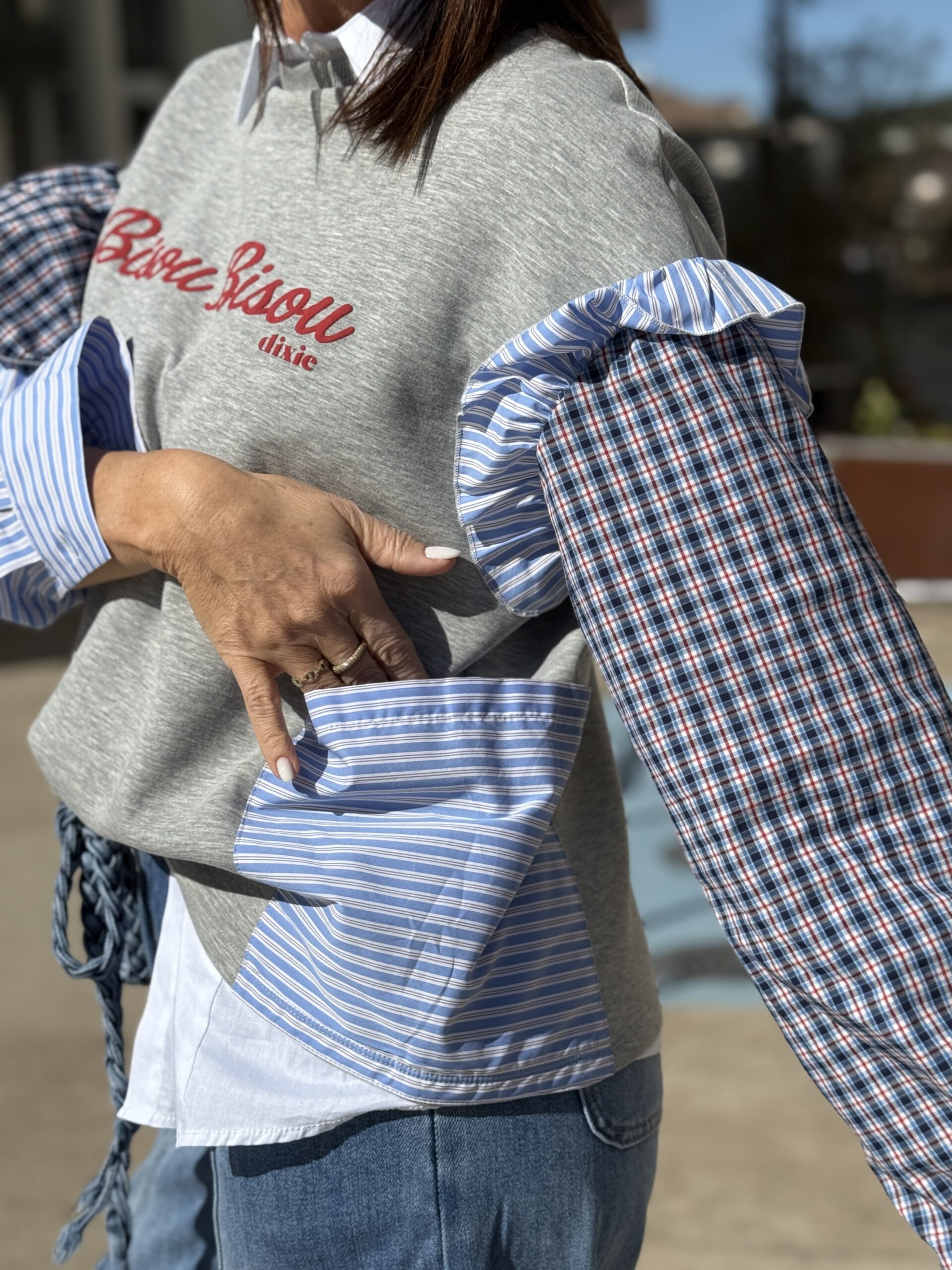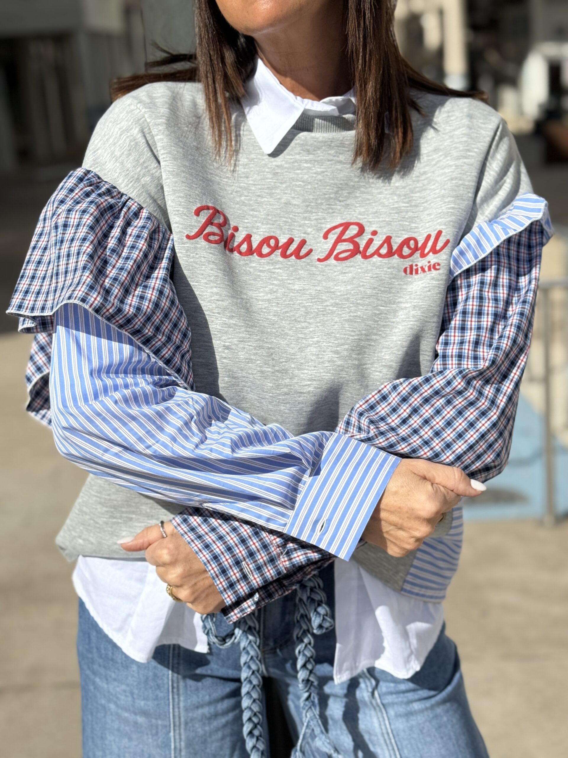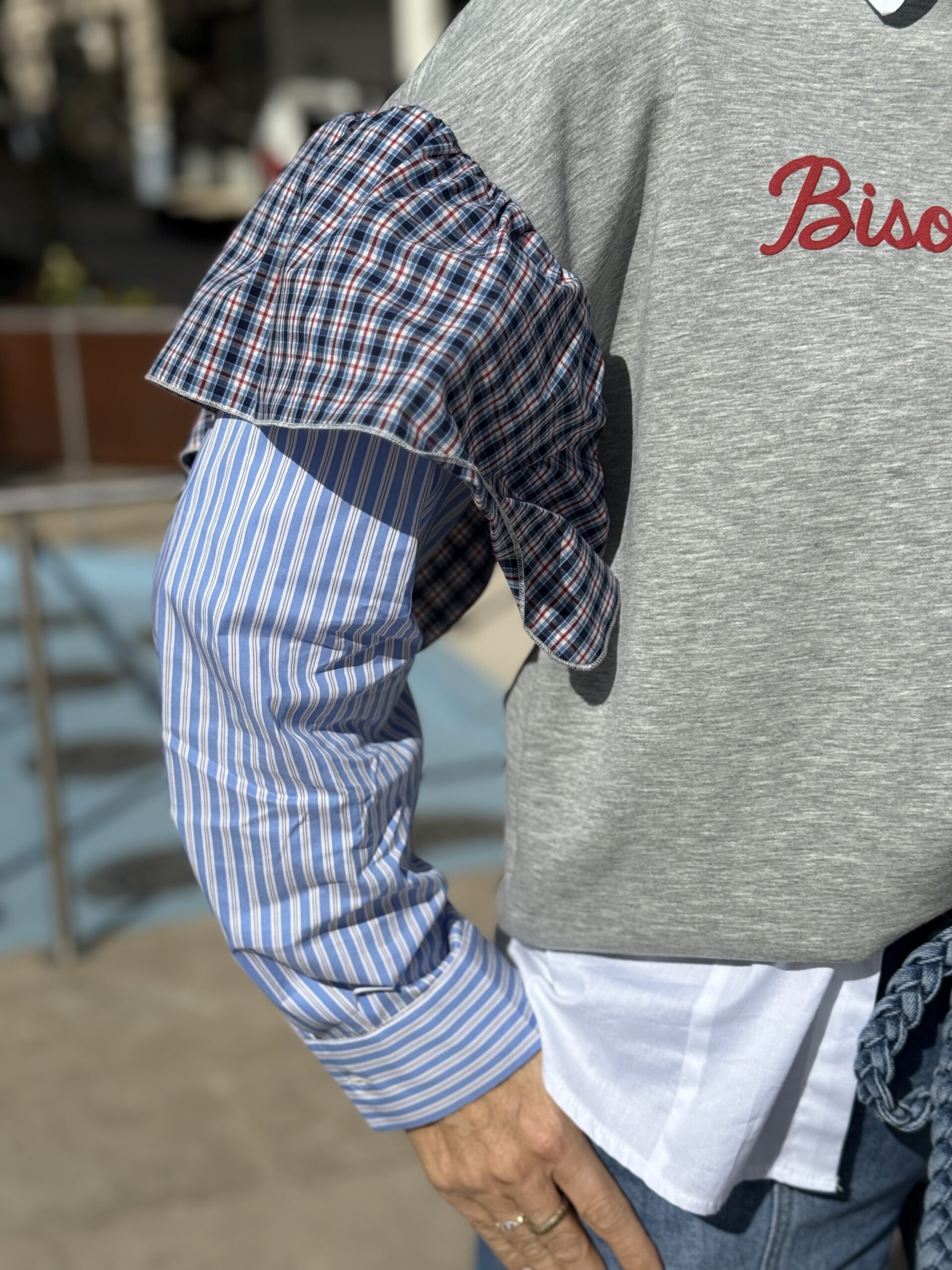 Sweat-shirt au design créatif et résolument mode, combinant l’esprit casual du molleton et l’élégance de détails chemise. Une pièce originale qui attire immédiatement le regard.