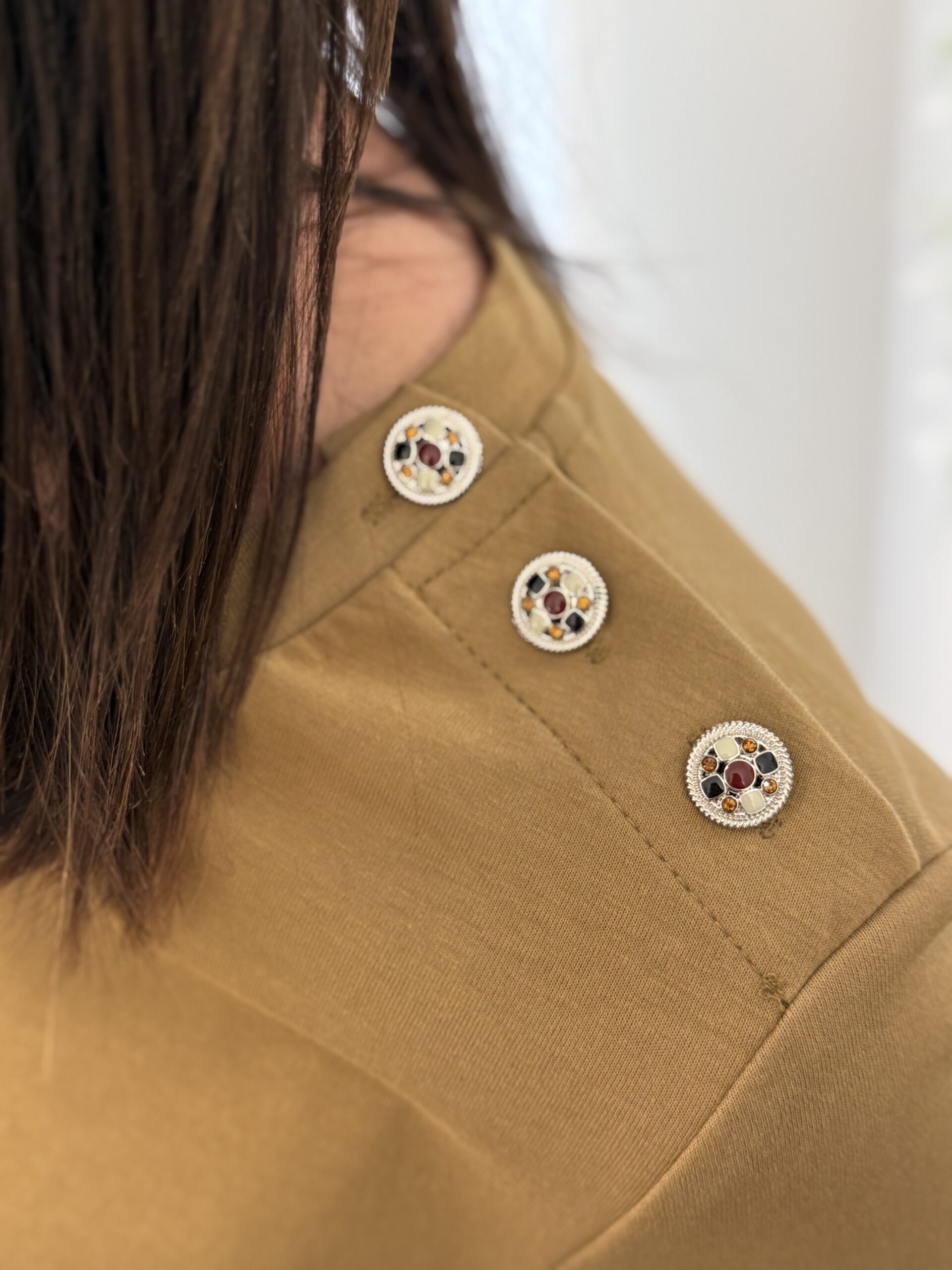 T-shirt au style minimaliste et élégant, agrémenté de boutons décoratifs à l’épaule pour une touche chic et raffinée. Sa matière douce et légèrement extensible assure confort aisance au quotidien.